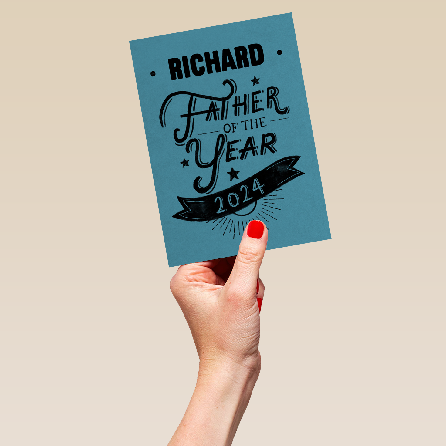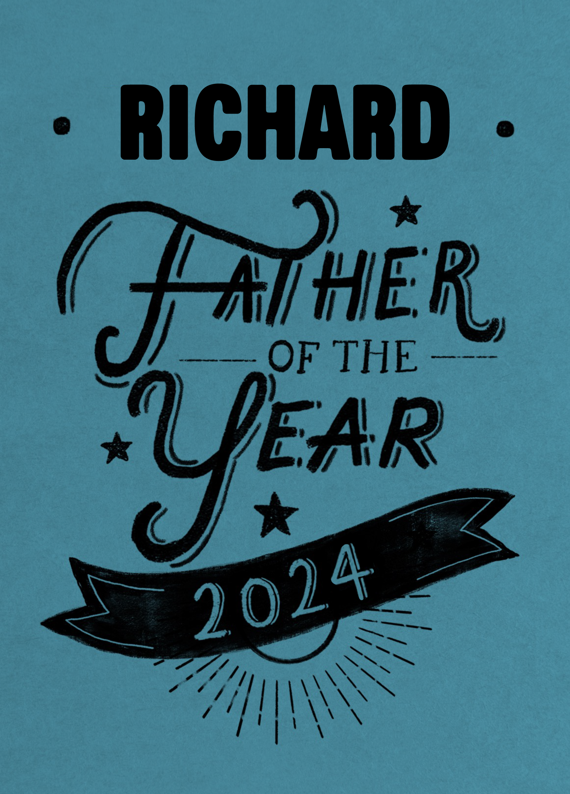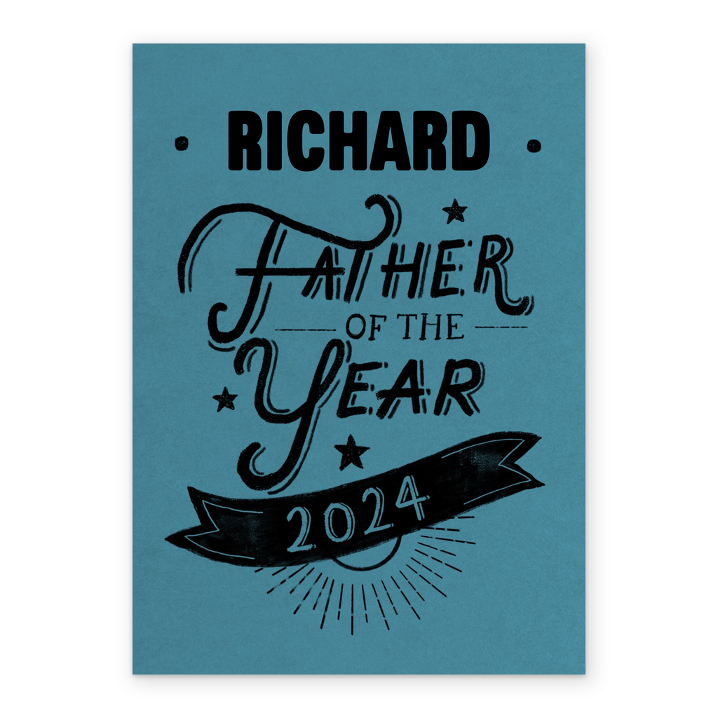 Printed on premium-quality board, this card features stylised black text with stars and a banner on a blue background, with the message 'Father Of The Year 2025', space to personalise a name, and comes complete with a co-ordinating white envelope.