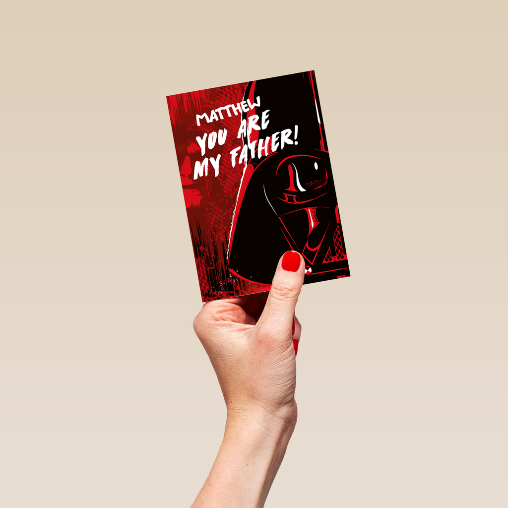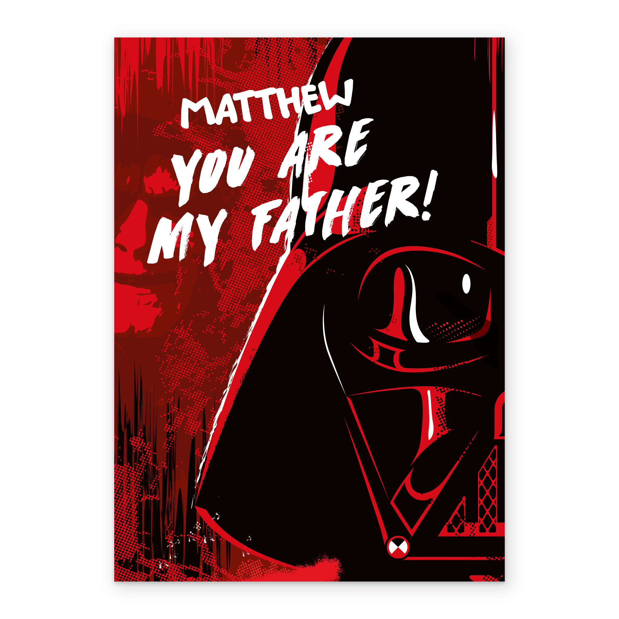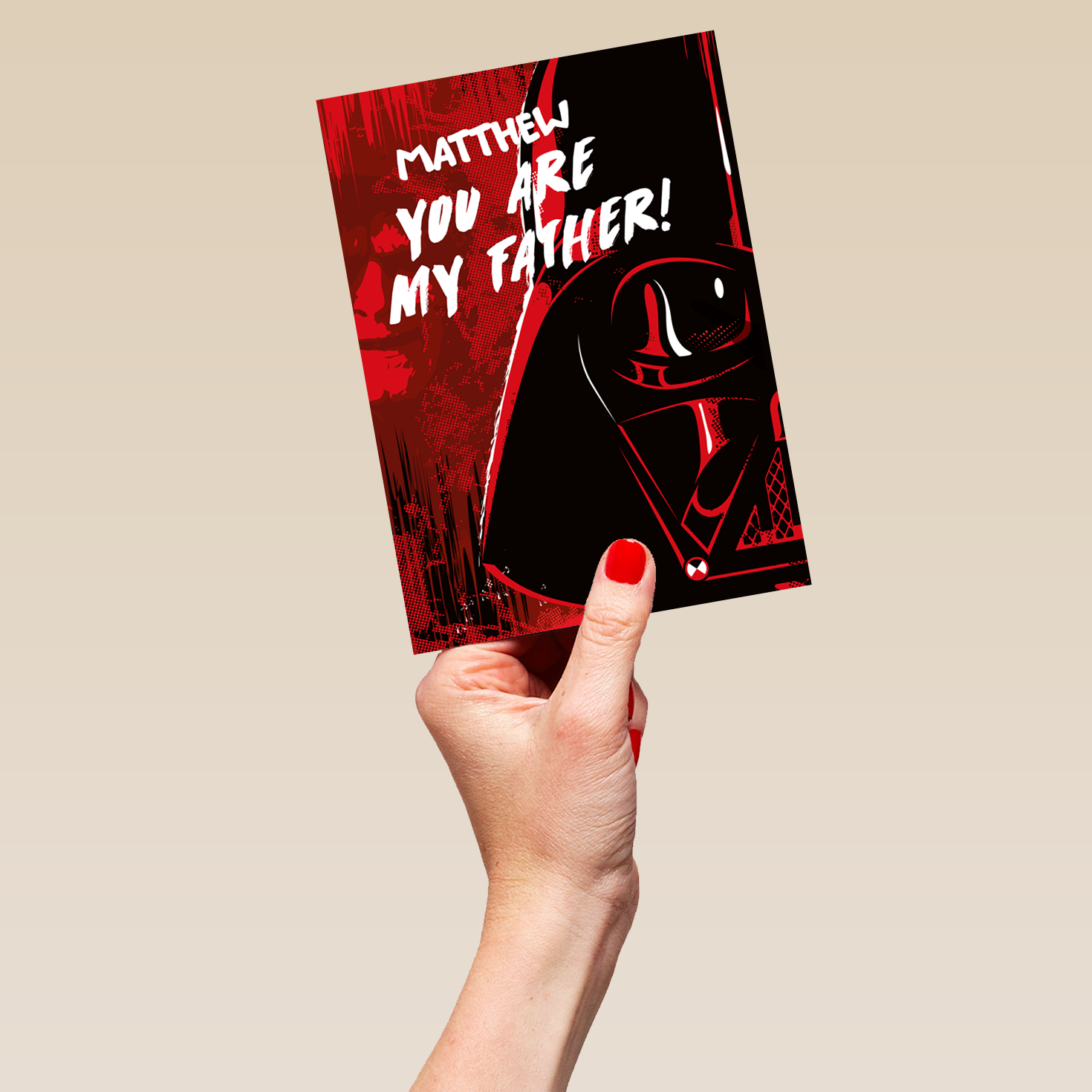 Printed on premium-quality board, this card features Half of Darth Vader's face from Star Wars™ with a red background, with the message '[NAME] You Are My Father!', space to personalise a name, and comes complete with a co-ordinating white envelope.