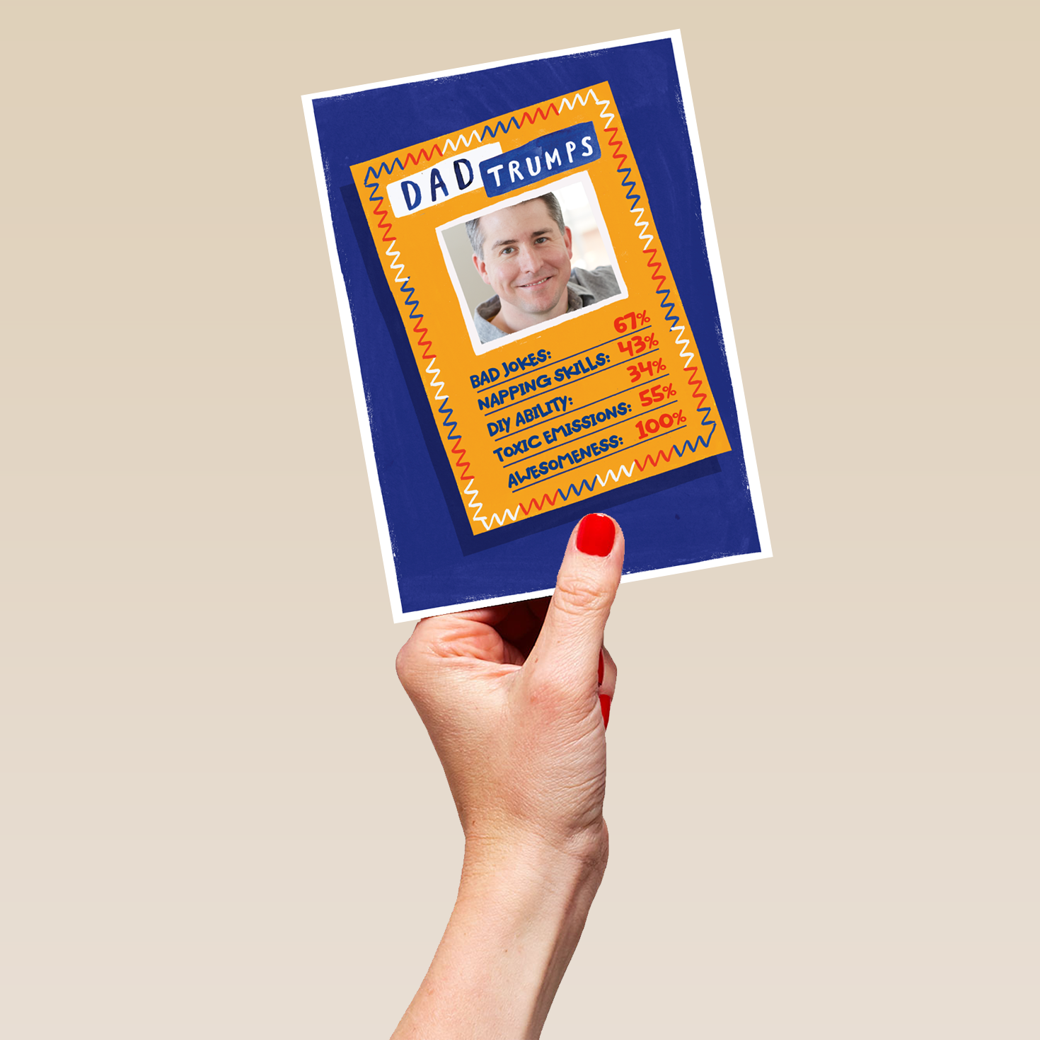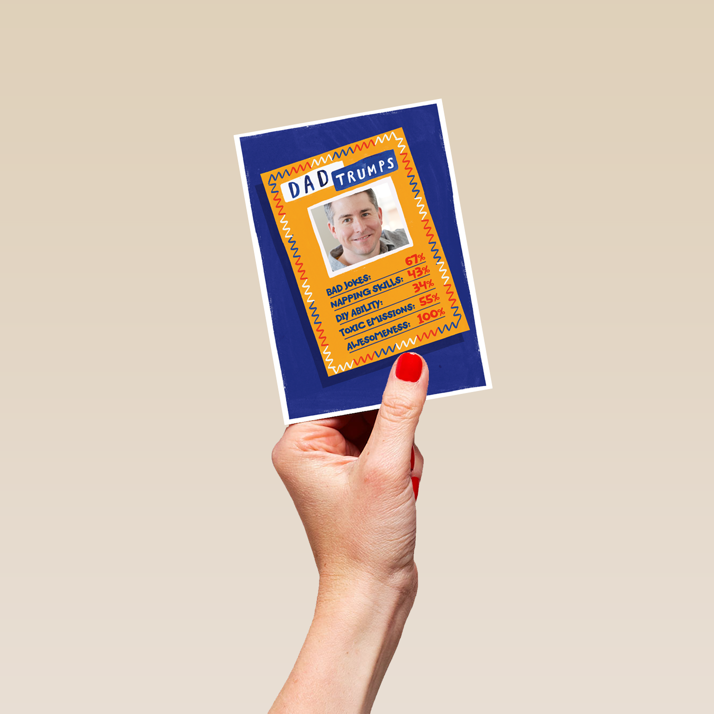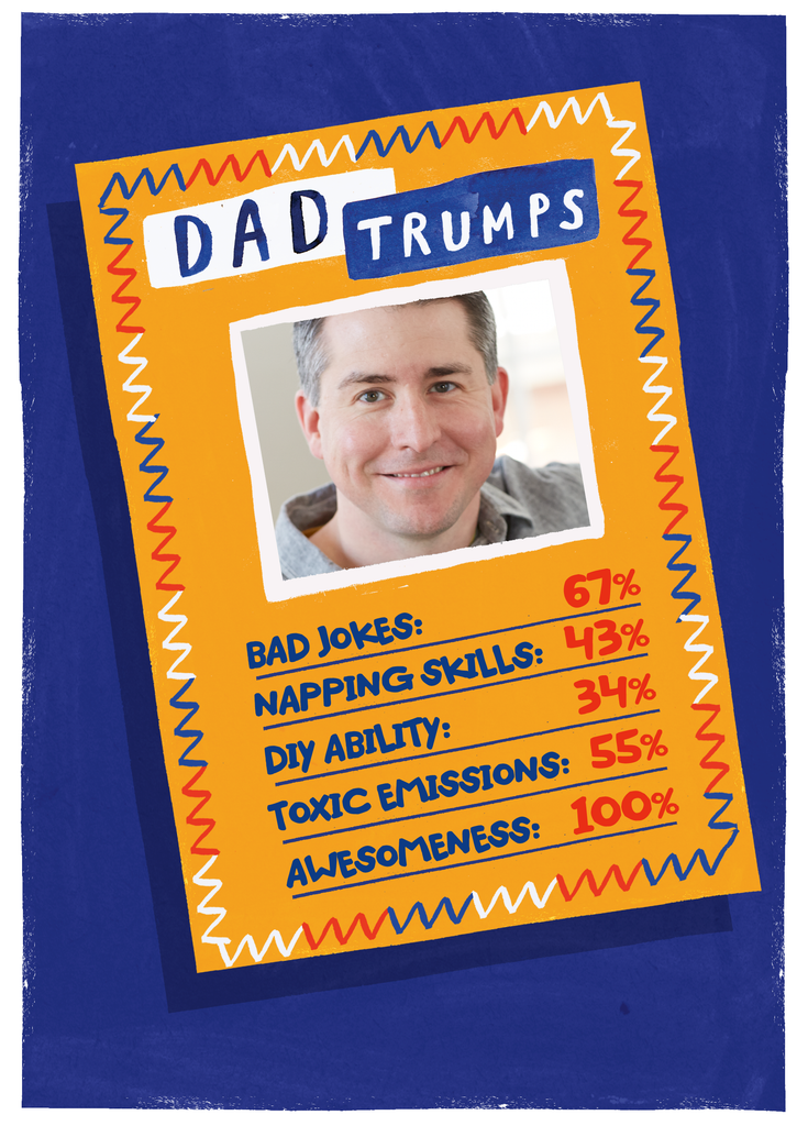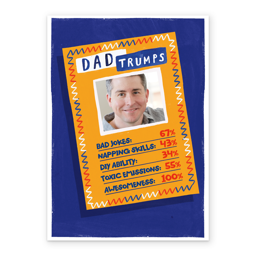Printed on premium-quality board, this card features an illustrated card game, showing off all your Dad's awesome abilities, space to upload a photo and personalise your message, and comes complete with a co-ordinating white envelope.
