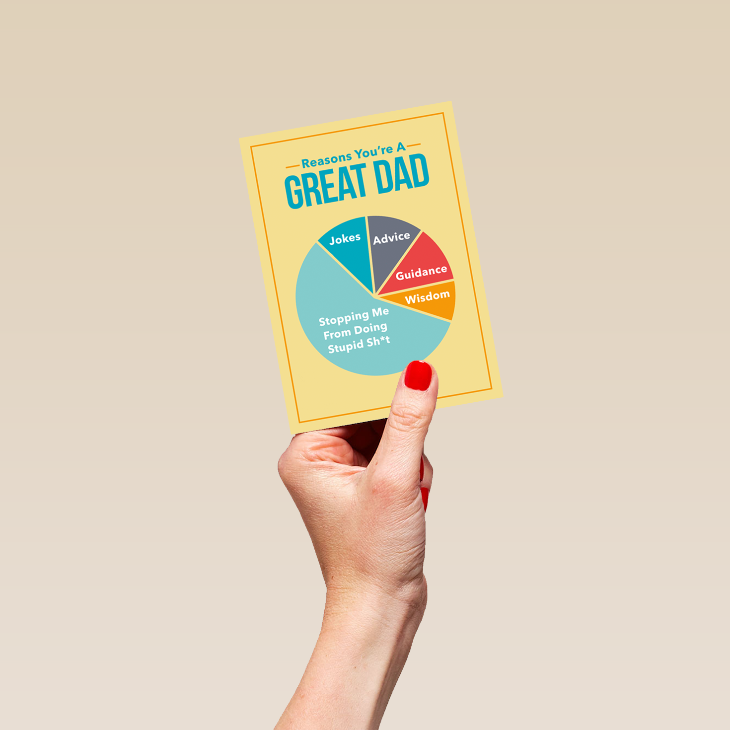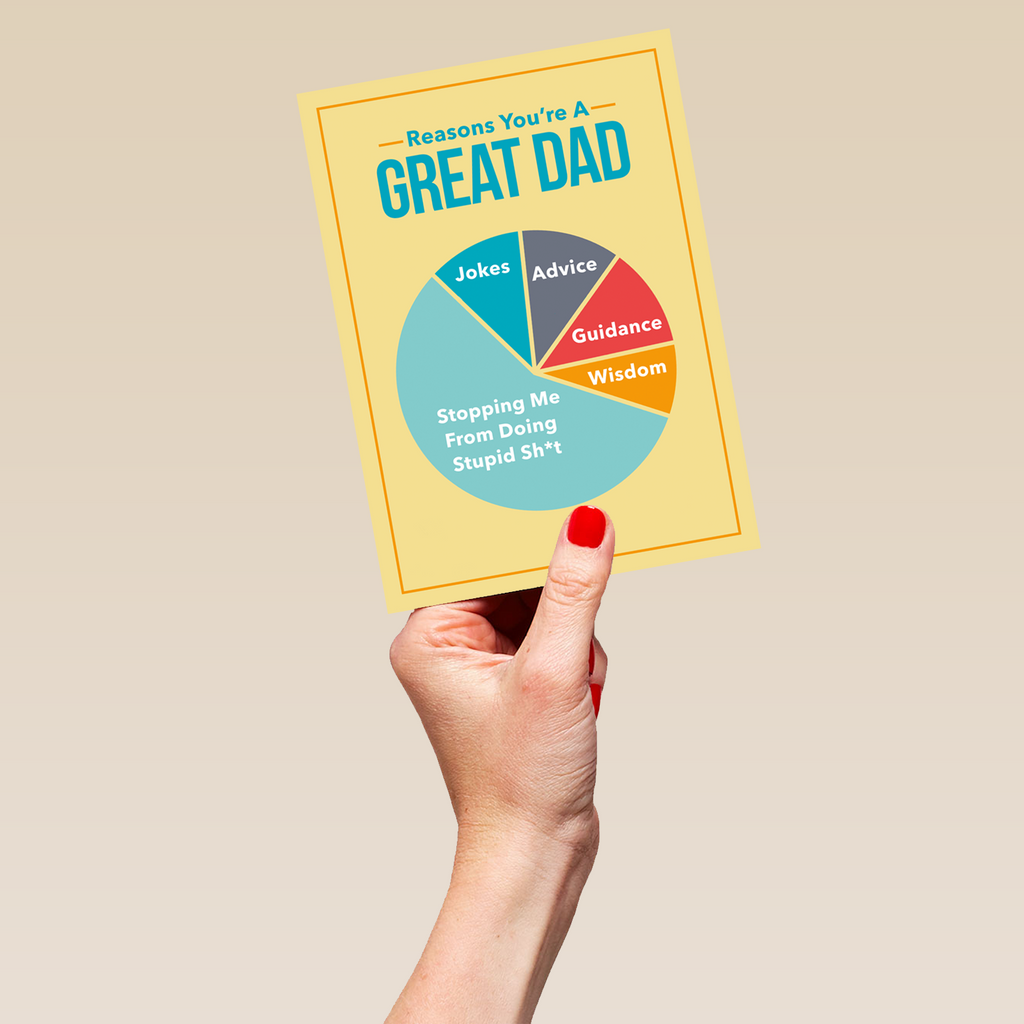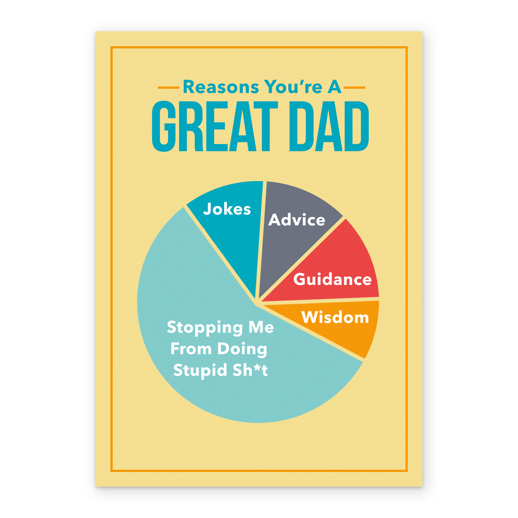 Printed on premium-quality board, this card features a funny pie-chart with segments from jokes, advice to wisdom, with the message 'Reasons You're A Great Dad', and comes complete with a co-ordinating white envelope.