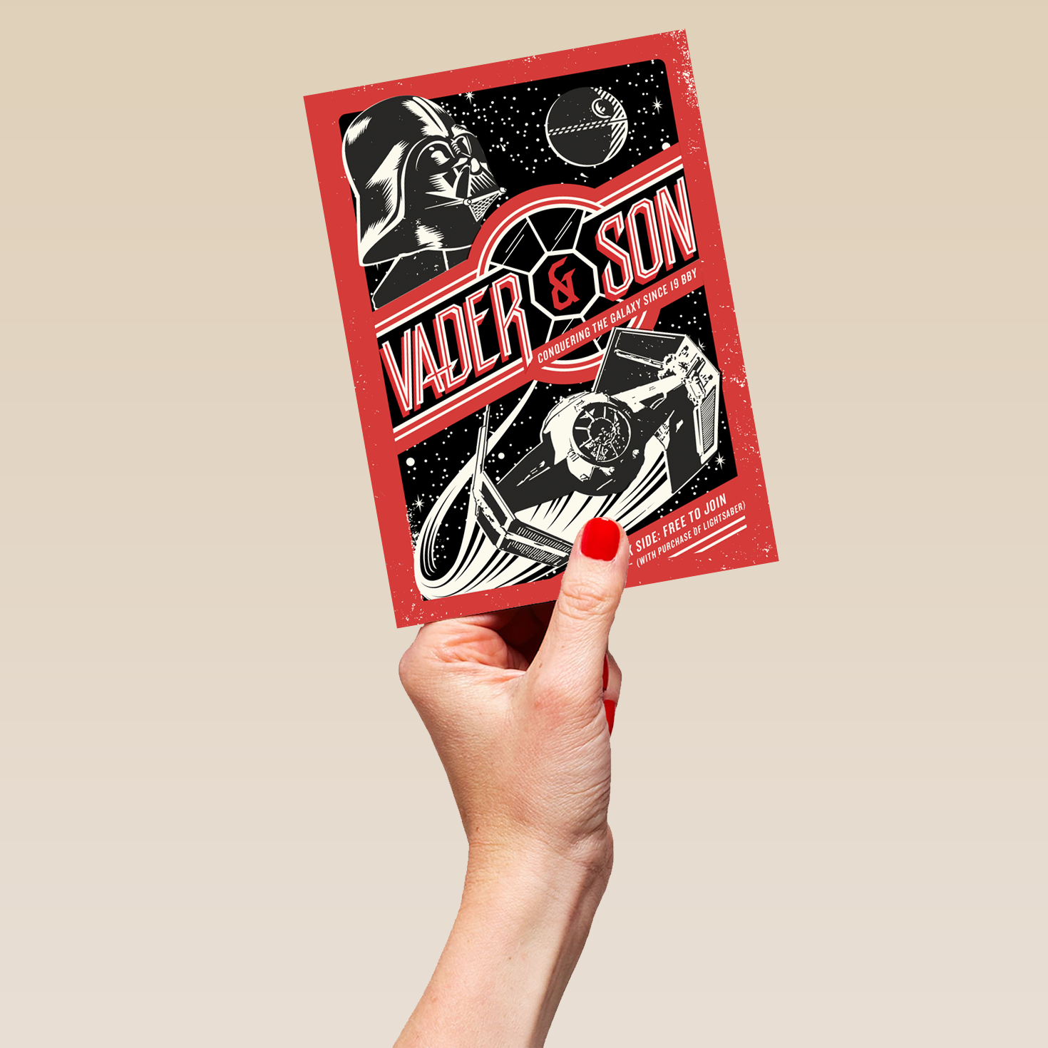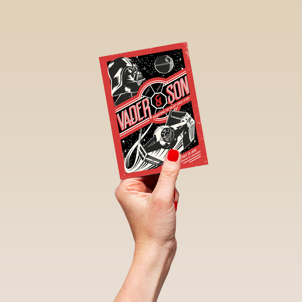 Printed on premium-quality board, this card features Star Wars' Darth Vader with a space scene including a Tie Fighter and the Death Star, with the message 'Vader & Son', and comes complete with a co-ordinating white envelope.