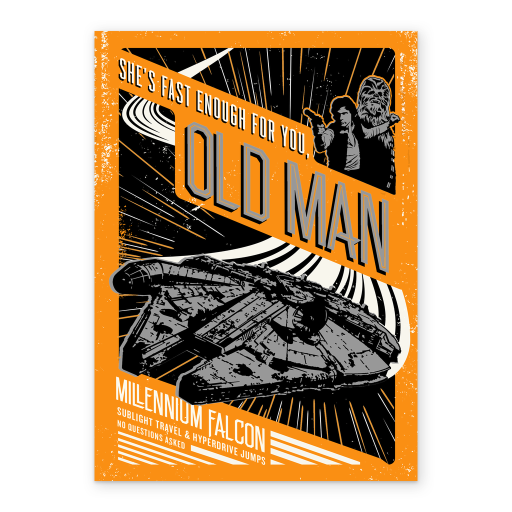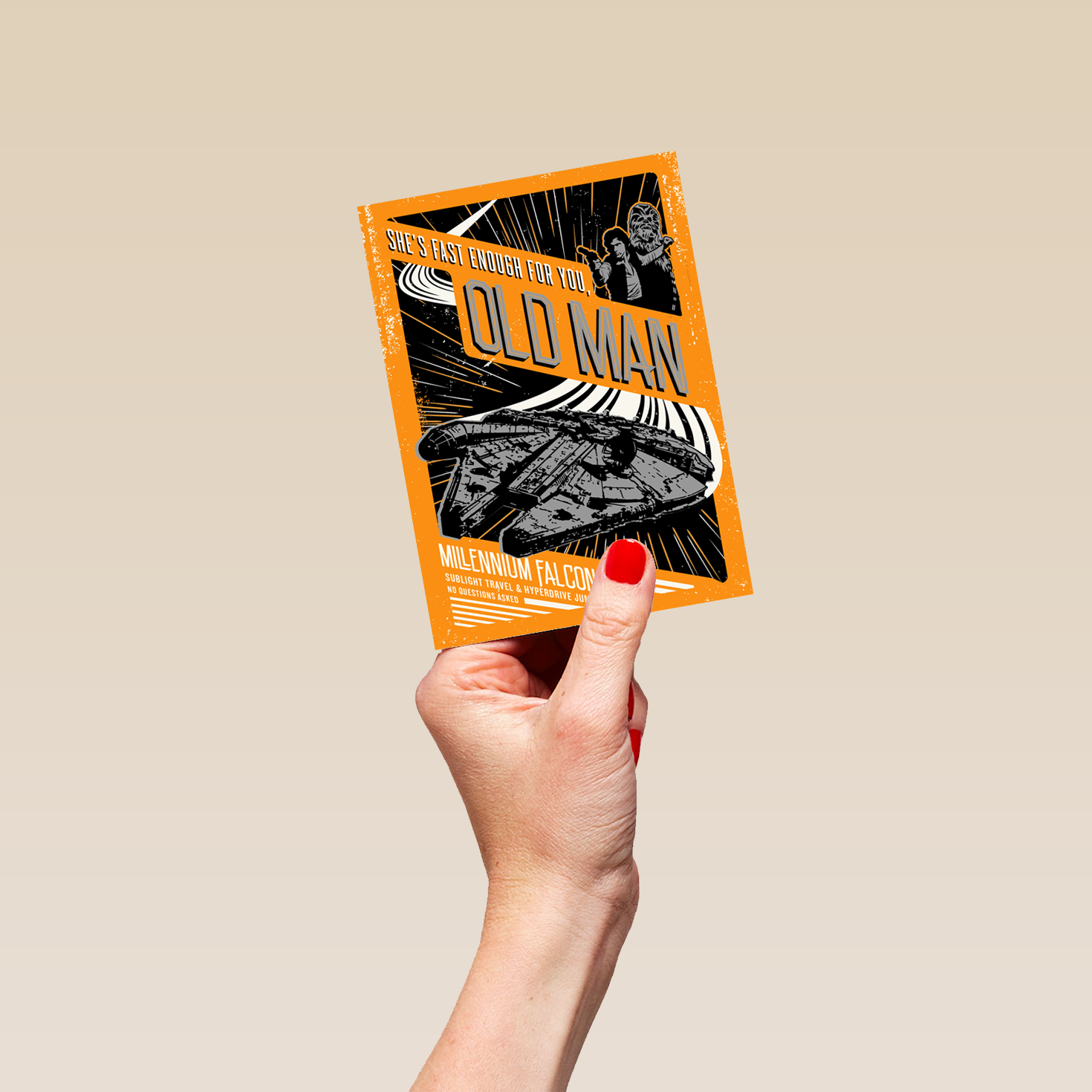 Printed on premium-quality board, this card features Han Solo and Chewbacca from Star Wars, with a space scene showing the iconic Milenium Falcon , with the message 'She's fast enough for you old man', and comes complete with a co-ordinating white envelope.
