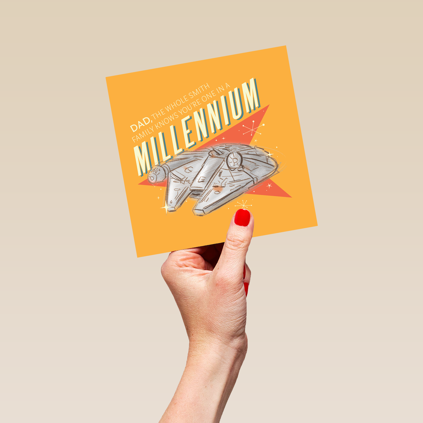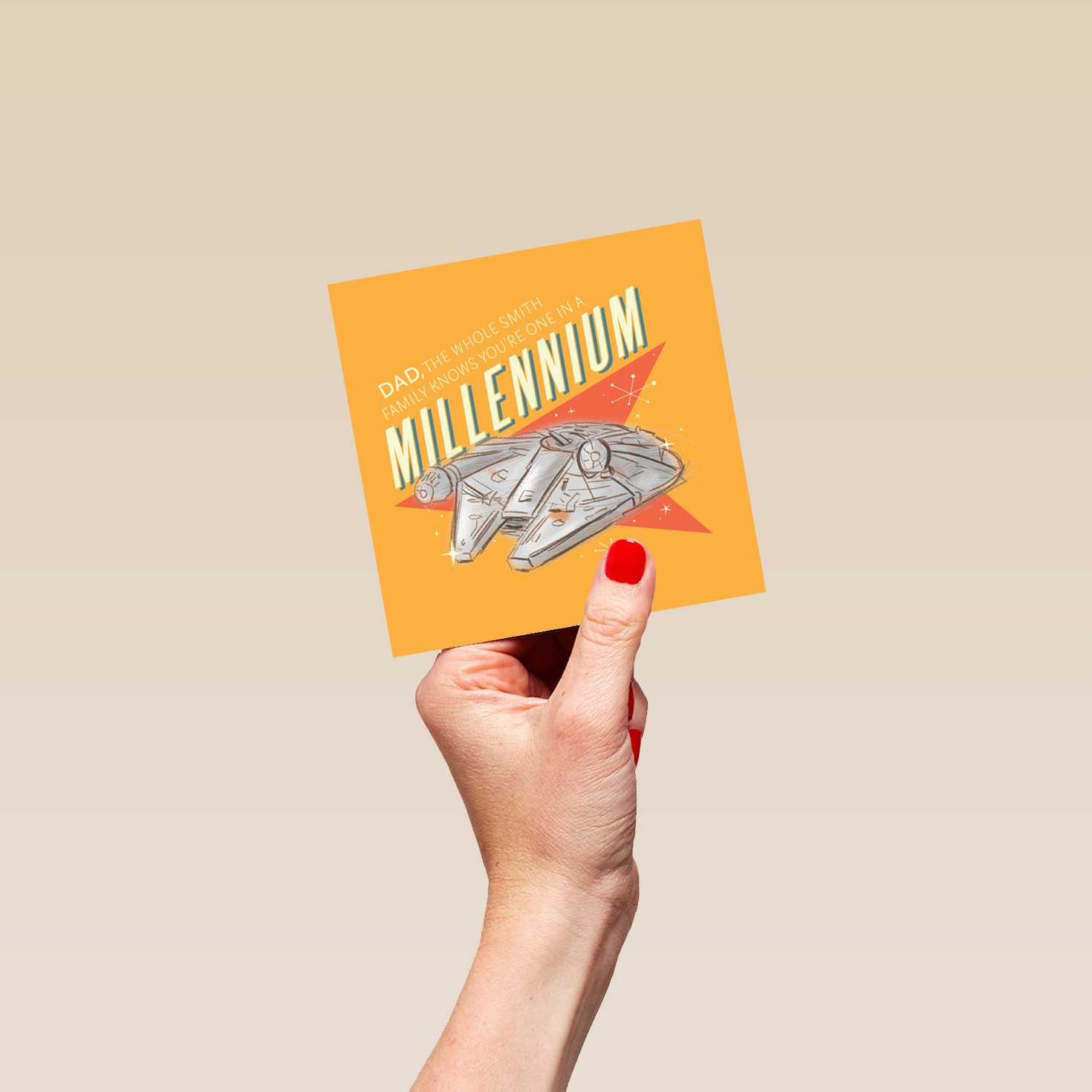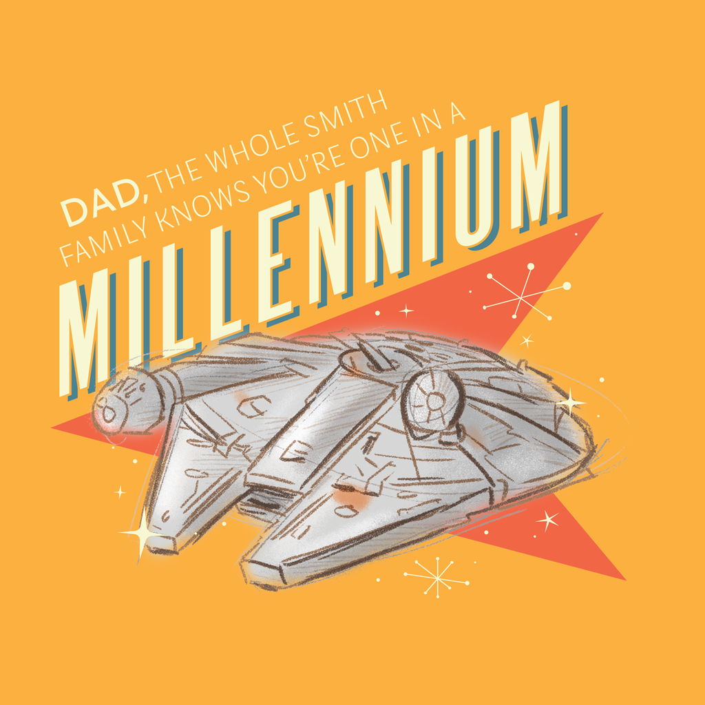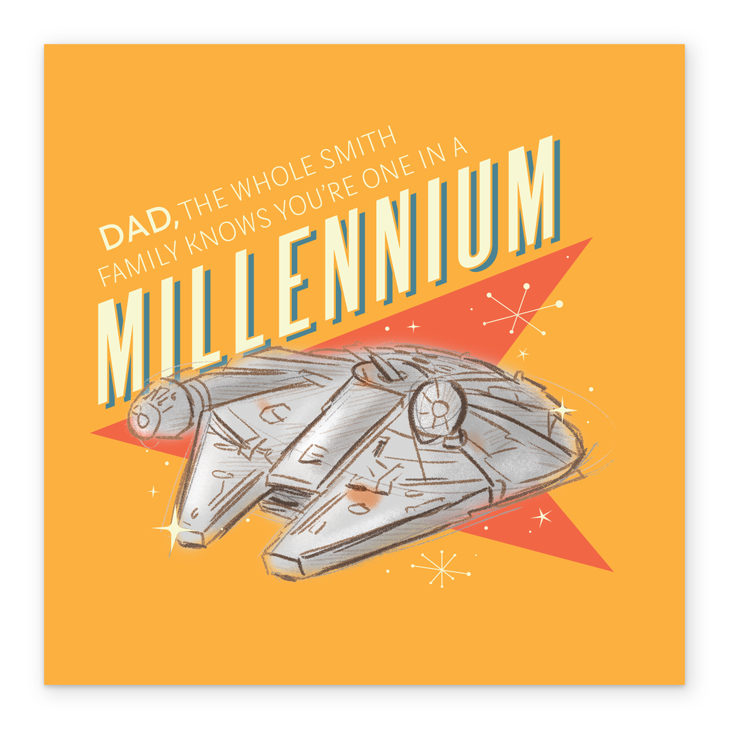 Printed on premium-quality board, this card features a Star Wars™ inspired, retro Millennium Falcon design, with the message 'Dad, the whole family knows you're one in a Millennium', space to personalise a name, and comes complete with a co-ordinating white envelope.