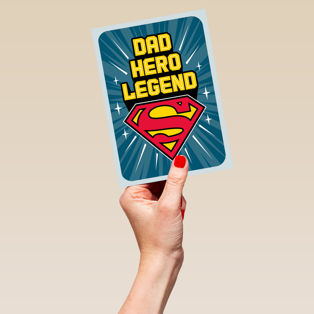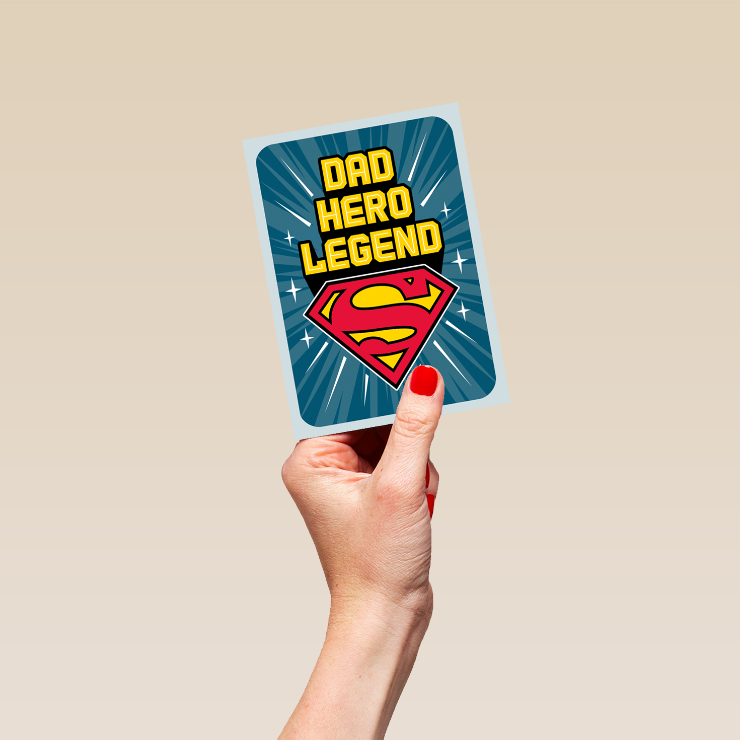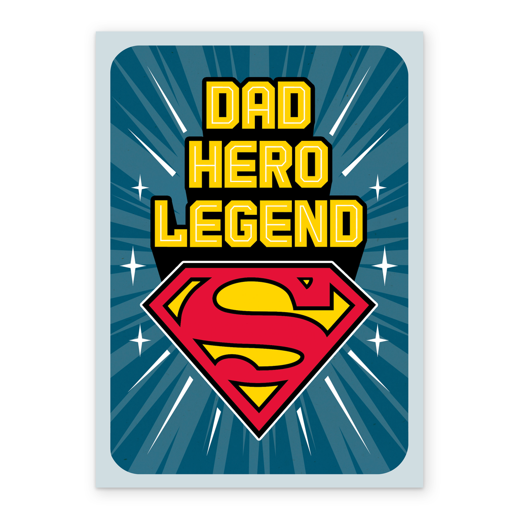 Printed on premium-quality board, this card features Superman's iconic symbol on a burst-effect blue background, with the message 'DAD HERO LEGEND', and comes complete with a co-ordinating white envelope.