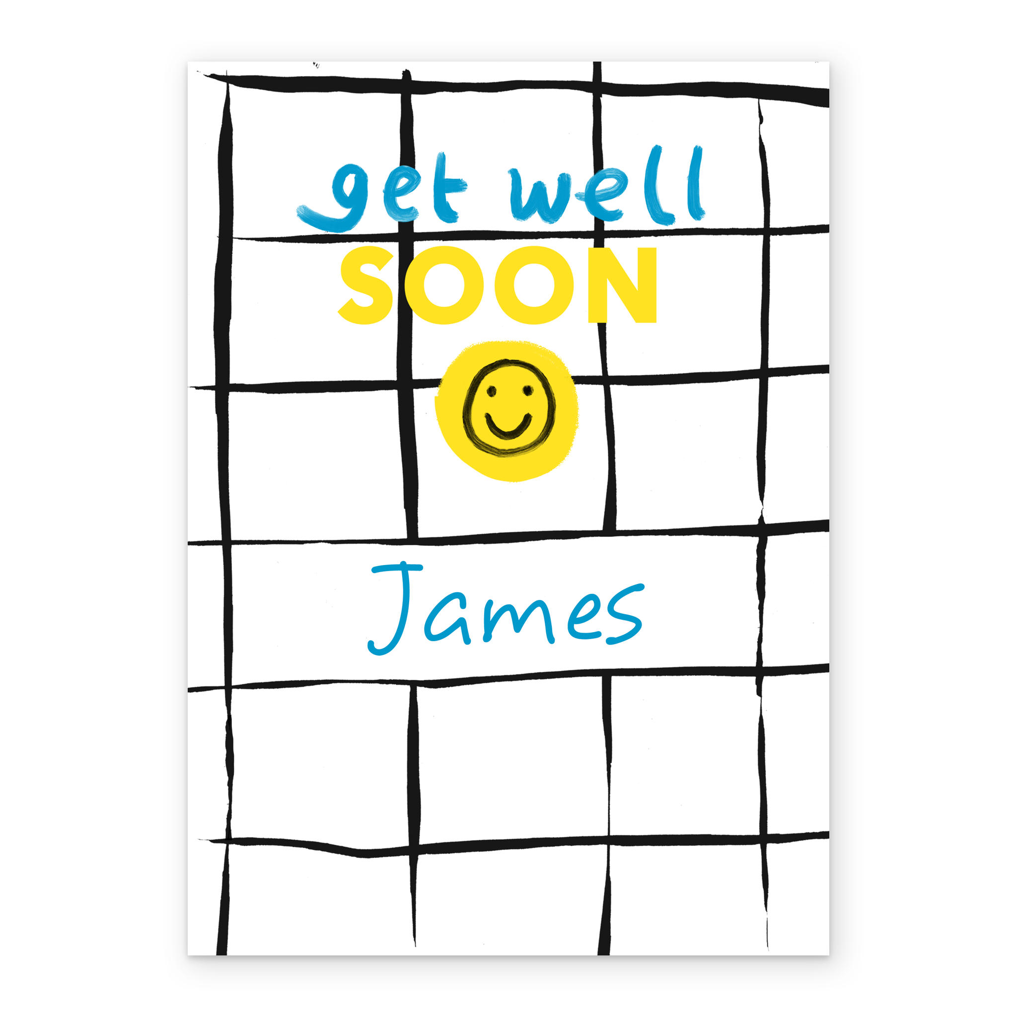Printed on premium-quality board, this card features a colourful crayon styled grid with a get well message, with the message 'get well soon', space to personalise a name, and comes complete with a co-ordinating white envelope.
