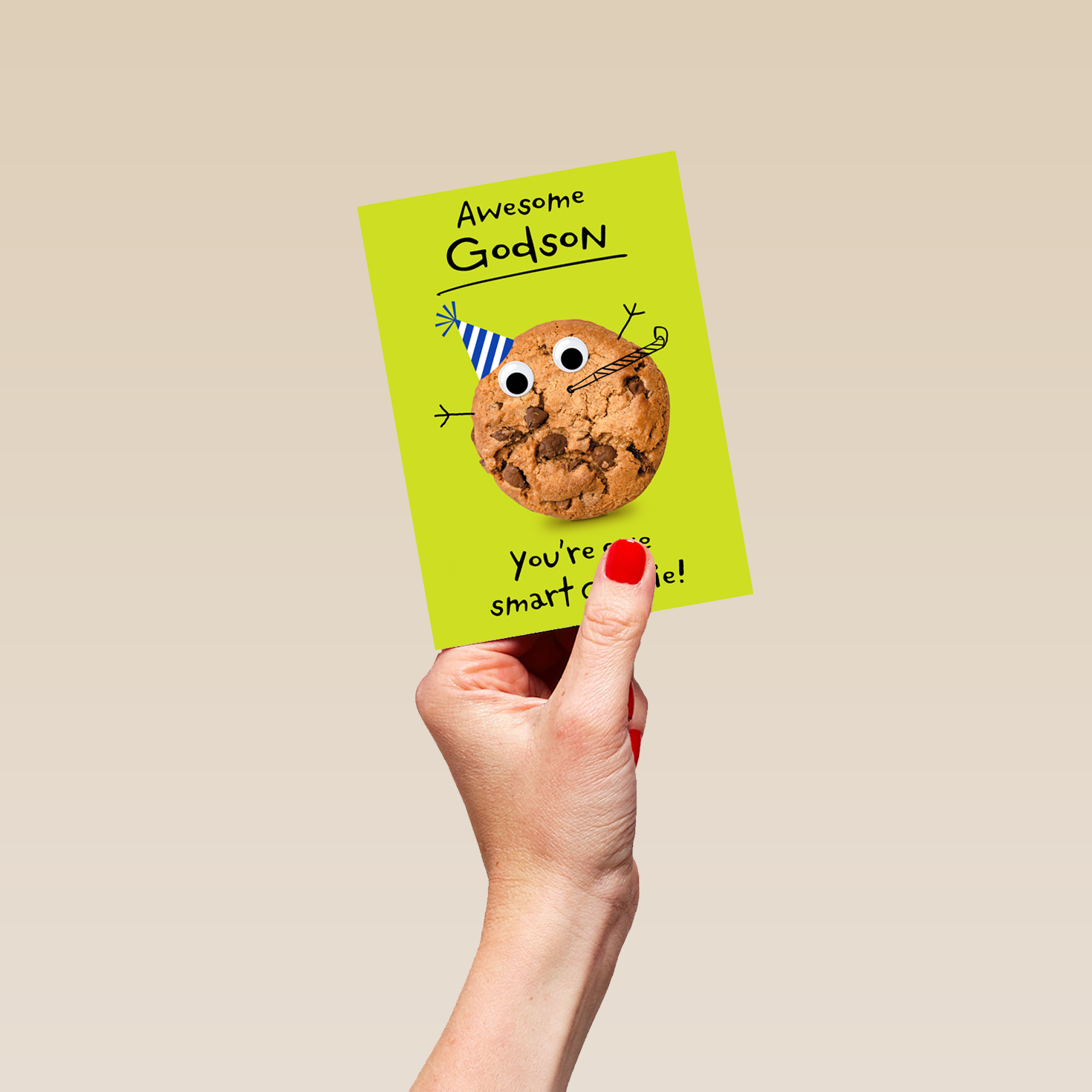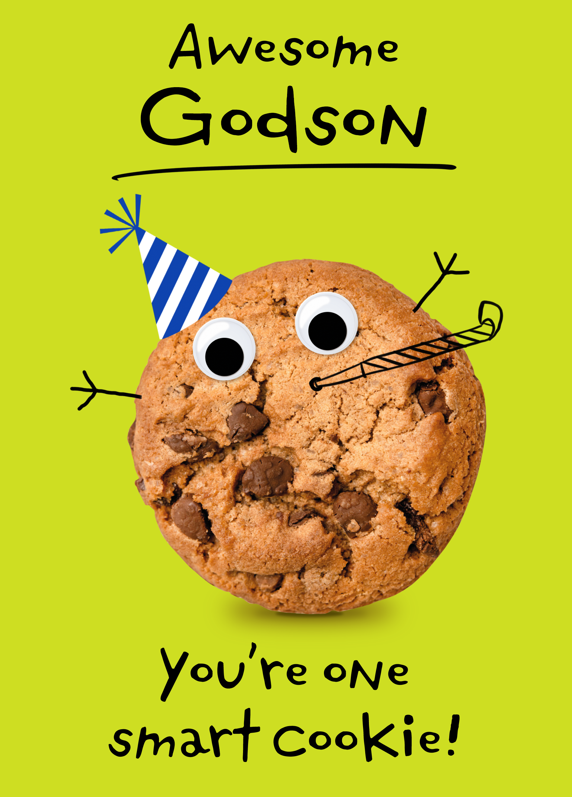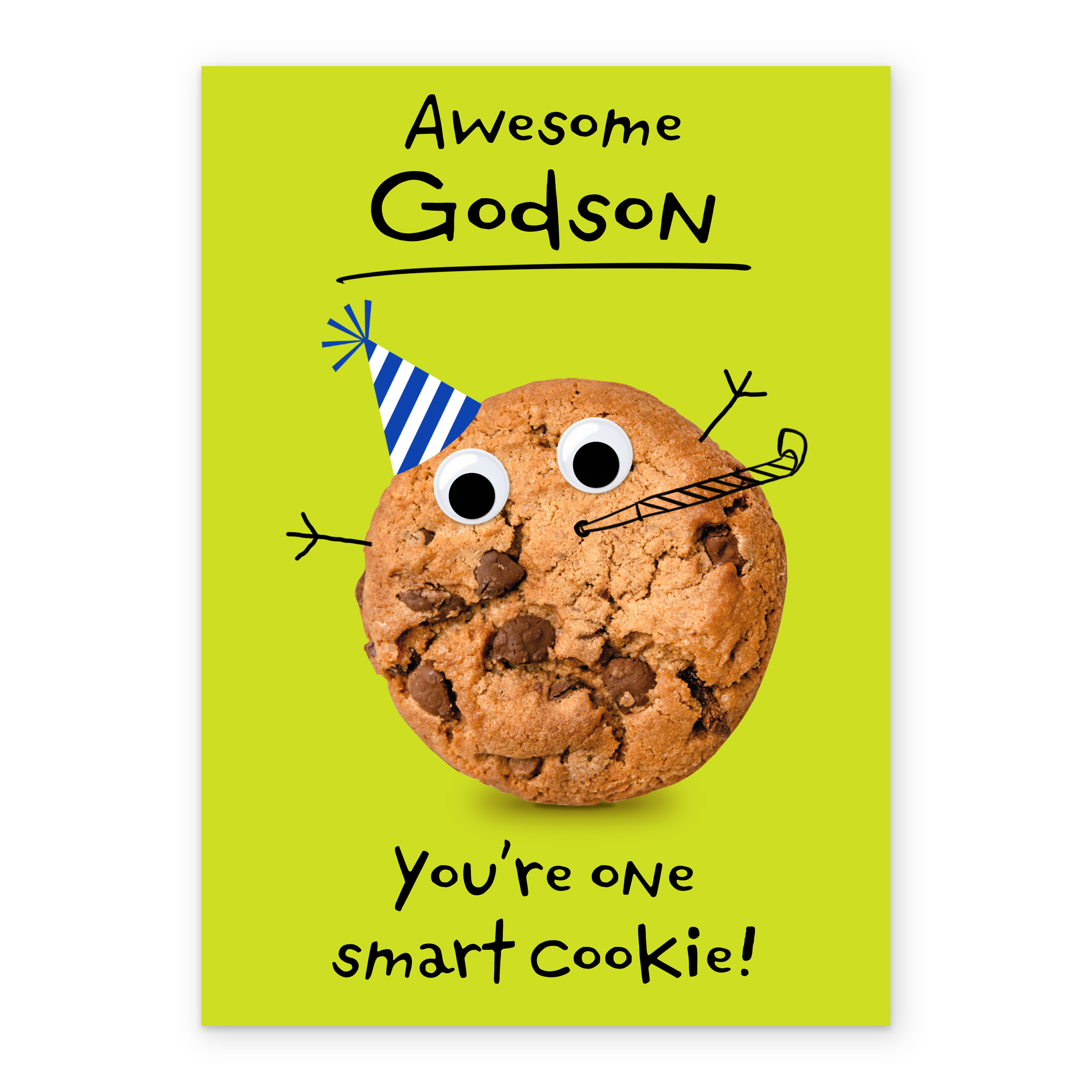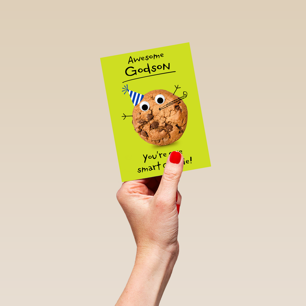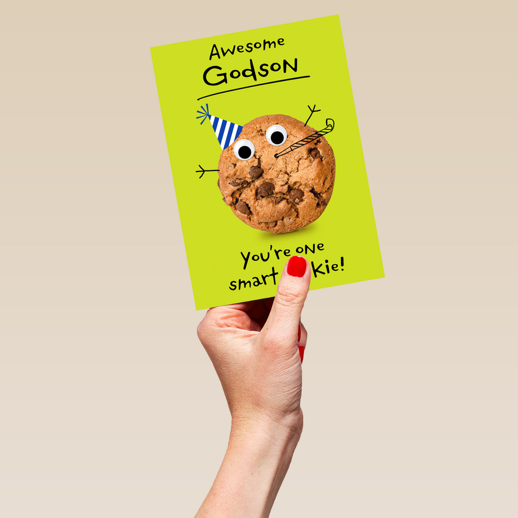 Printed on premium-quality board, this card features a funny cookie with cartoon features, with the message 'Awesome Godson, You're one smart cookie', space to personalise your message, and comes complete with a co-ordinating white envelope.