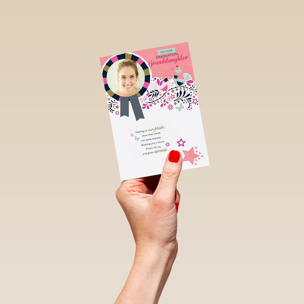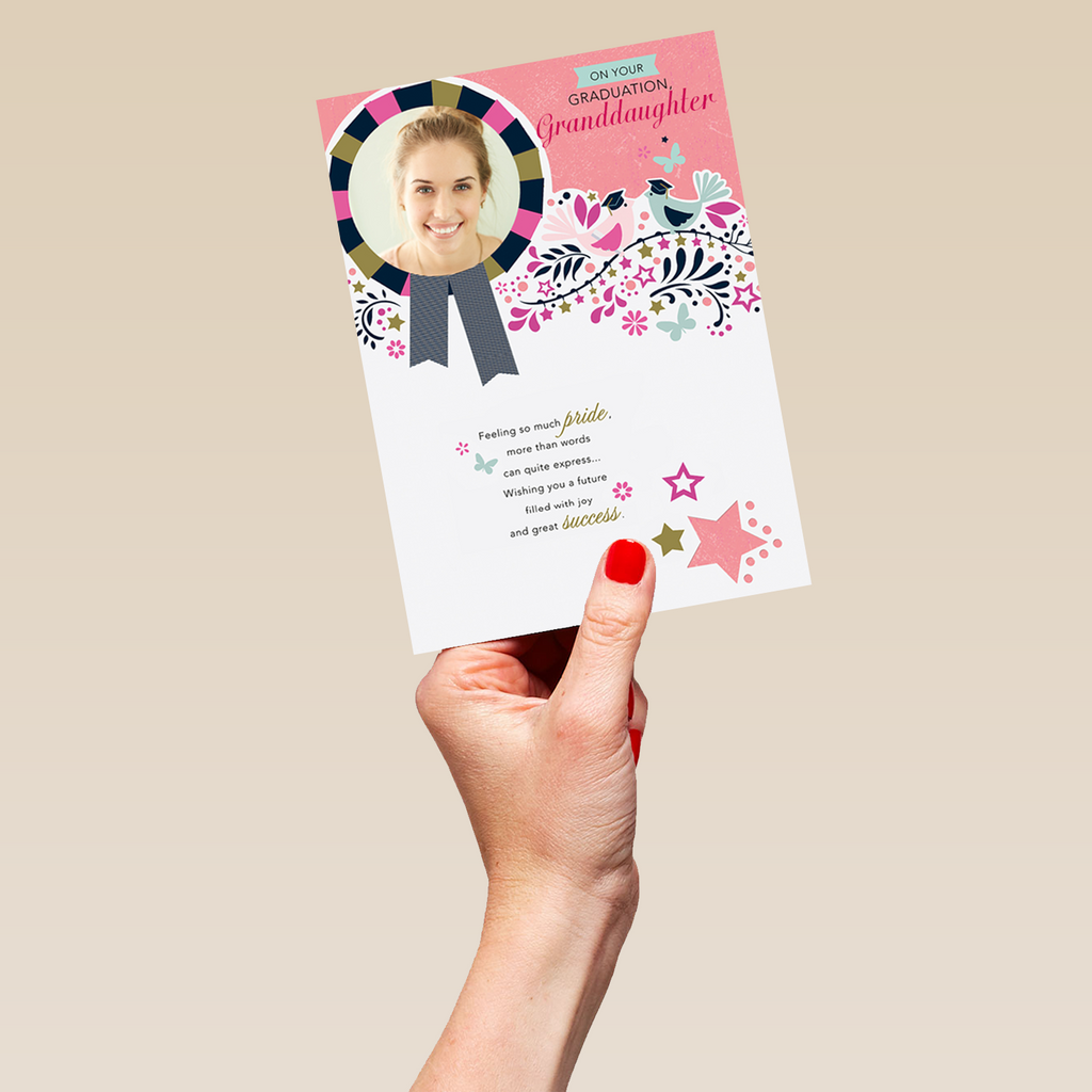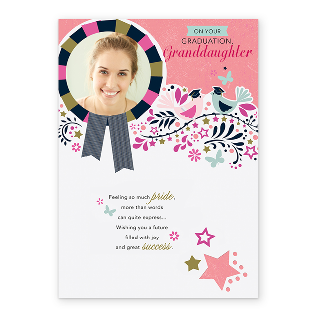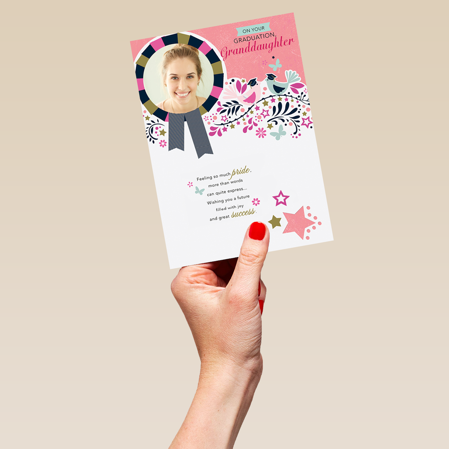 Show them you care with a personalised editable stars and rosette granddaughter graduation card from Hallmark. Our graduation cards are printed on premium quality, FSC®-certified card & delivered nationwide. This card is available as standard 12cm by 16.7cm and large 15.5cm by 21.6cm.