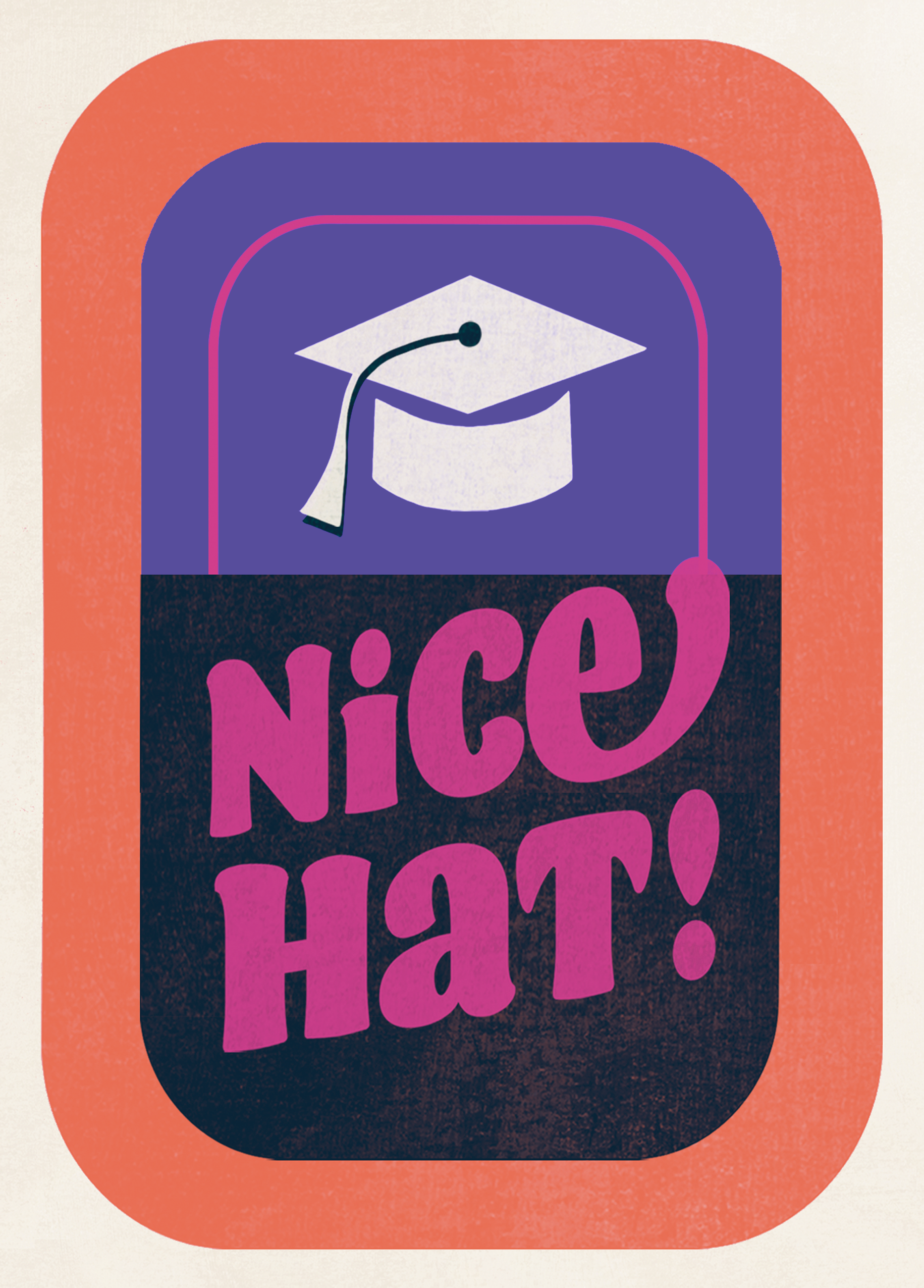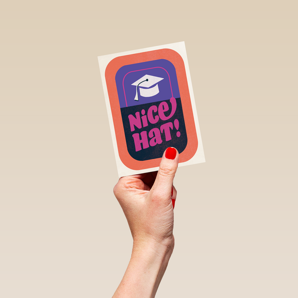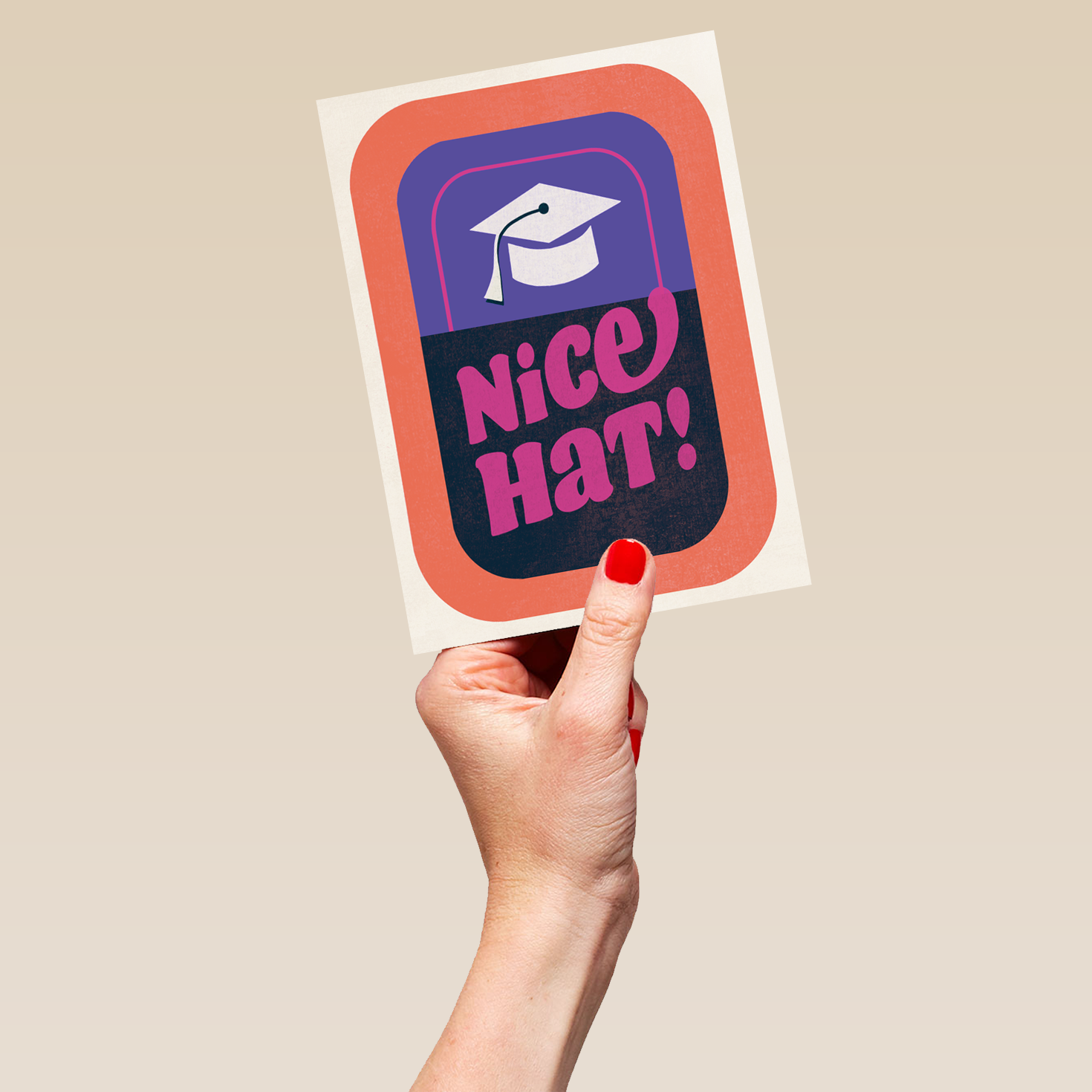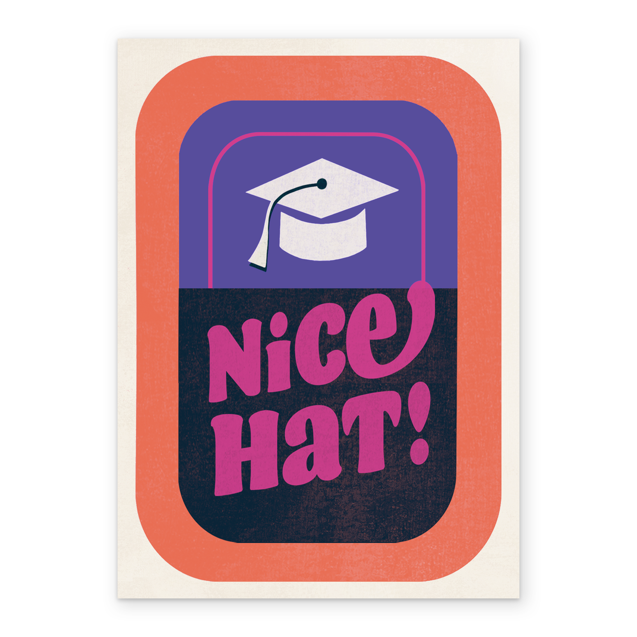 Printed on premium-quality board, this card features a retro styled mortarboard and word art, with the message 'Nice hat!', and comes complete with a co-ordinating white envelope.