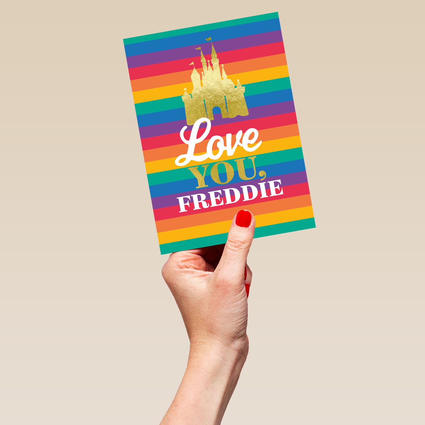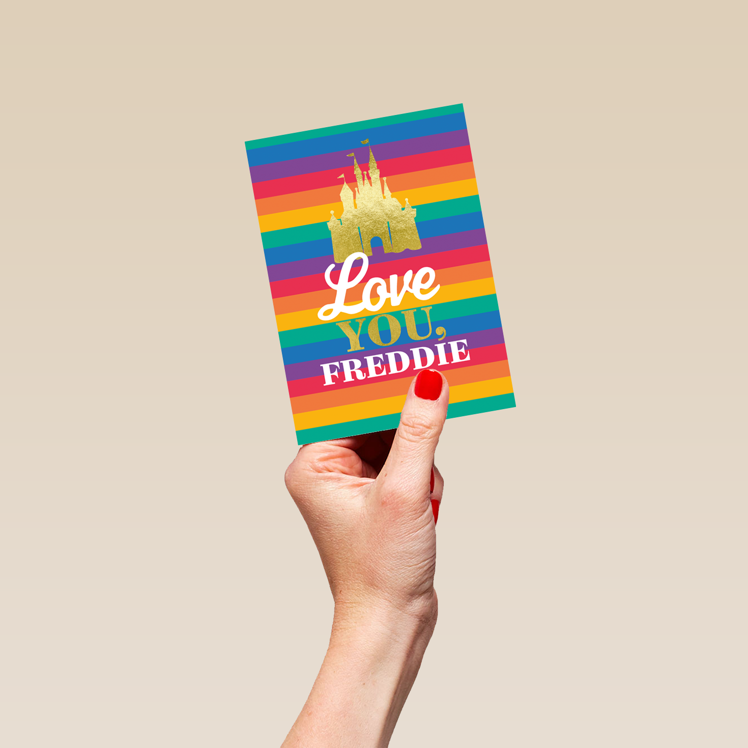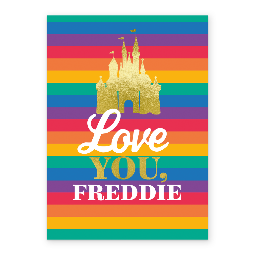 Printed on premium-quality board, this card features a silhouette of Cinderella's castle with the Pride flag's rainbow colours for the background, with the message 'Love You', space to personalise a name, and comes complete with a co-ordinating white envelope.