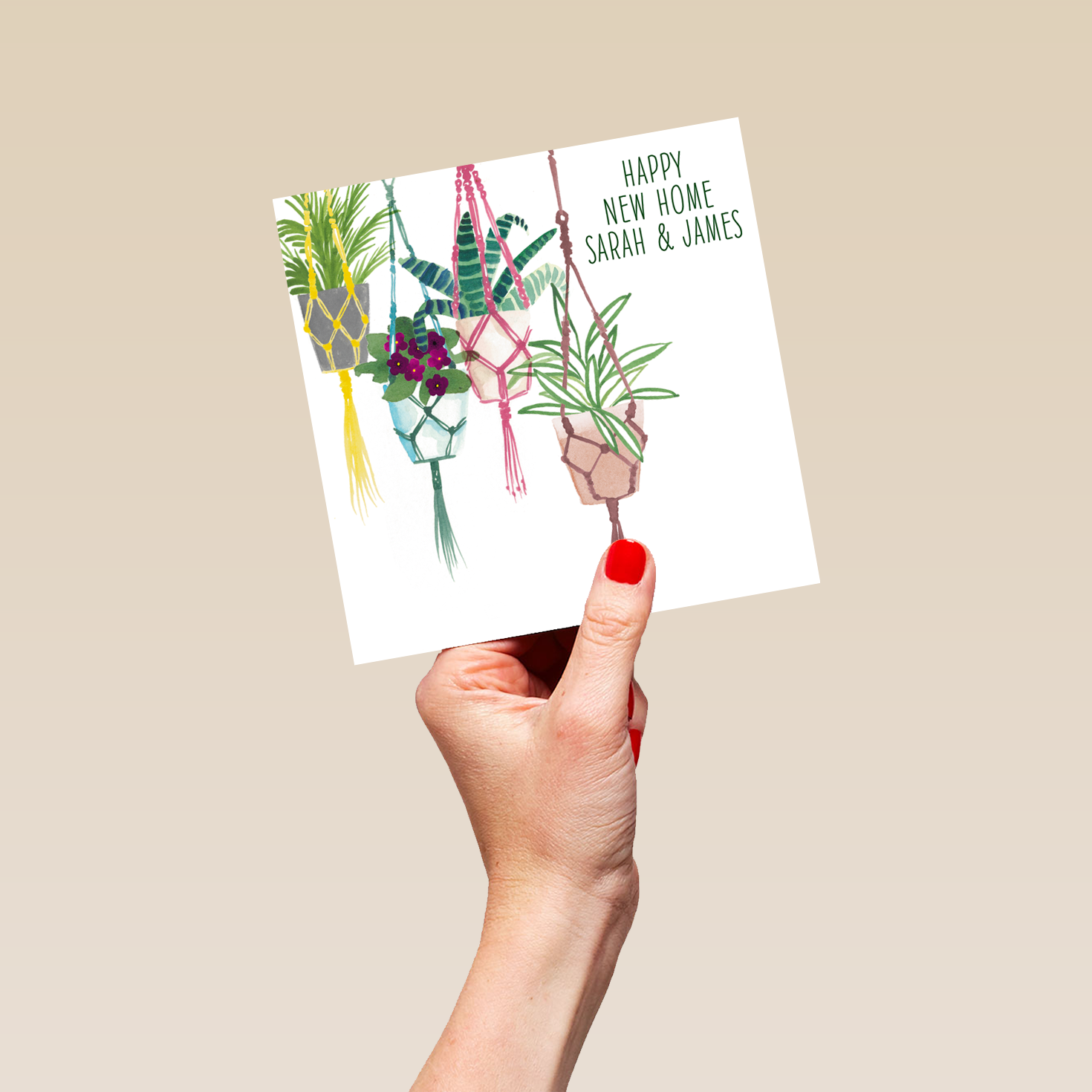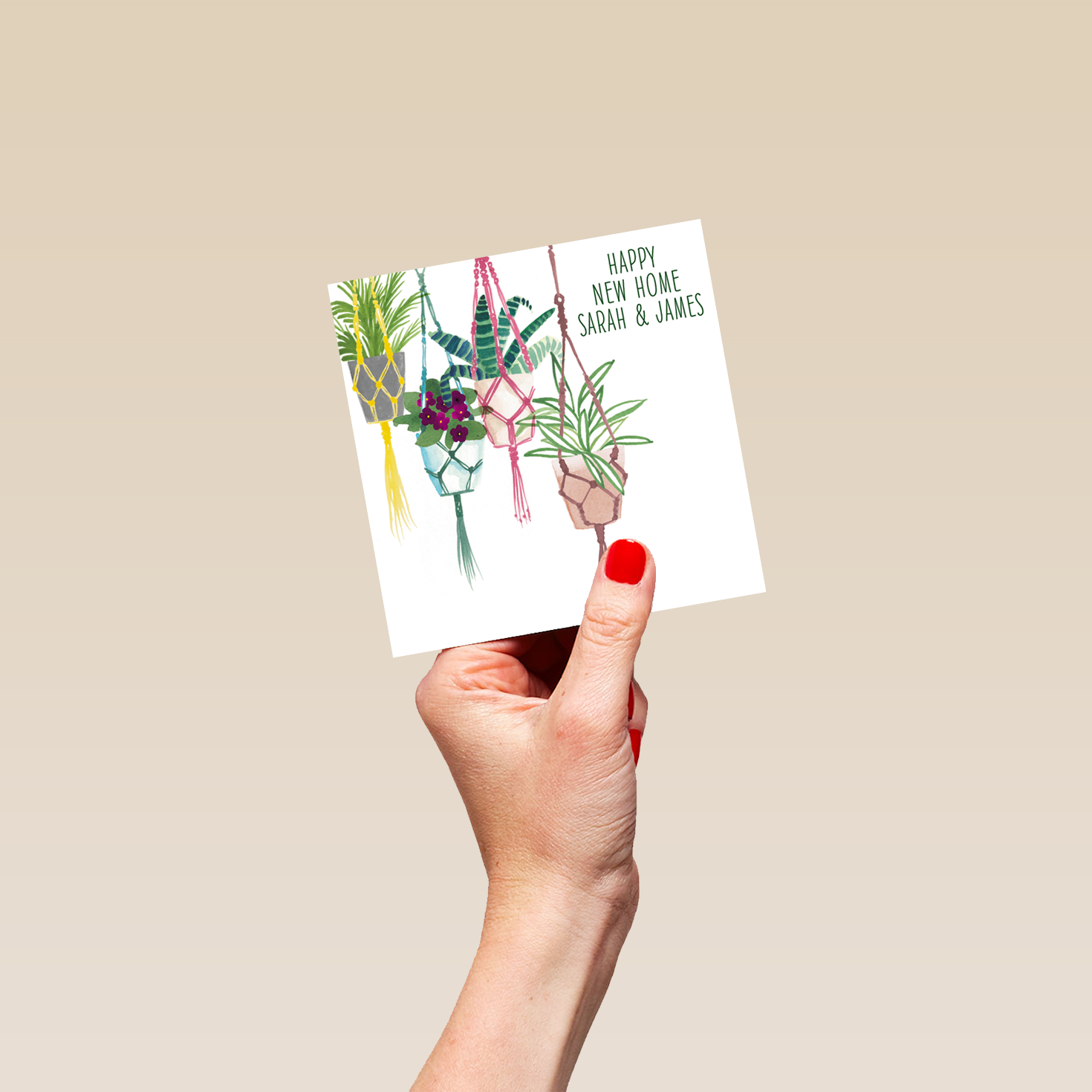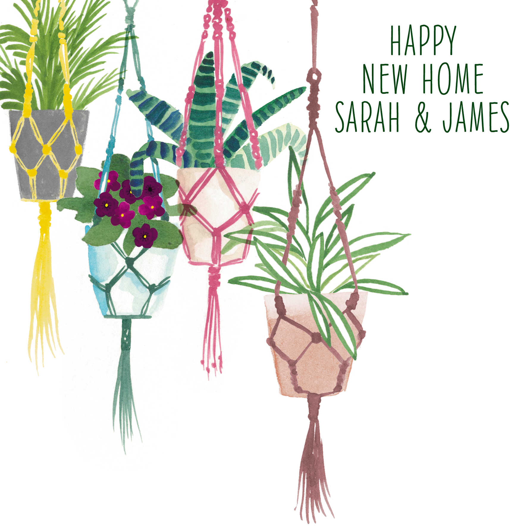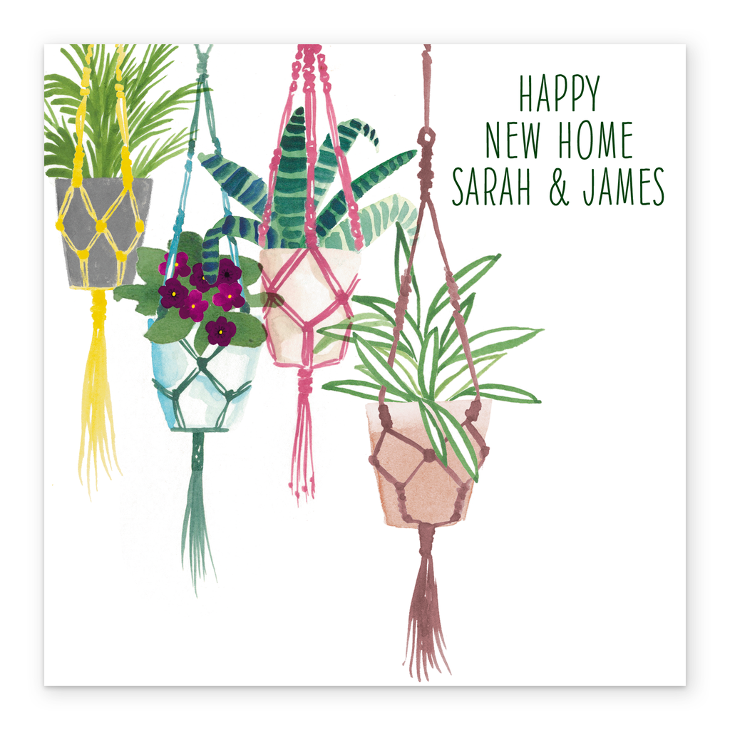 Printed on premium-quality board, this card features hanging plants in colourful plant pots, with the message 'Happy New Home', space to personalise a name, and comes complete with a co-ordinating white envelope.