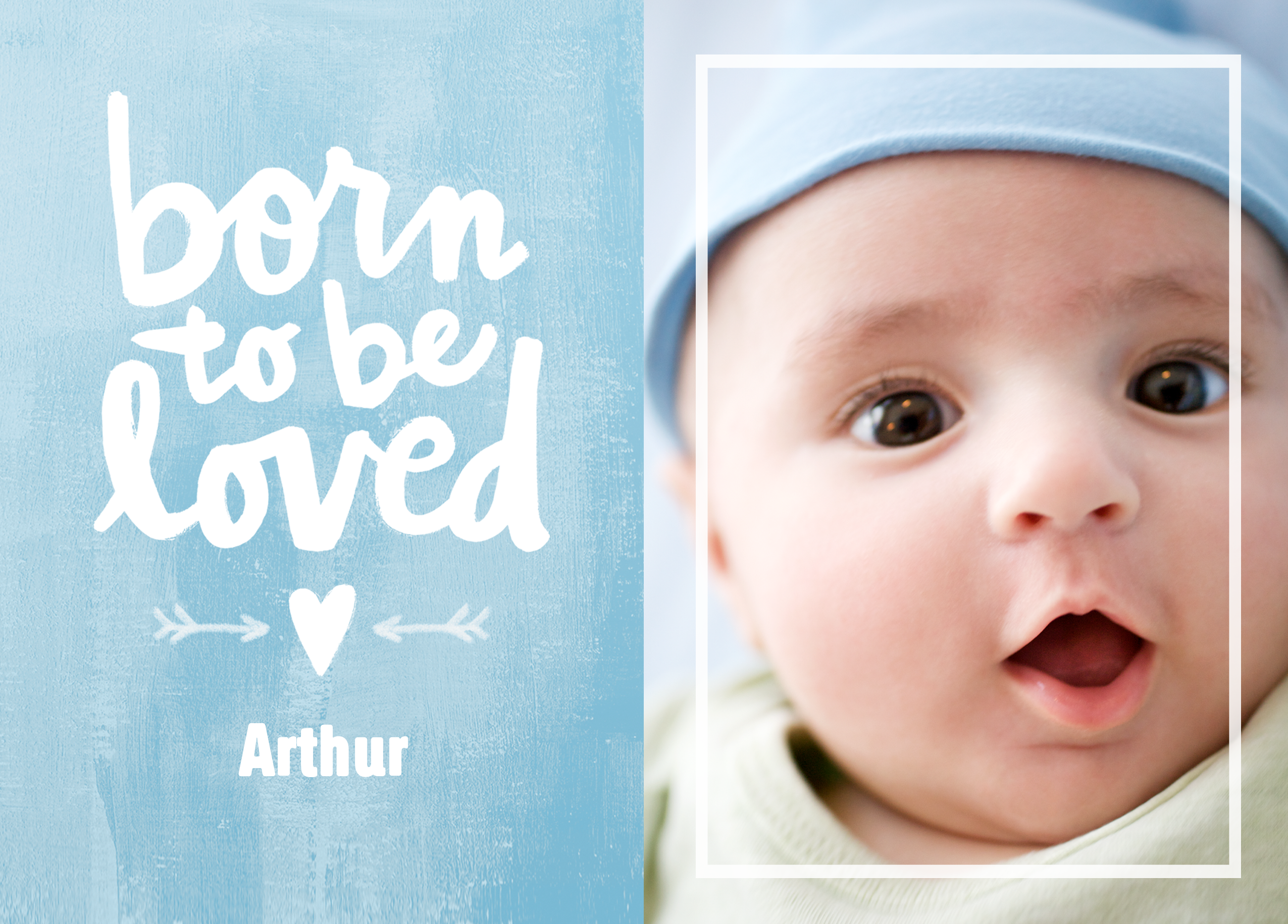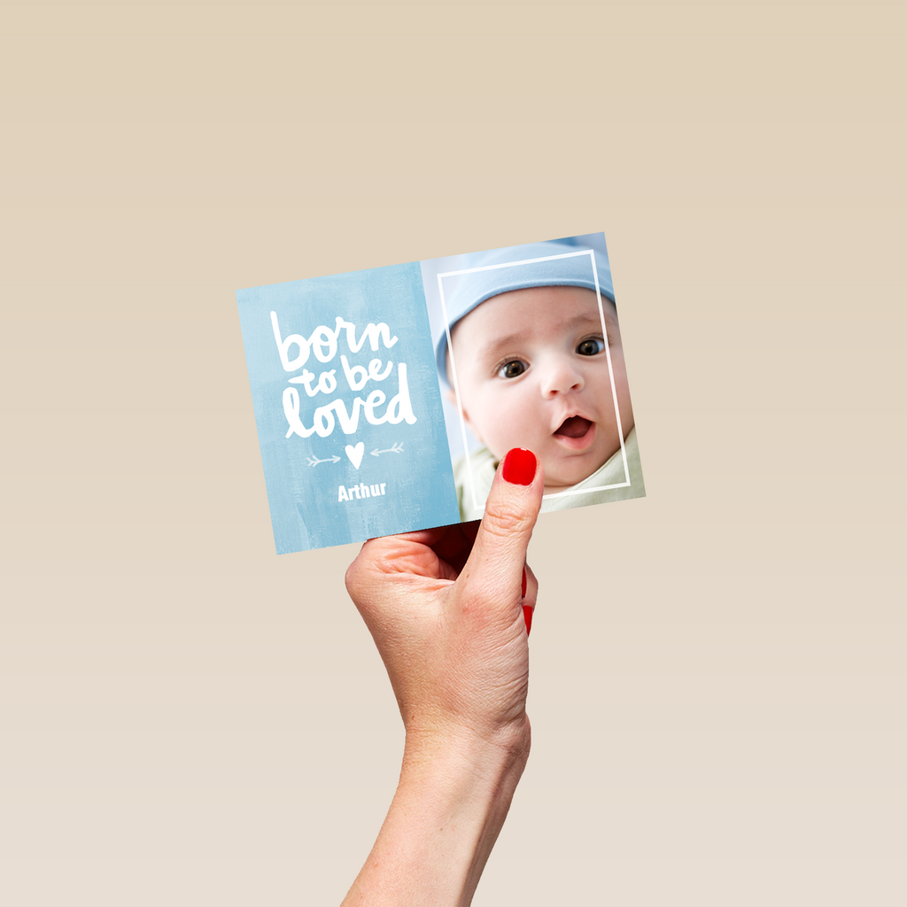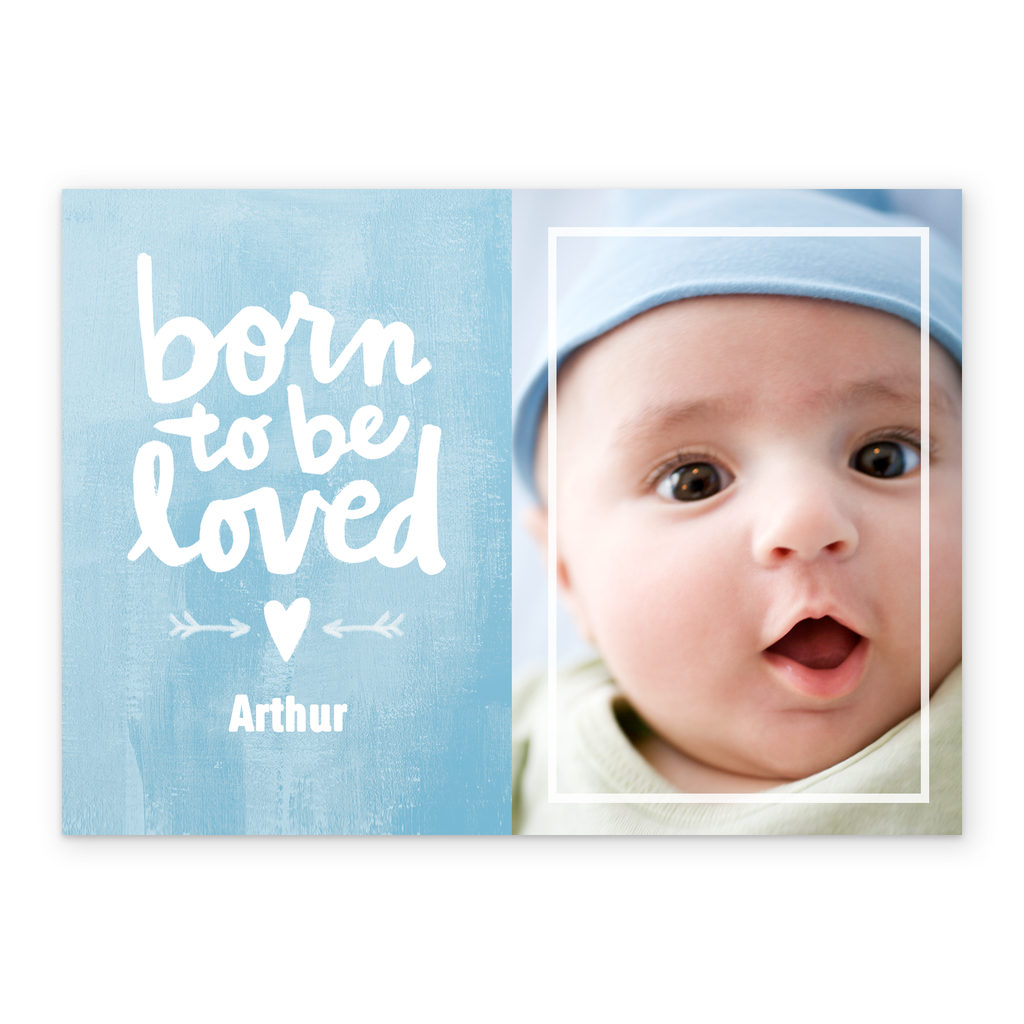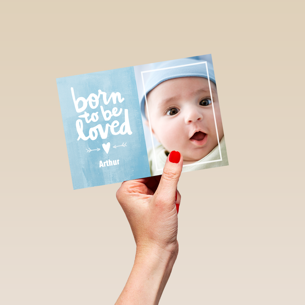 Printed on premium-quality board, this card features a blue background with cursive lettering, with the message 'Born To Be Loved', space to upload a photo and personalise a name, and comes complete with a co-ordinating white envelope.