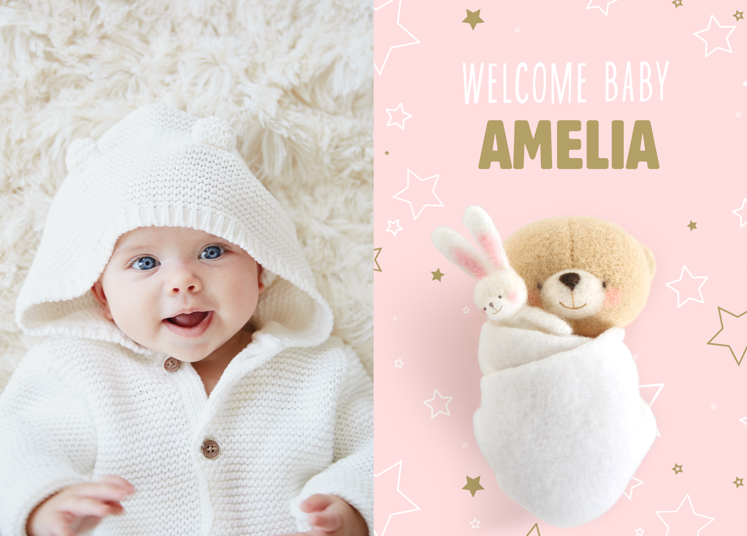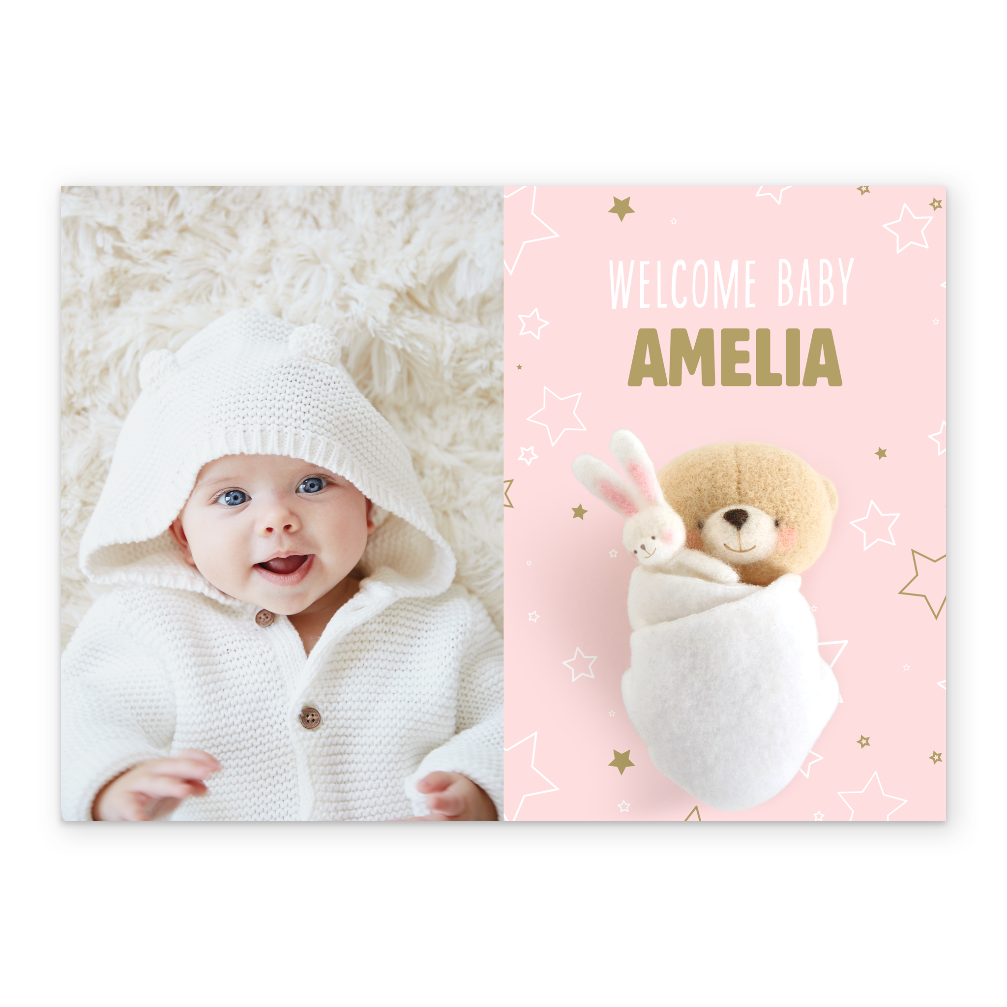 Printed on premium-quality board, this card features a cute Forever Friends teddy bear on a pink background with stars, with the message 'Welcome Baby', space to upload a photo and personalise a name, and comes complete with a co-ordinating white envelope.