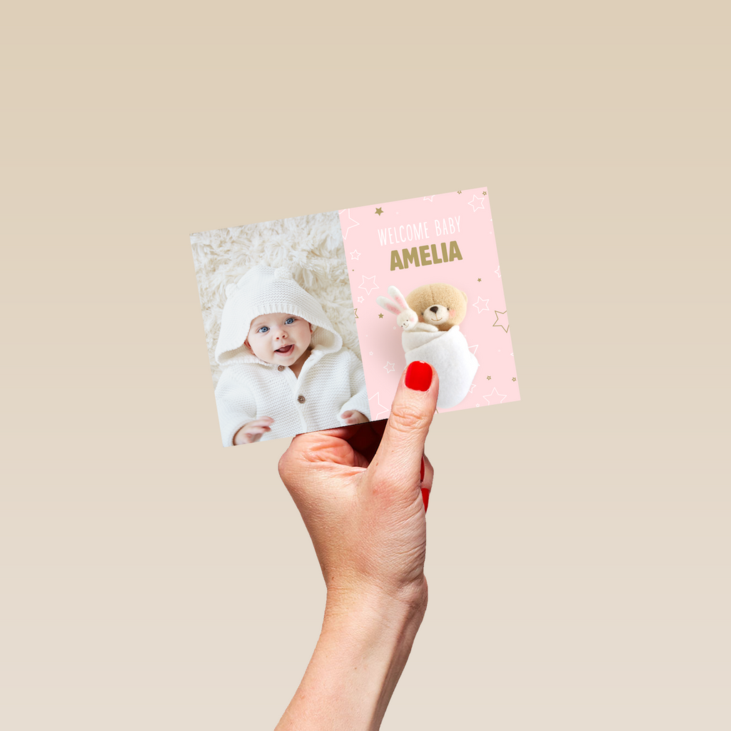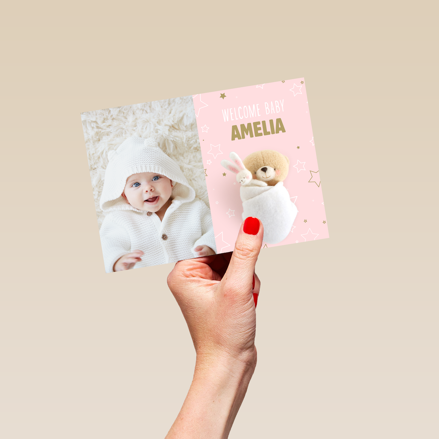 Welcome the new baby girl into the world with the sweetness of Hallmark's Forever Friends with this adorable personalised New Baby card. The perfect way to upload a photo of the bundle of joy and show her cuteness off to the world.