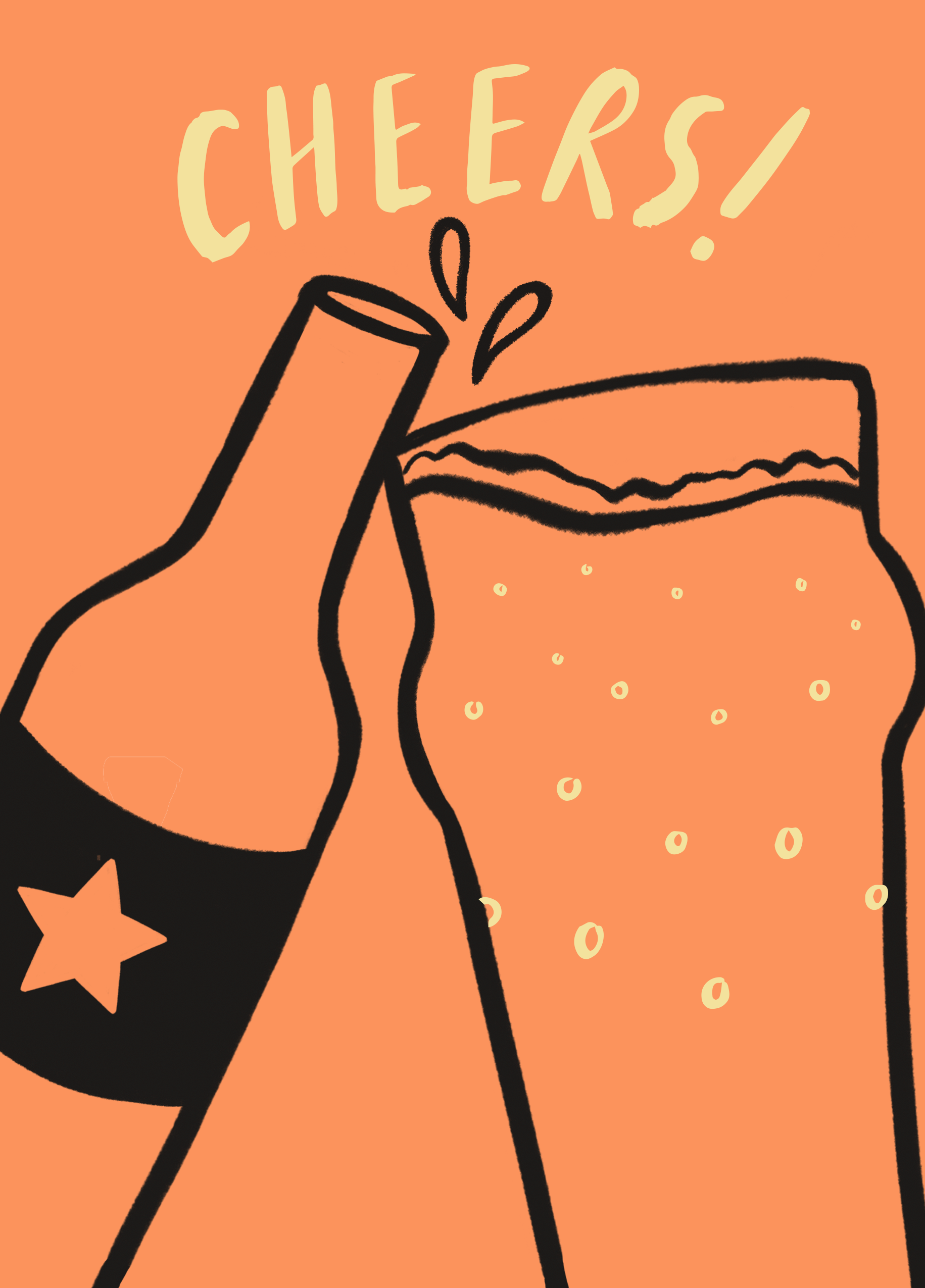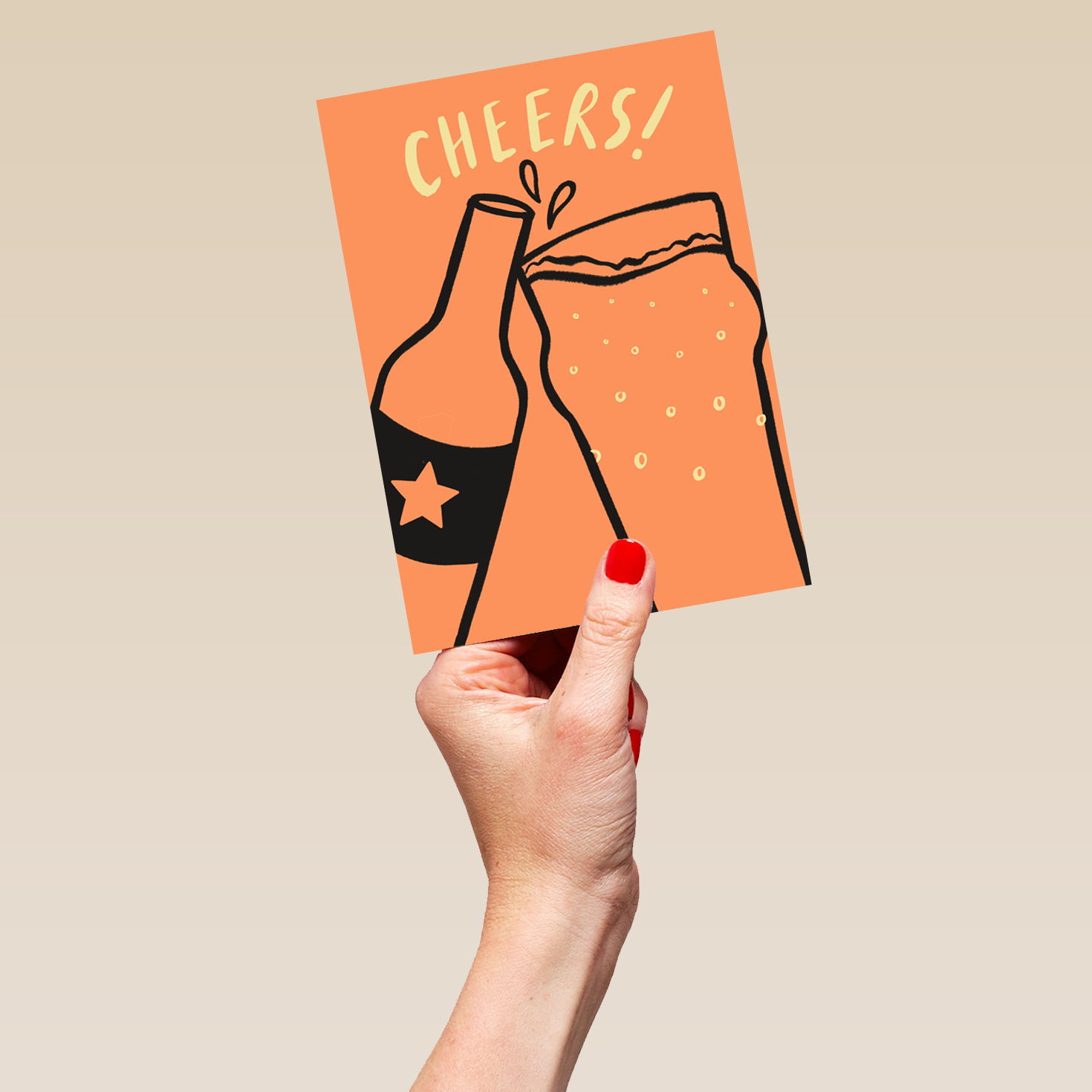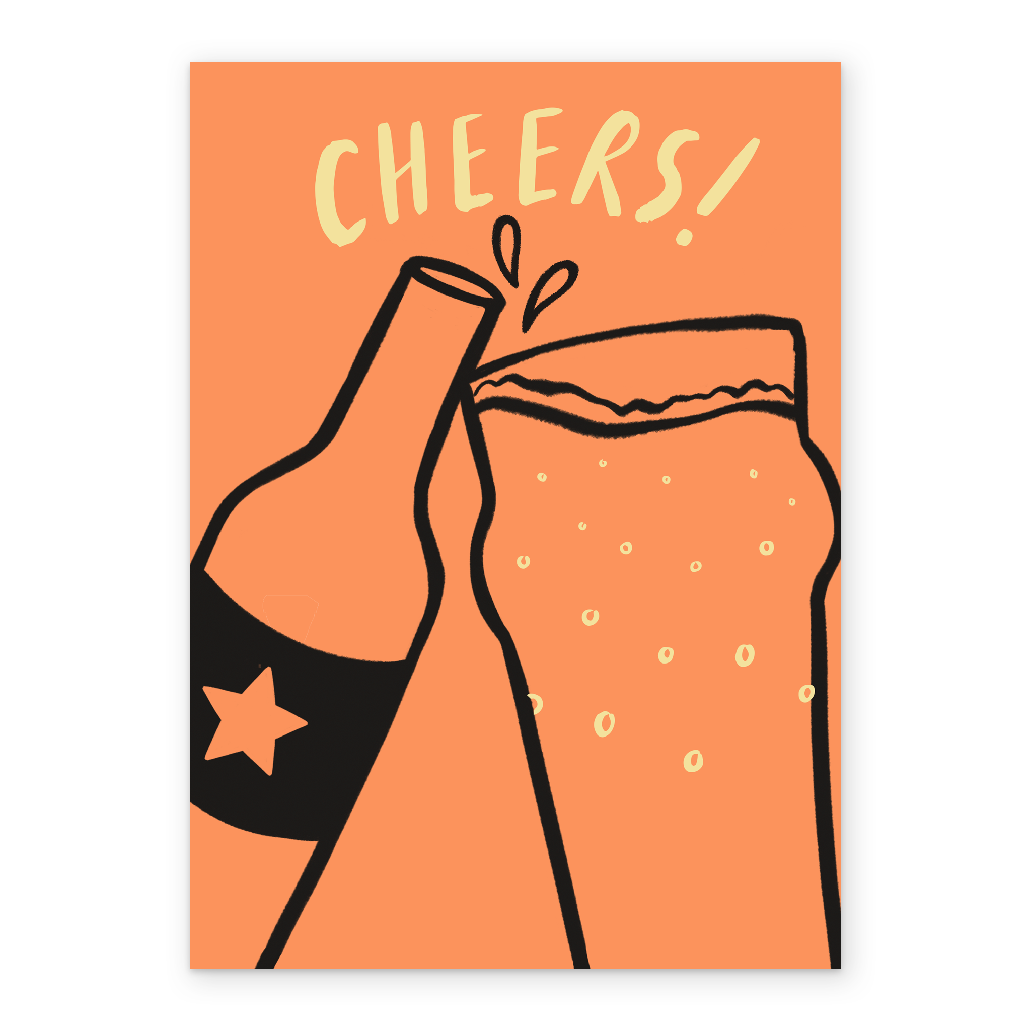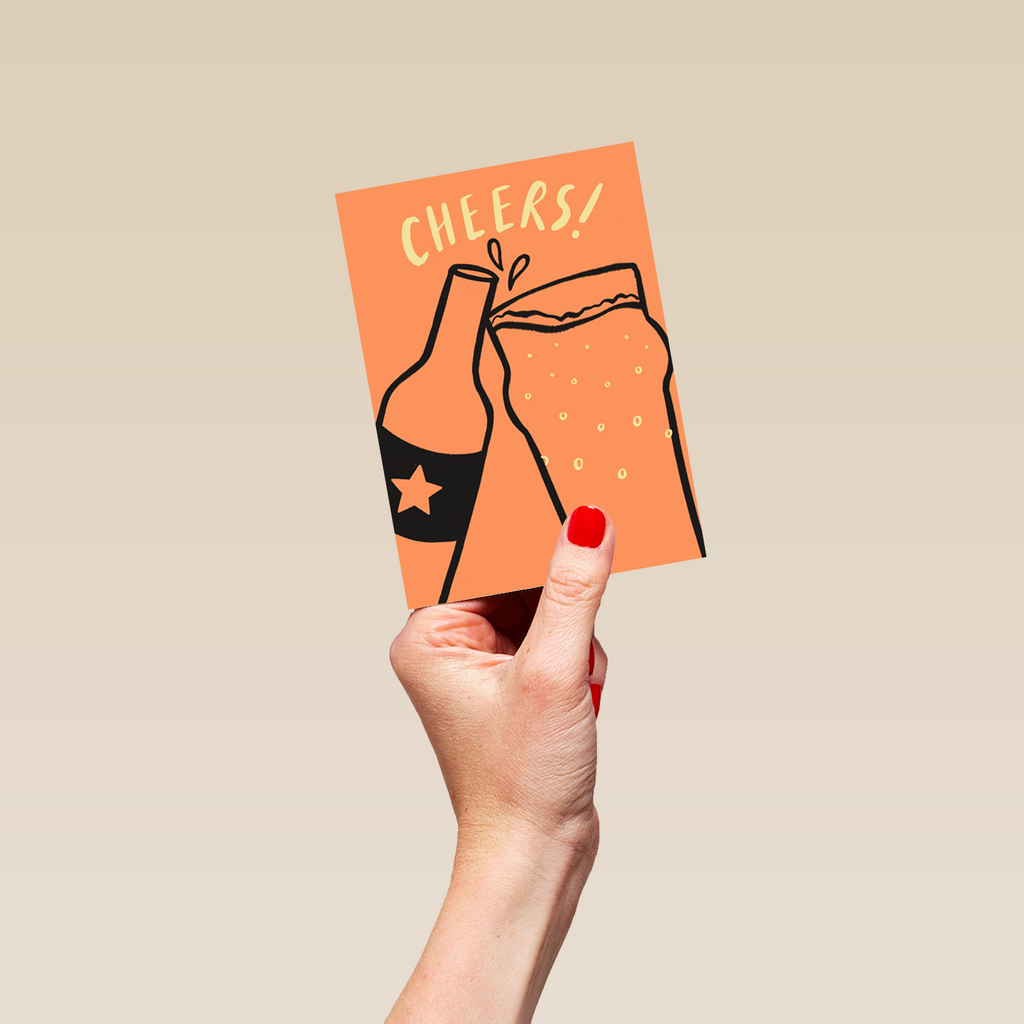 Printed on premium-quality board, this card features a beer bottle and pint glass clinking together, with the message 'Cheers!', and comes complete with a co-ordinating white envelope.