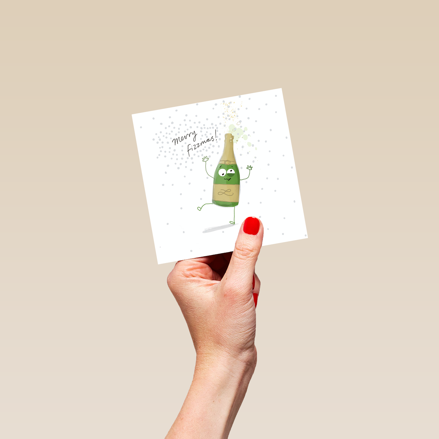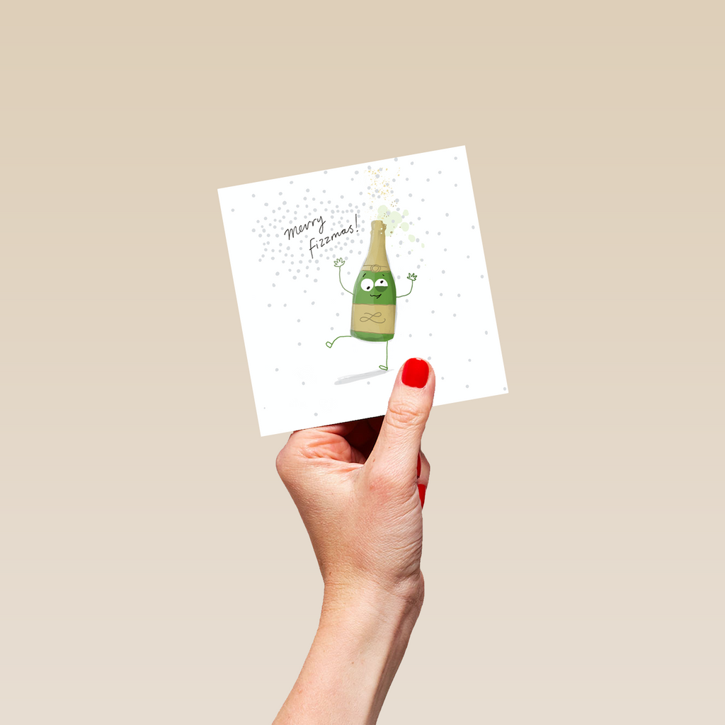 Printed on premium-quality board, this card features a fun illustrated bottle of fizz, on a white and grey-spotted background, with the message 'Merry Fizzmass!', and comes complete with a co-ordinating white envelope.