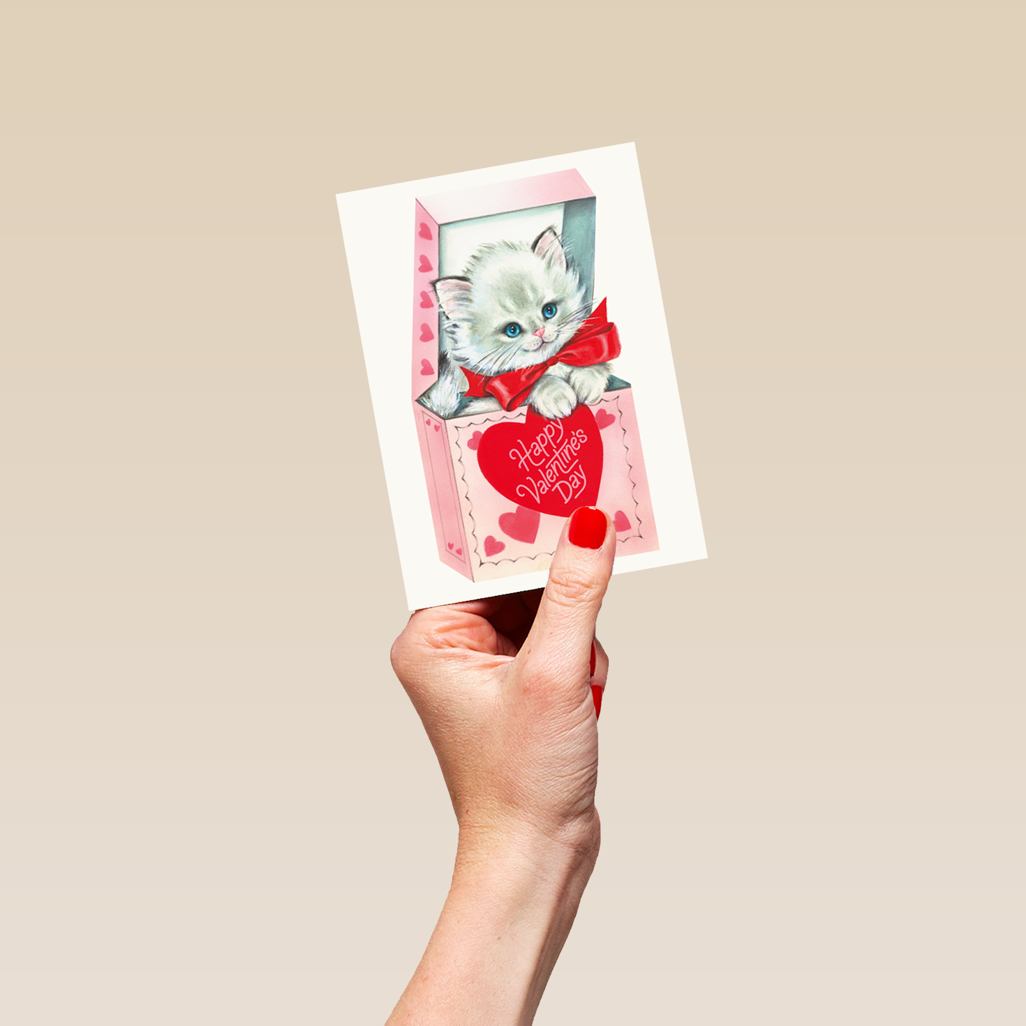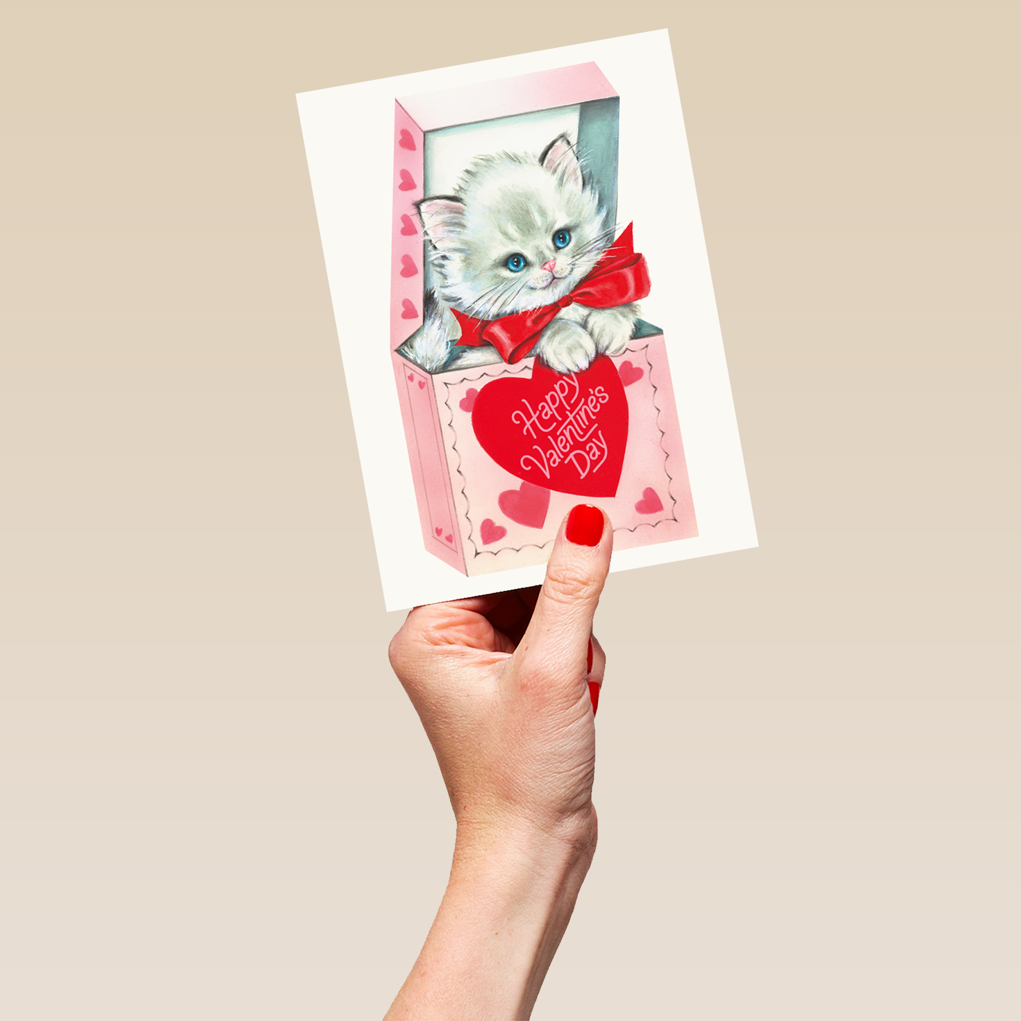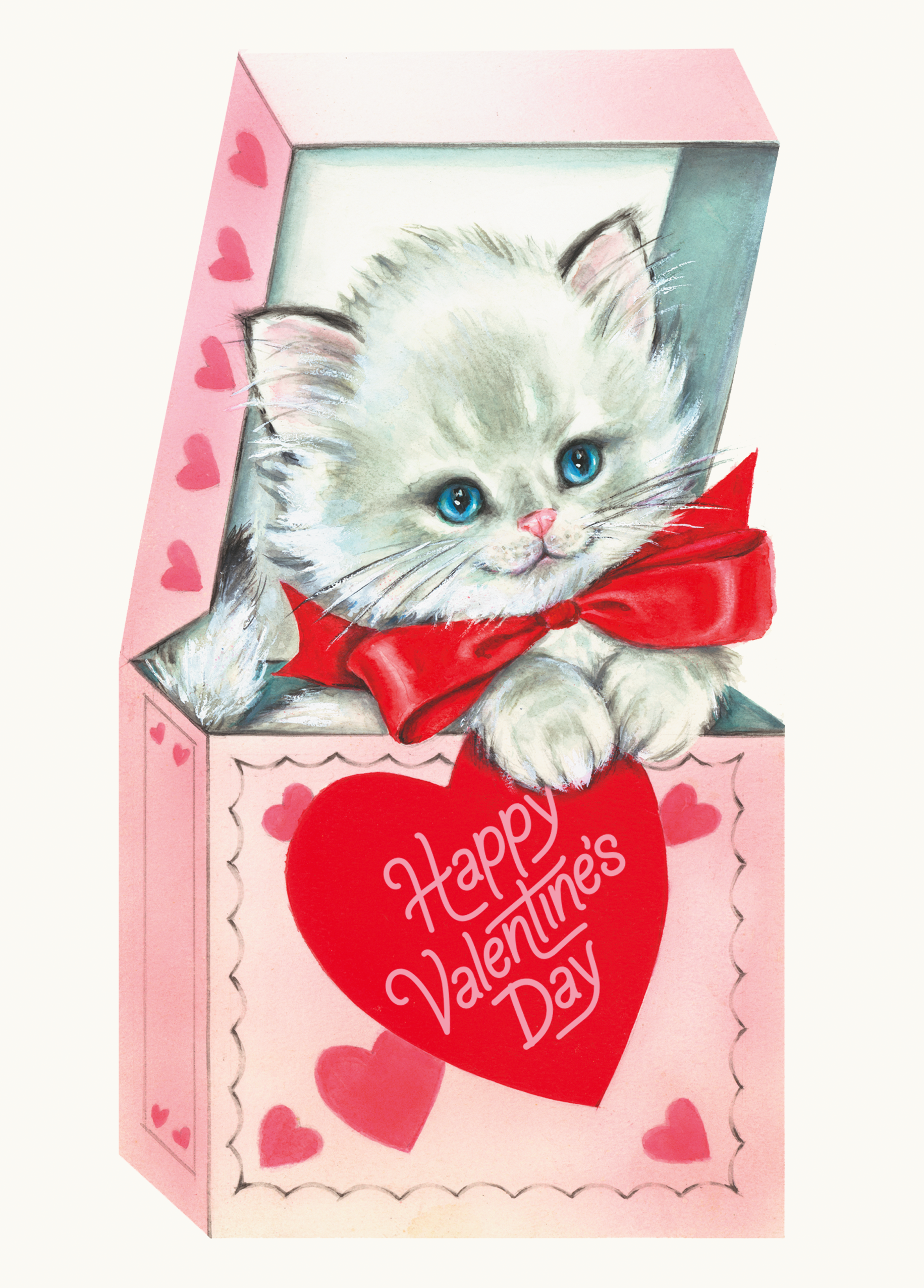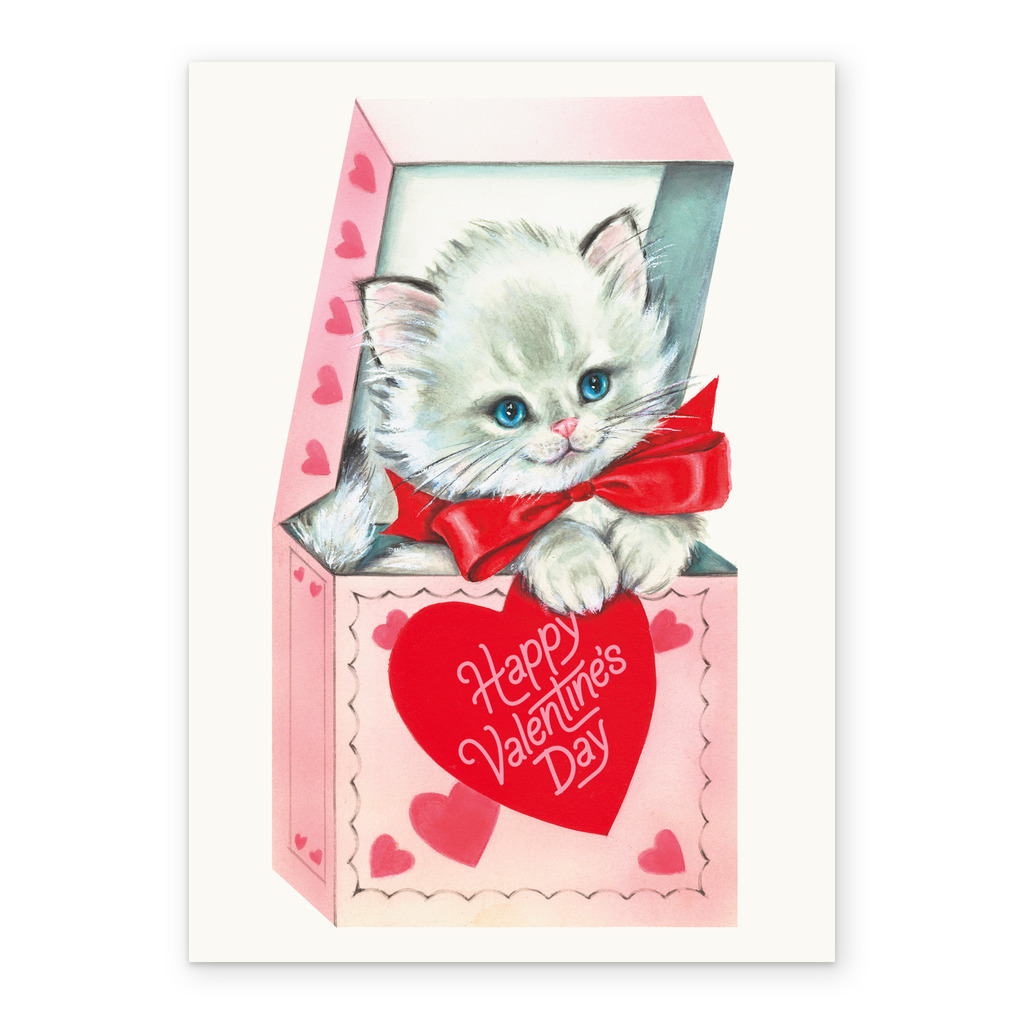 Printed on premium-quality board, this card features a cute kitten wearing a bow in a box with hearts, with the message 'Happy Valentine's Day', and comes complete with a co-ordinating white envelope.