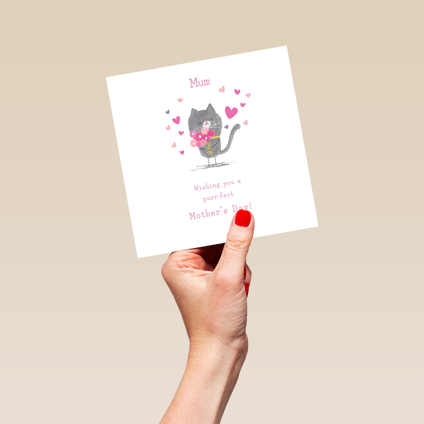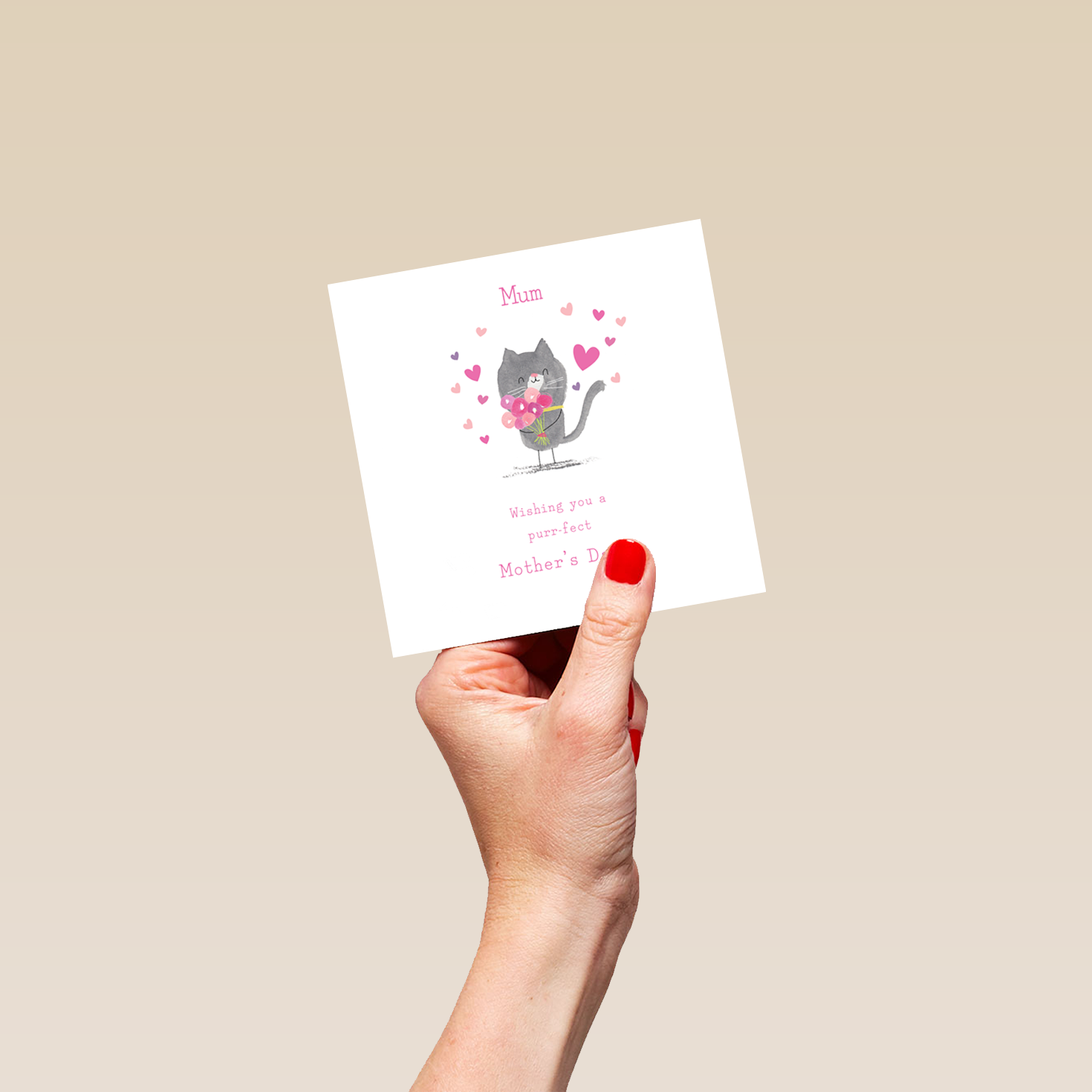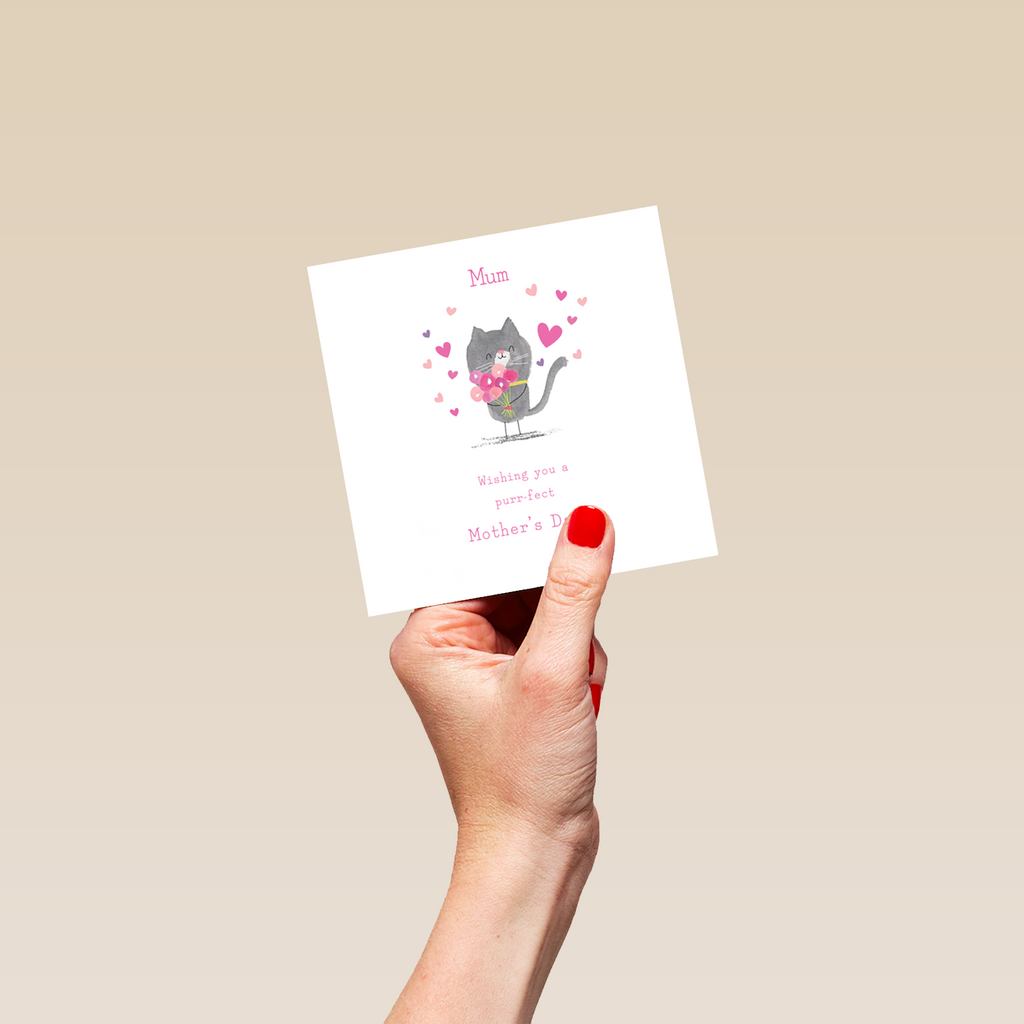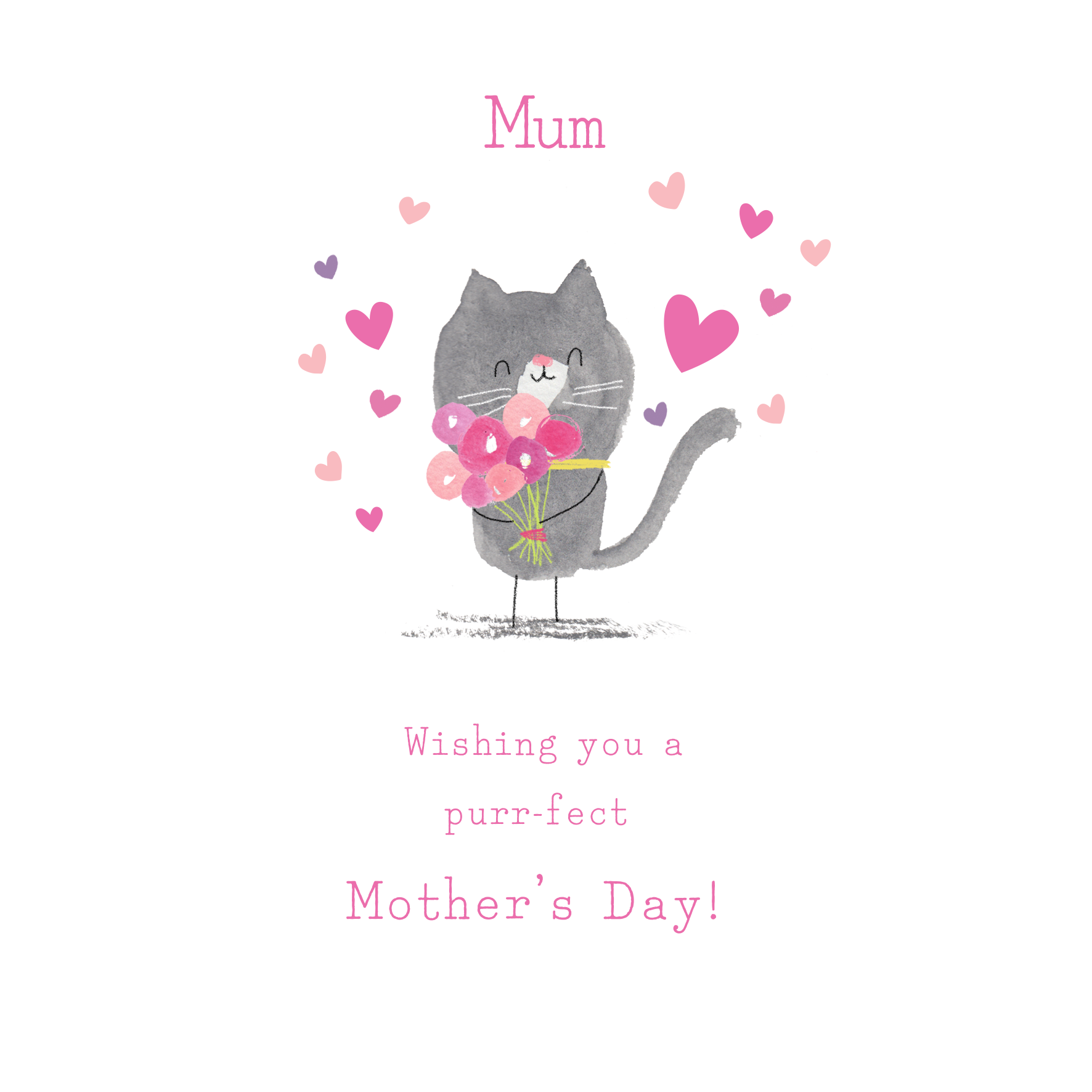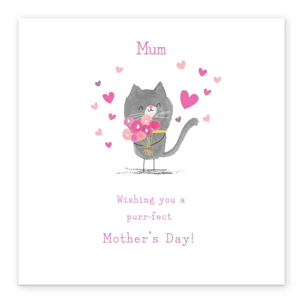 Printed on premium-quality board, this card features a cute cat, hugging flowers and surrounded by hearts, with the message 'Mum, Wishing you a purr-fect Mother's Day', space to personalise a name, and comes complete with a co-ordinating white envelope.