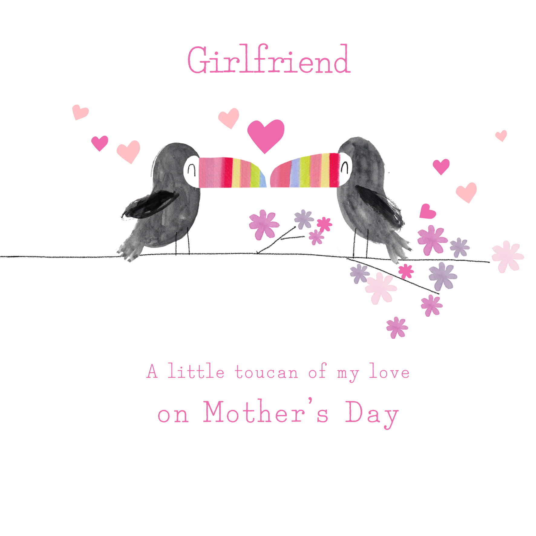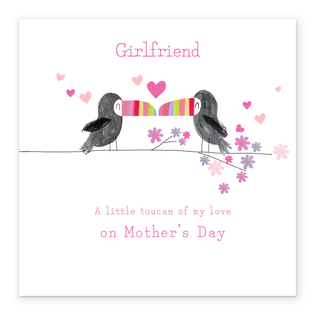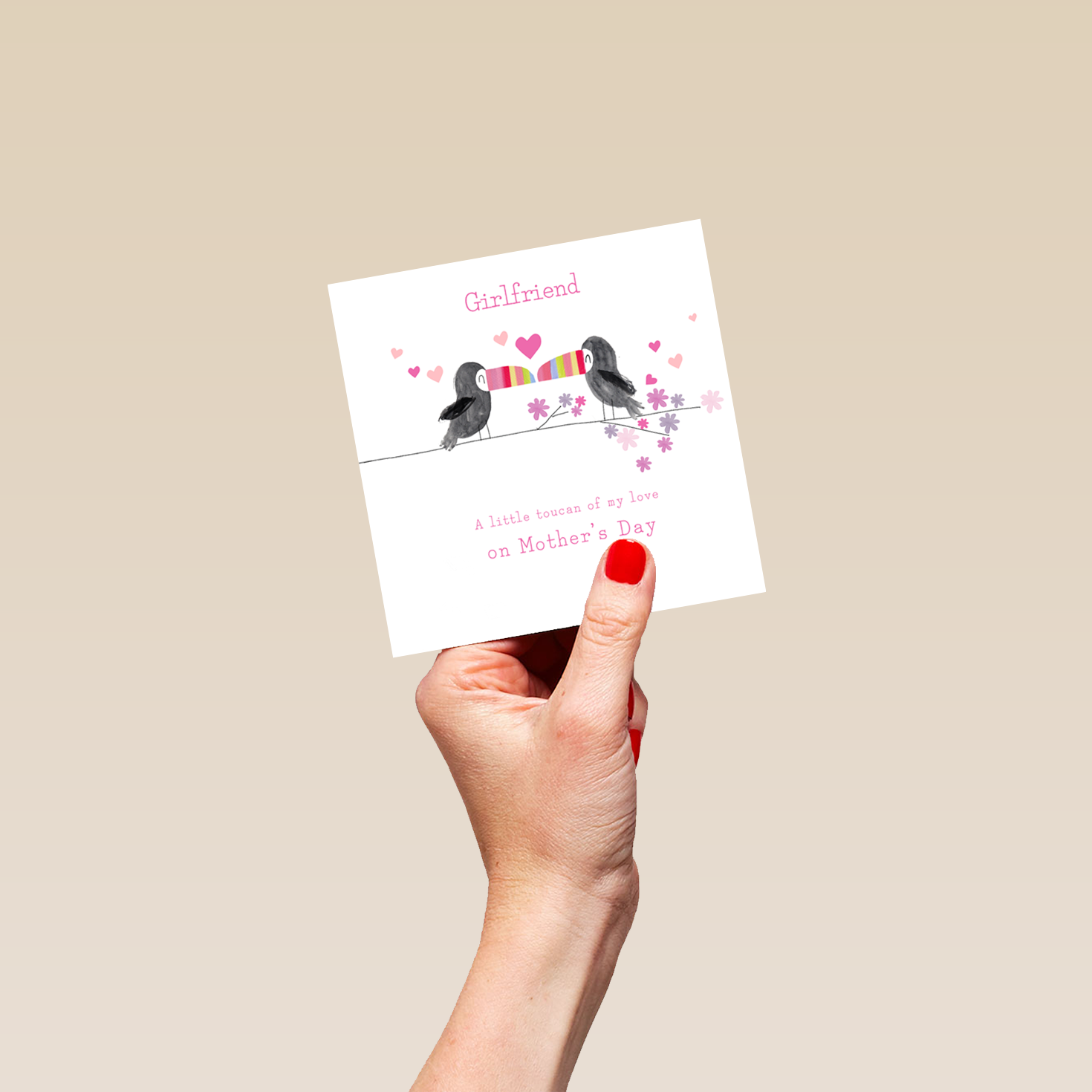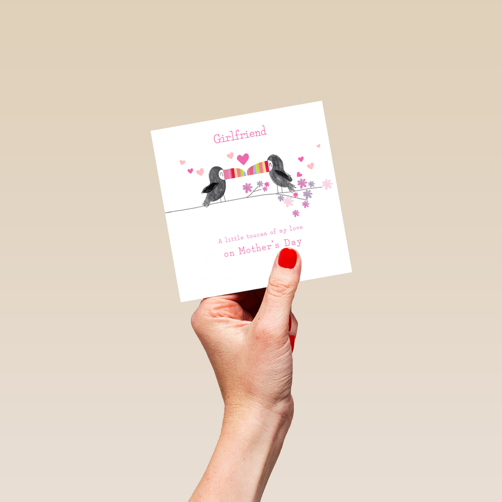 Printed on premium-quality board, this card features 2 cute toucans kissing on a tree, with the message 'Girlfriend, A little toucan of my love on Mother's Day', space to personalise a name, and comes complete with a co-ordinating white envelope.
