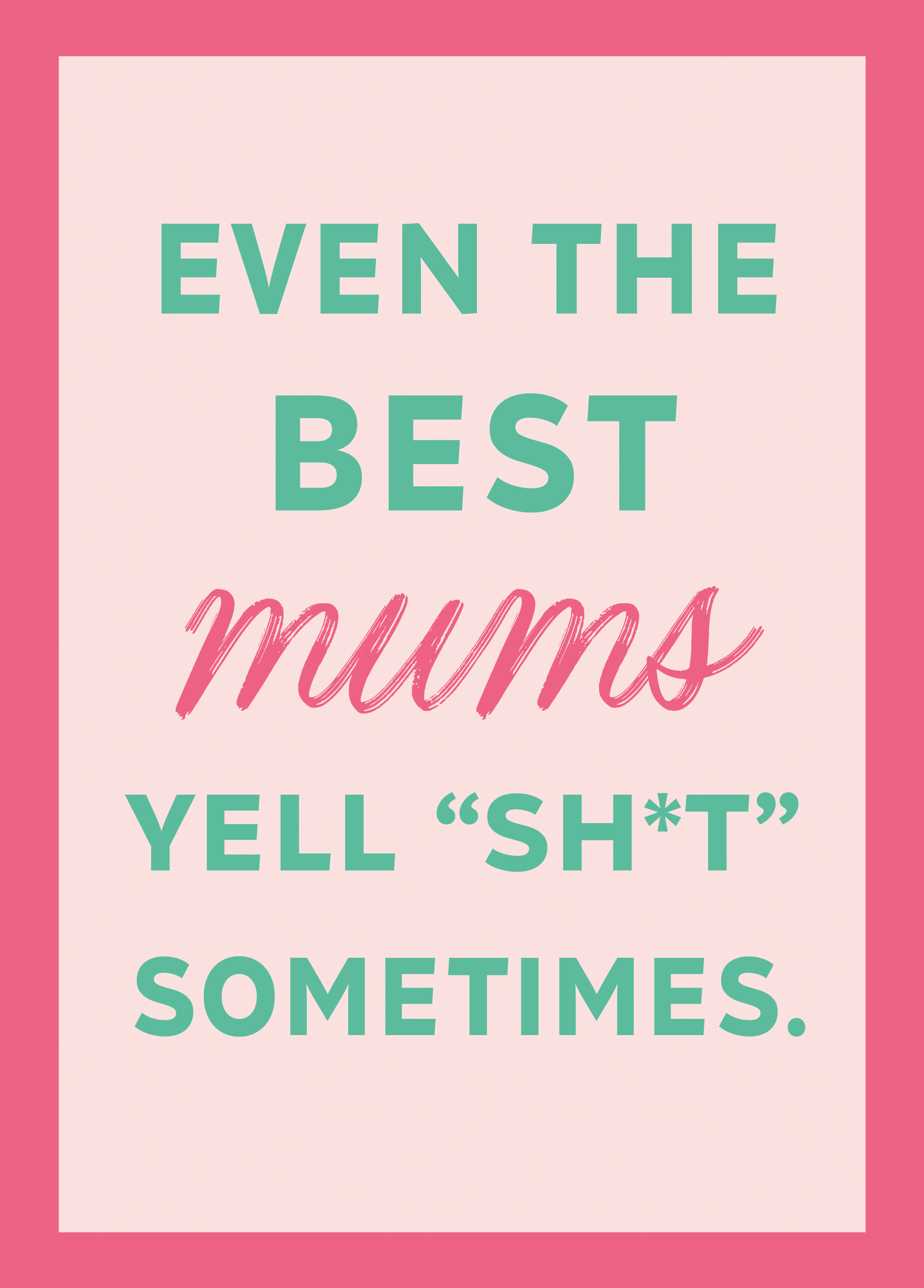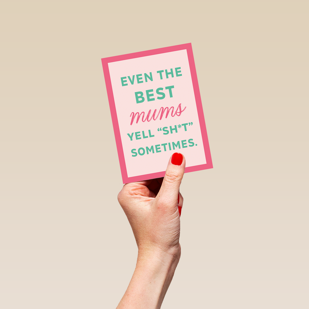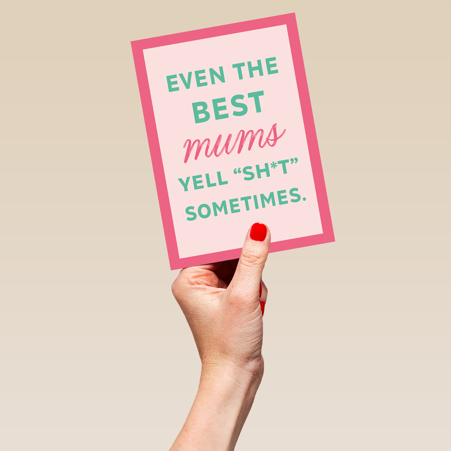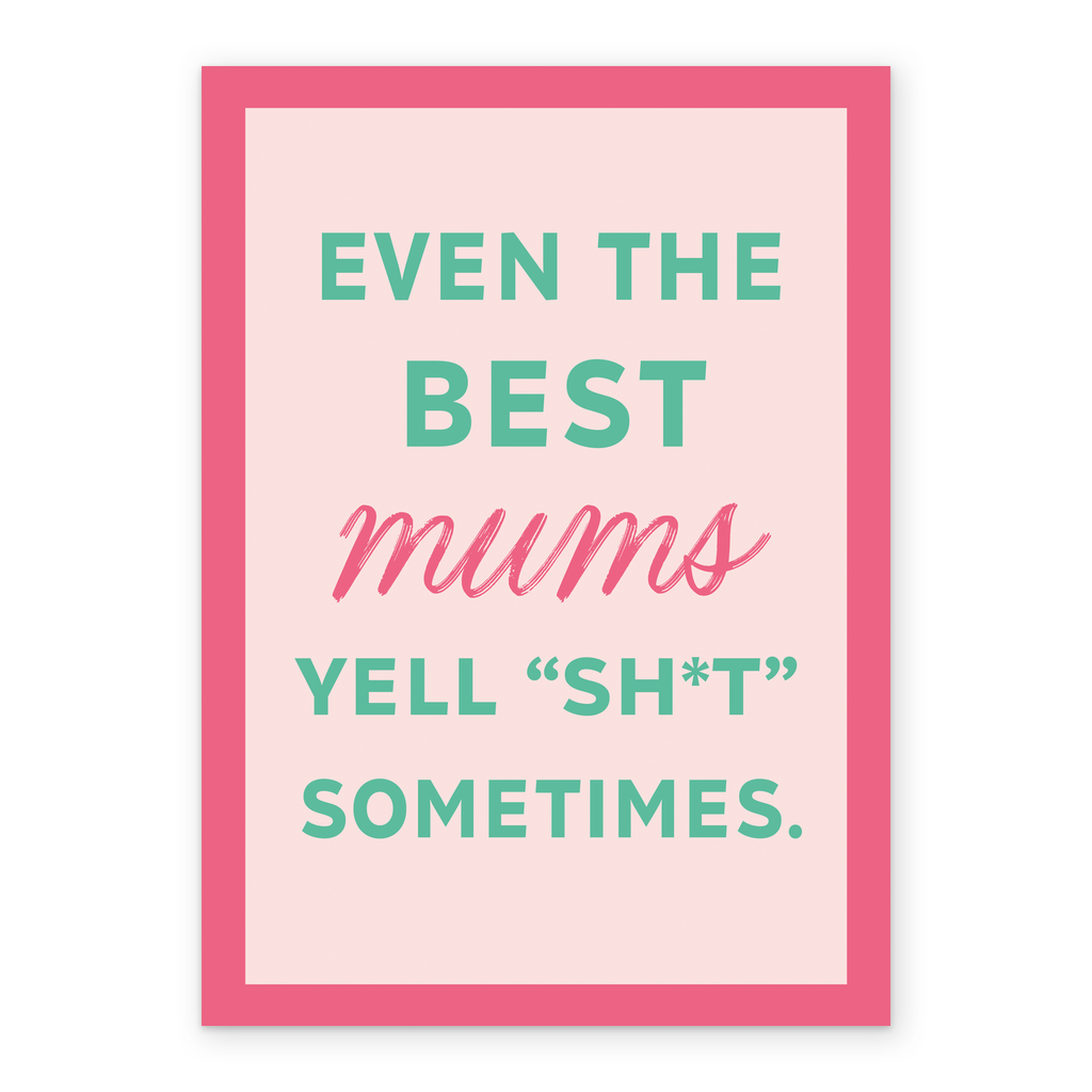 Printed on premium-quality board, this card features a dark pink border and light background with turquoise and pink lettering, with the message 'Even the best mums yell "sh*t" sometimes.', space to personalise your message, and comes complete with a co-ordinating white envelope.