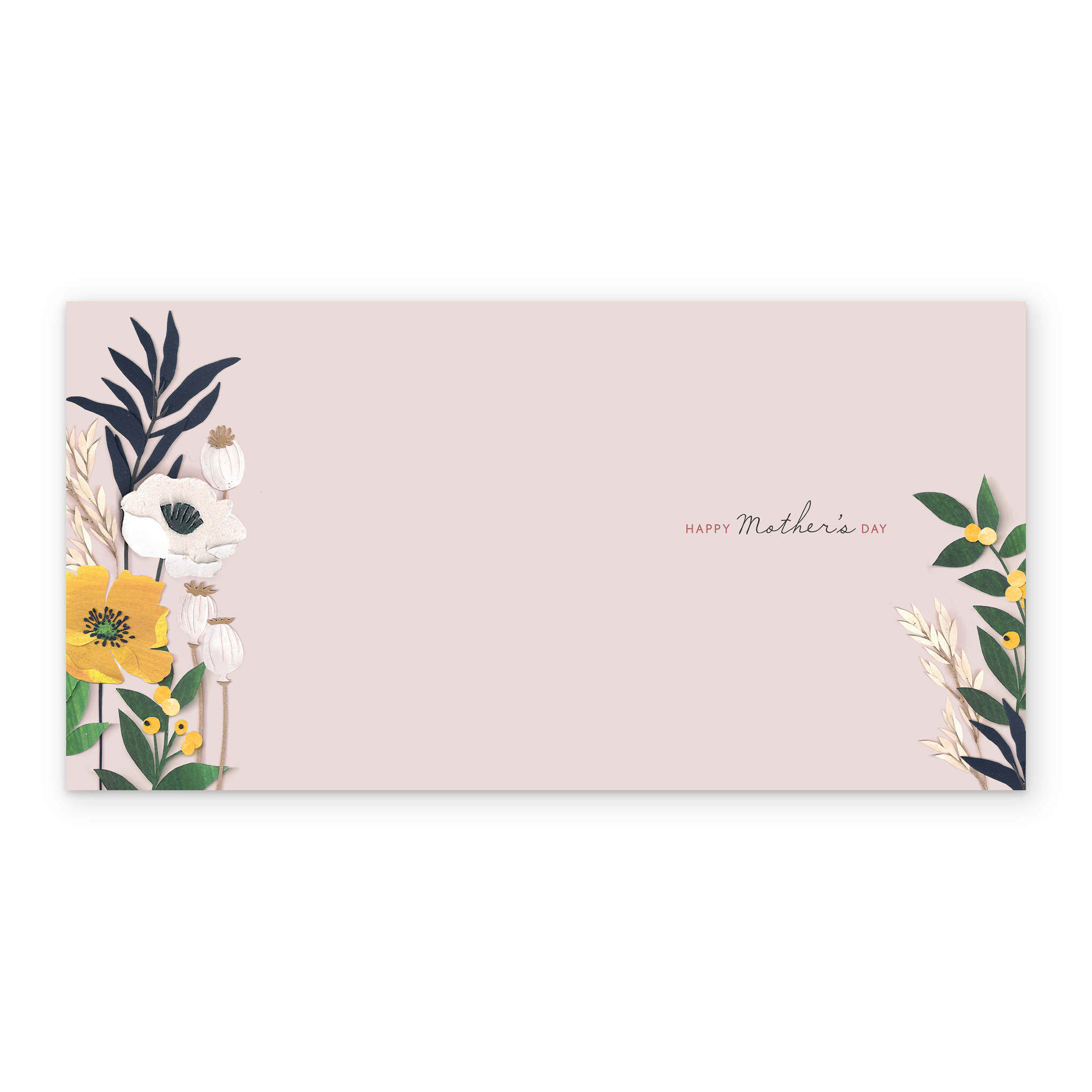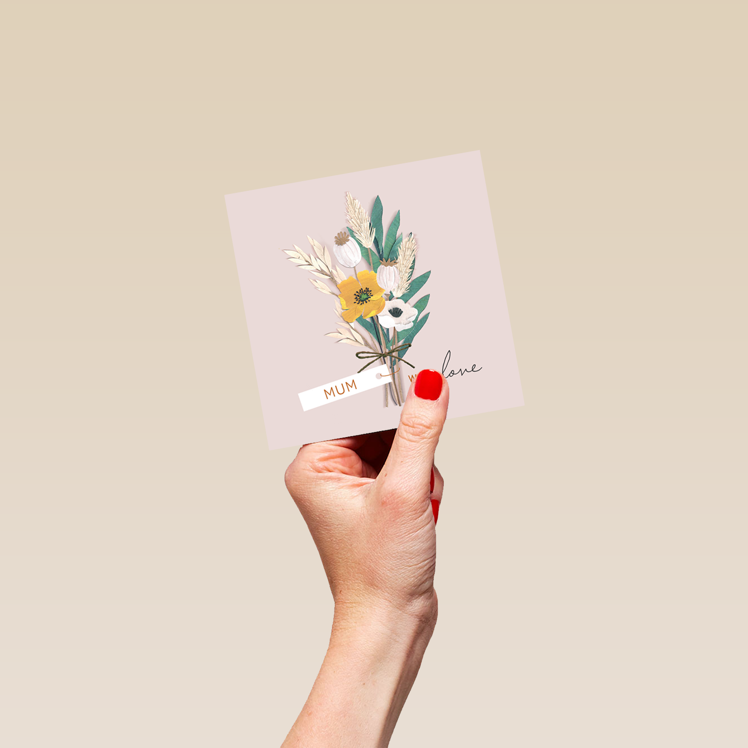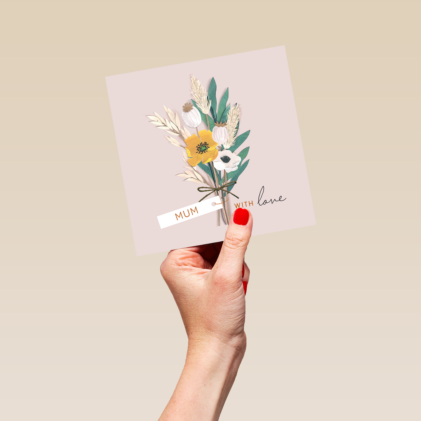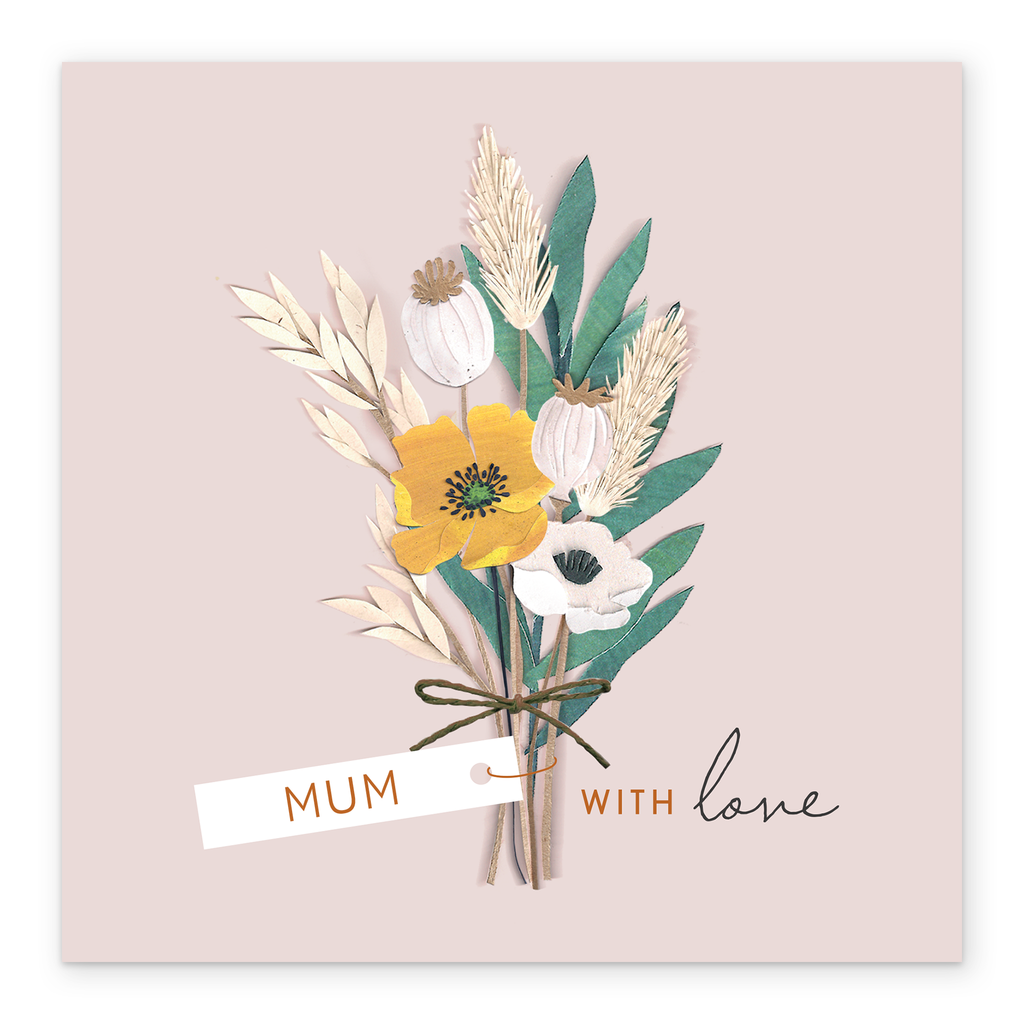 Printed on premium-quality board, this card features a pink background with a flower arrangement, with the message 'MUM with love', space to personalise a name, and comes complete with a co-ordinating white envelope.
