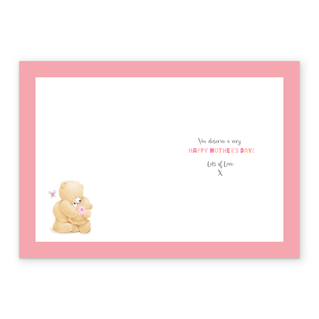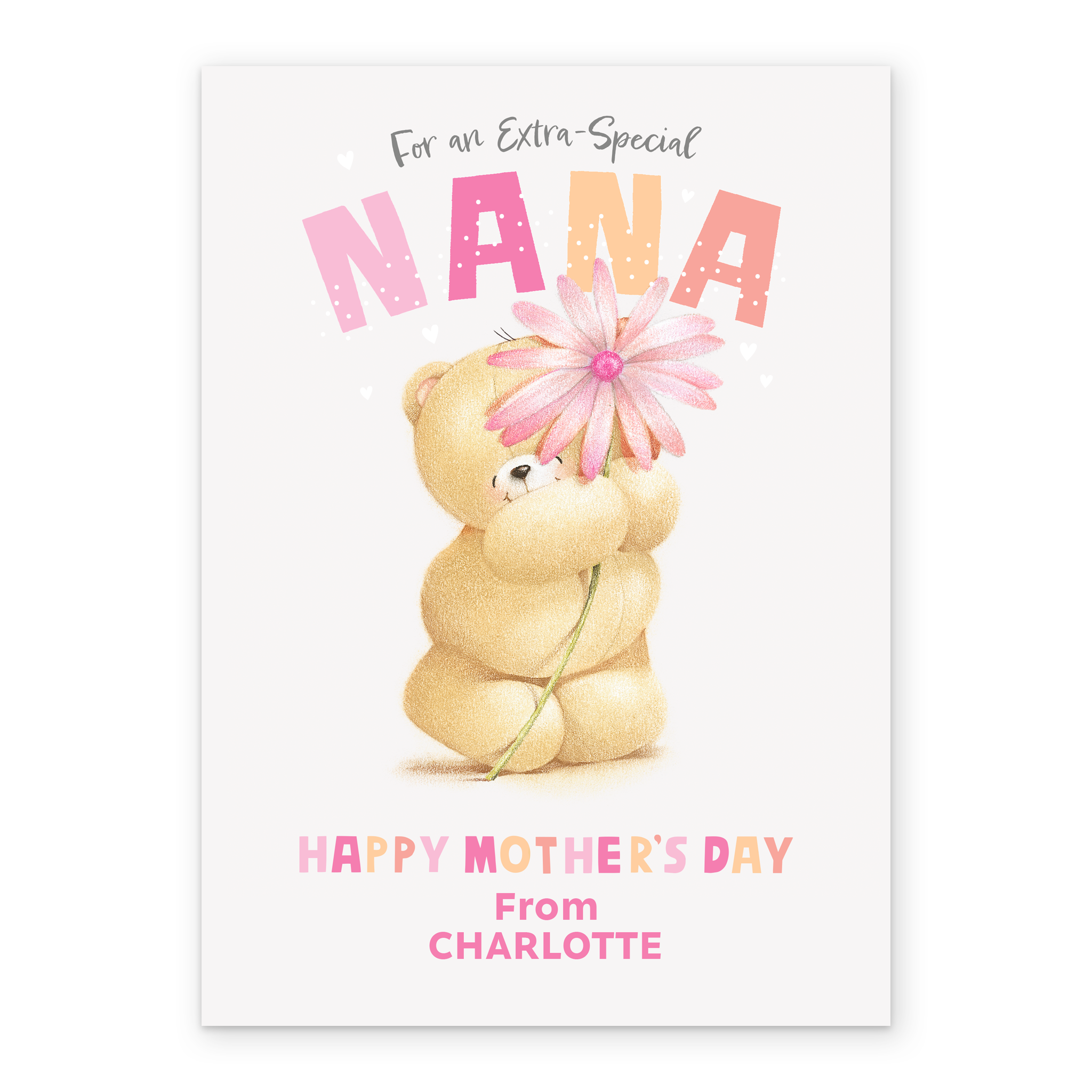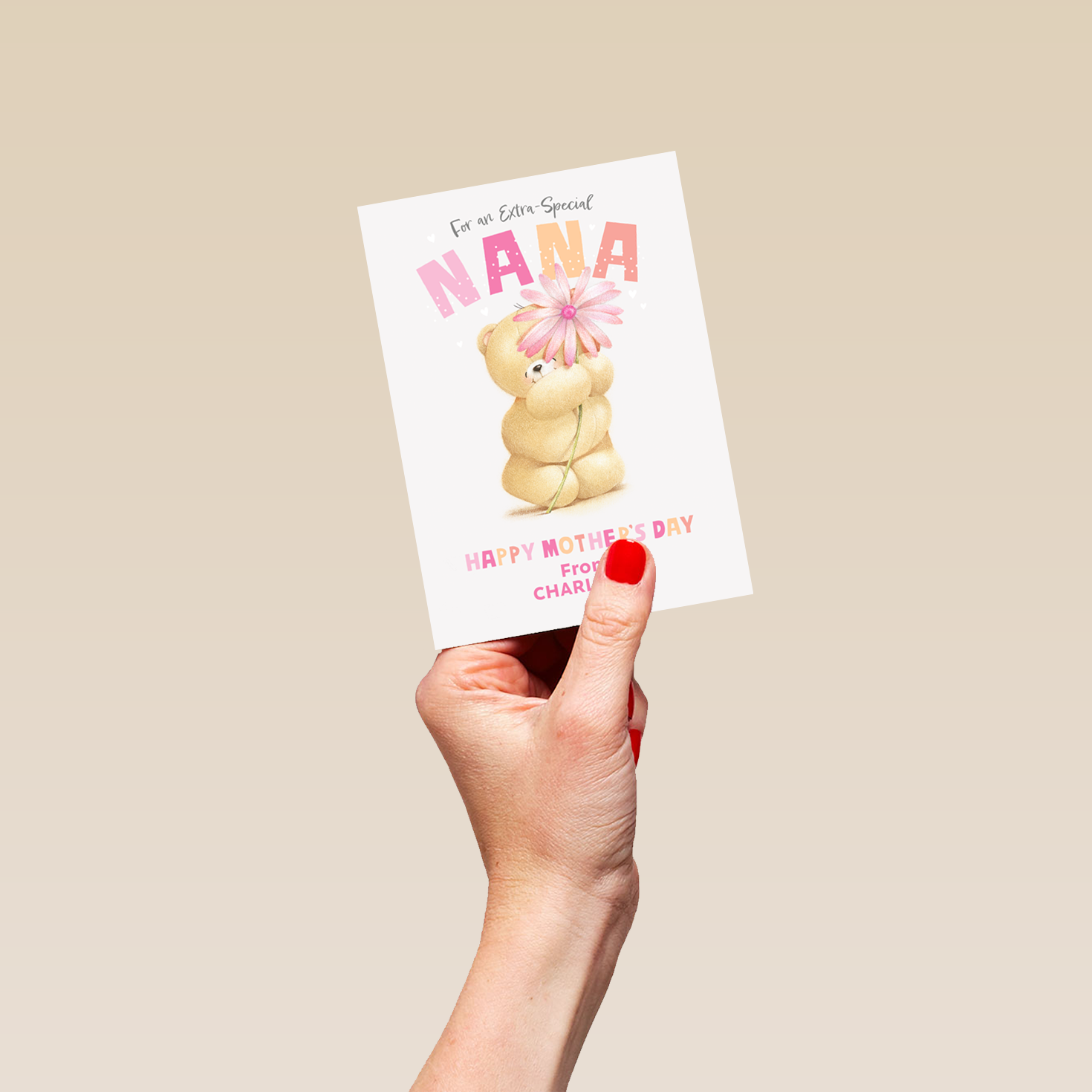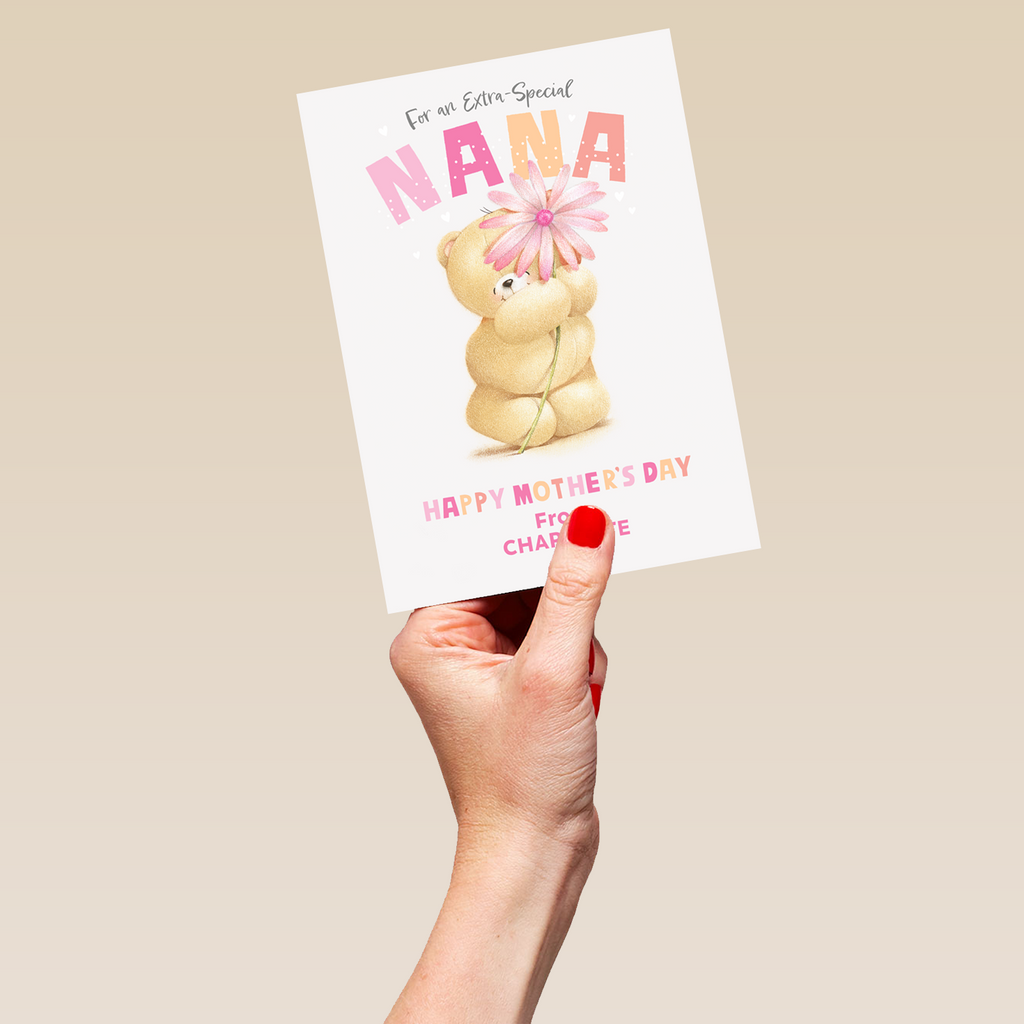 Printed on premium-quality board, this card features Hallmark's timeless Forever Friends Bear holding a large pink flower, with the message 'For an Extra-Special Nana. Happy Mother's Day FROM [NAME]', space to personalise a name, and comes complete with a co-ordinating white envelope.