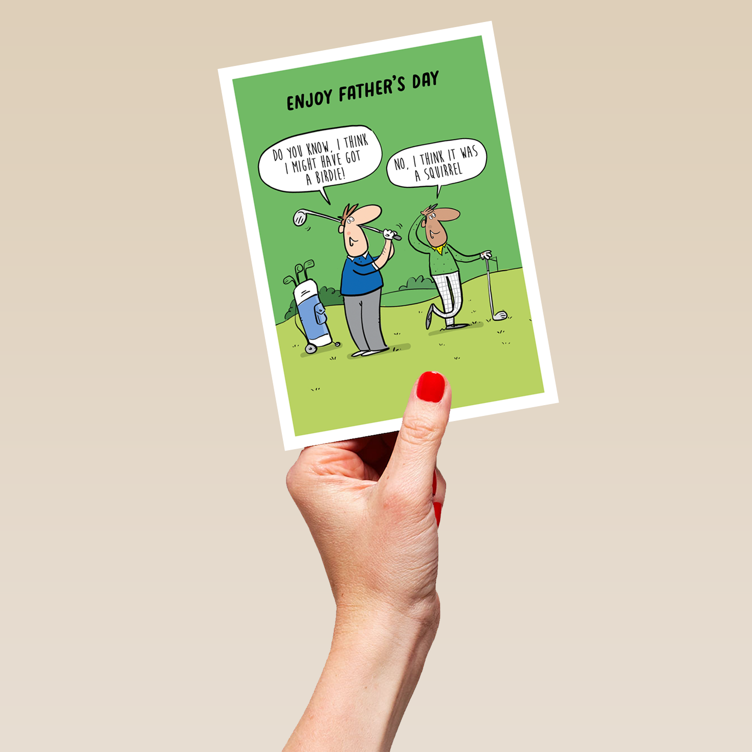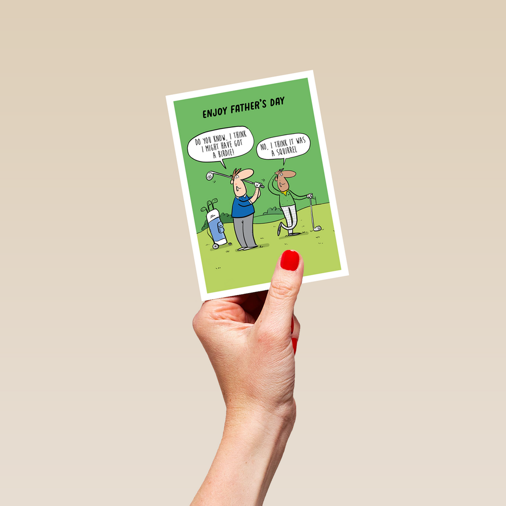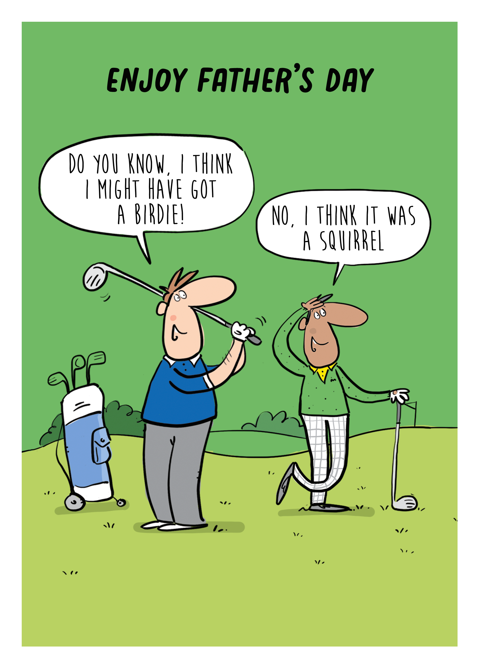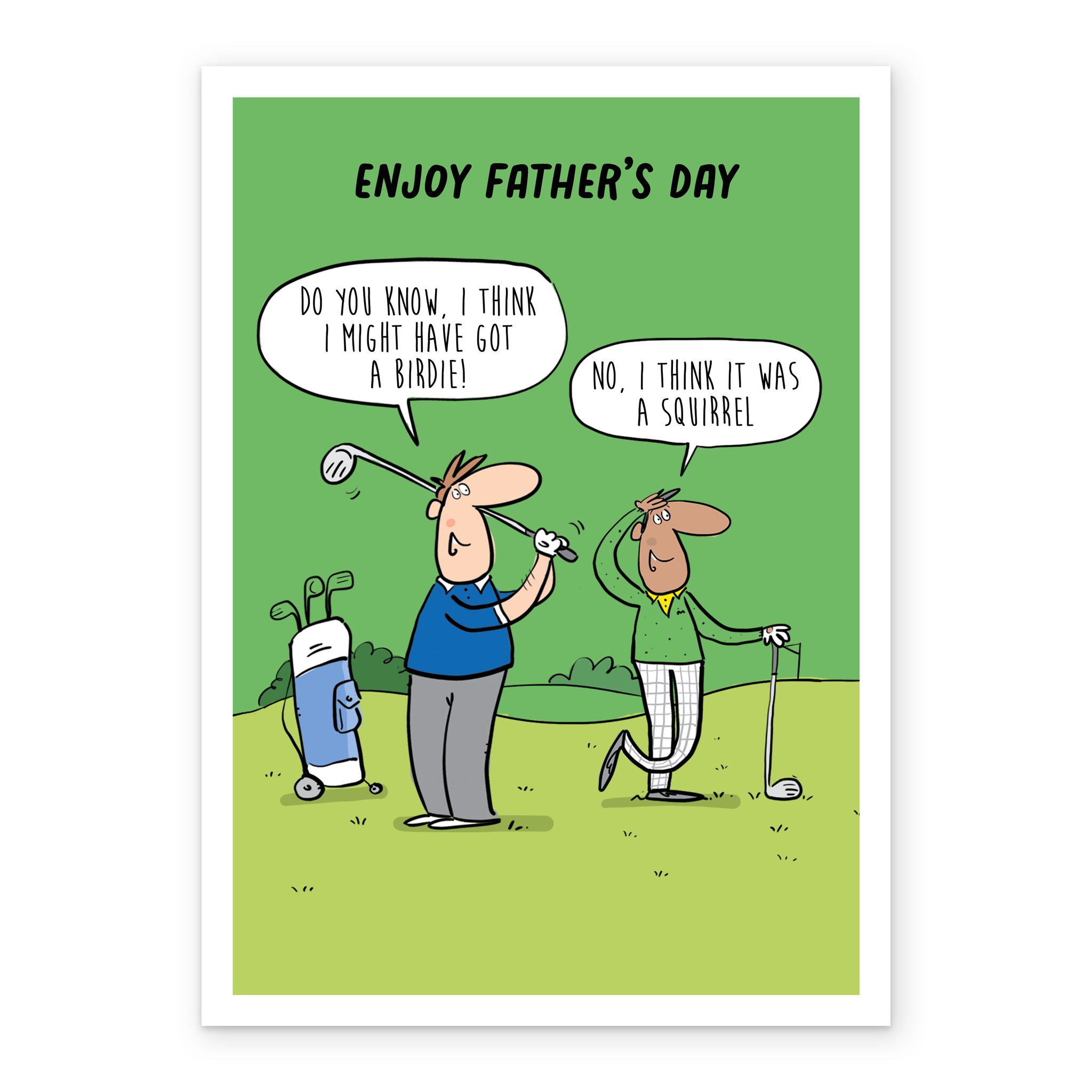 Printed on premium-quality board, this card features a funny illustration of men playing golf, with the message 'Enjoy Father's Day', space to personalise your message, and comes complete with a co-ordinating white envelope.