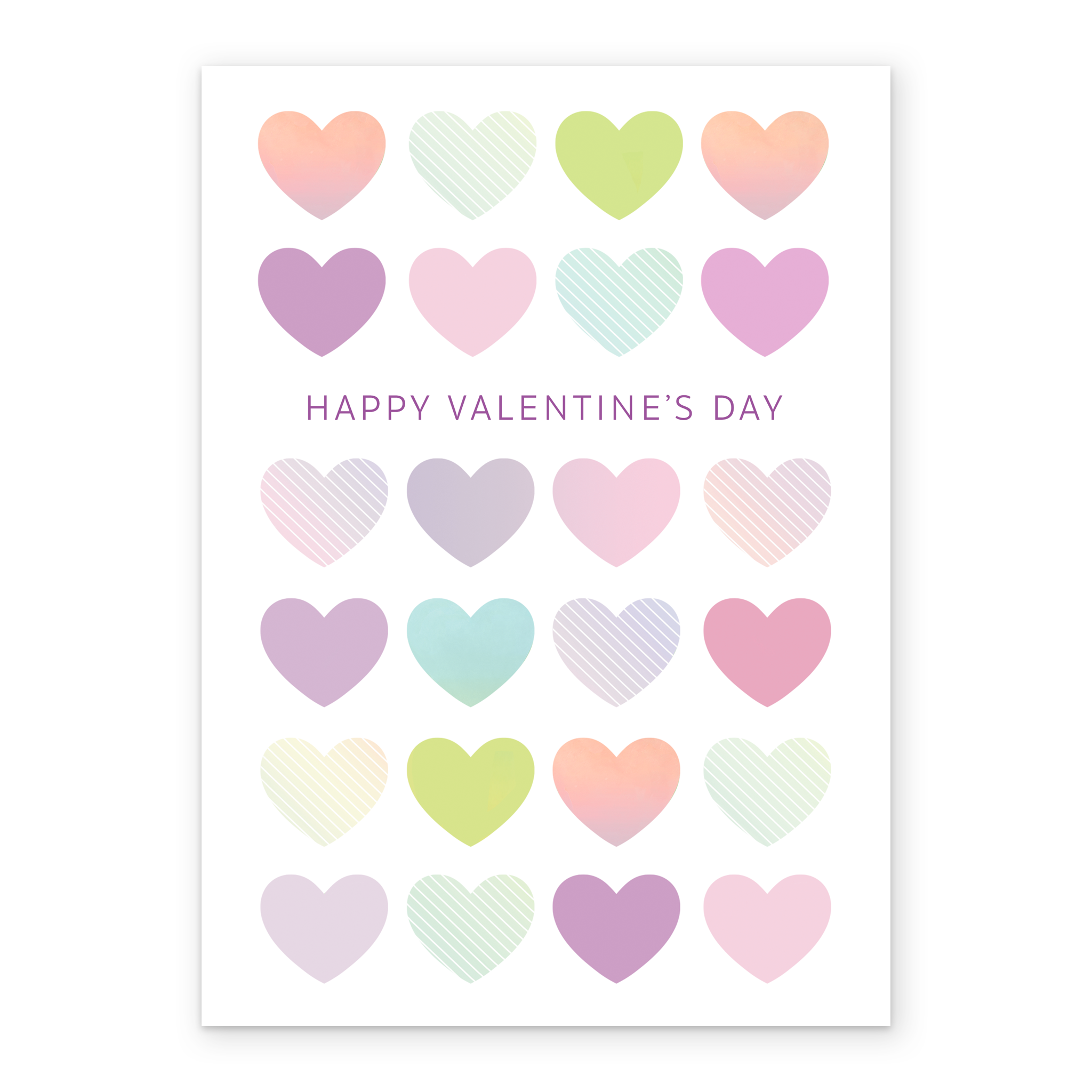 Printed on premium-quality board, this card features pastel coloured hearts, with the message 'Happy Valentine's Day', space to personalise your message, and comes complete with a co-ordinating white envelope.