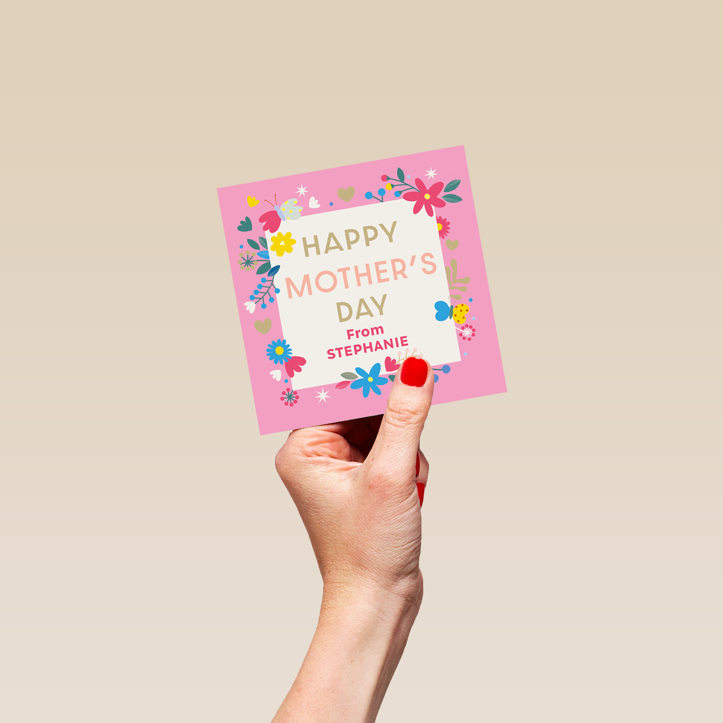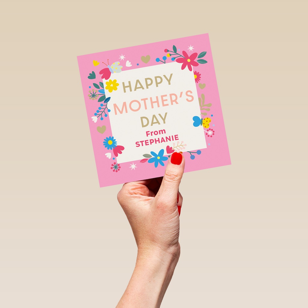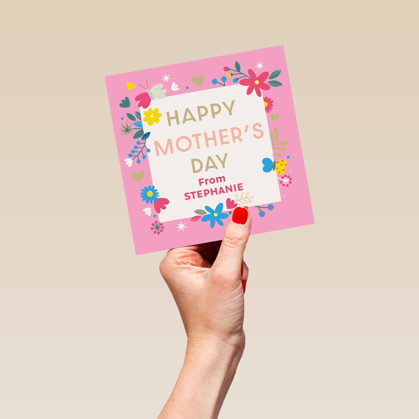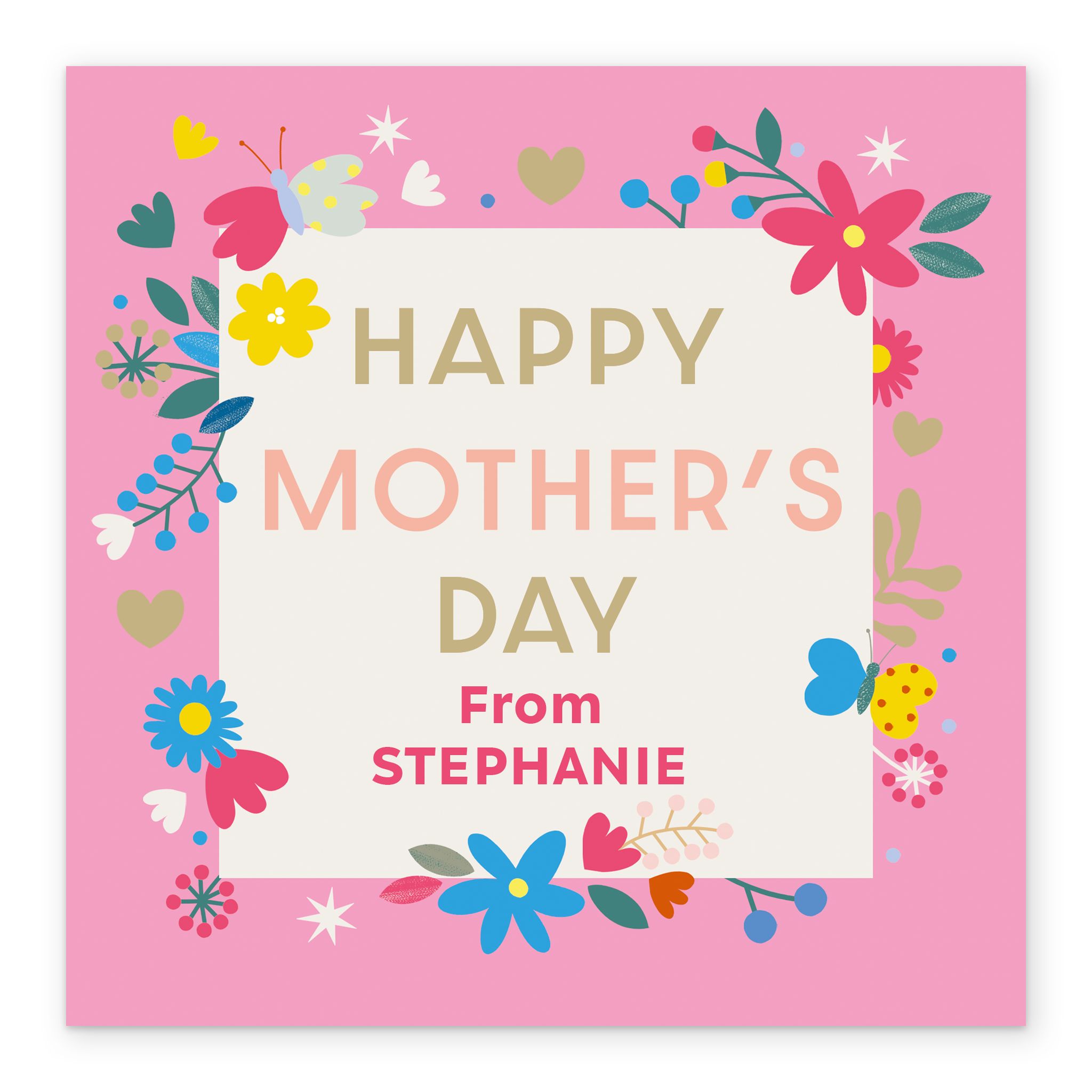 Printed on premium-quality board, this card features a pink border with florals and a Mother's Day wish, with the message 'Happy Mother's Day From [NAME]', space to personalise a name, and comes complete with a co-ordinating white envelope.