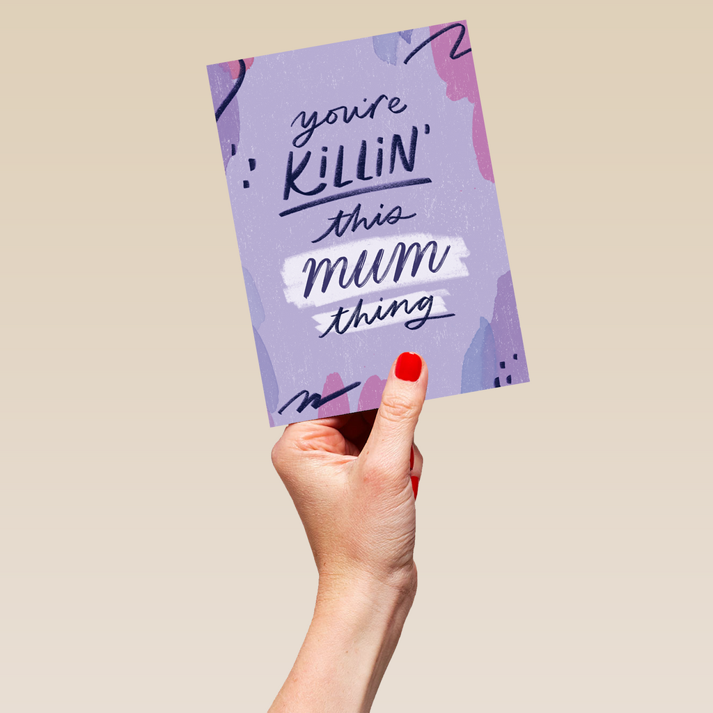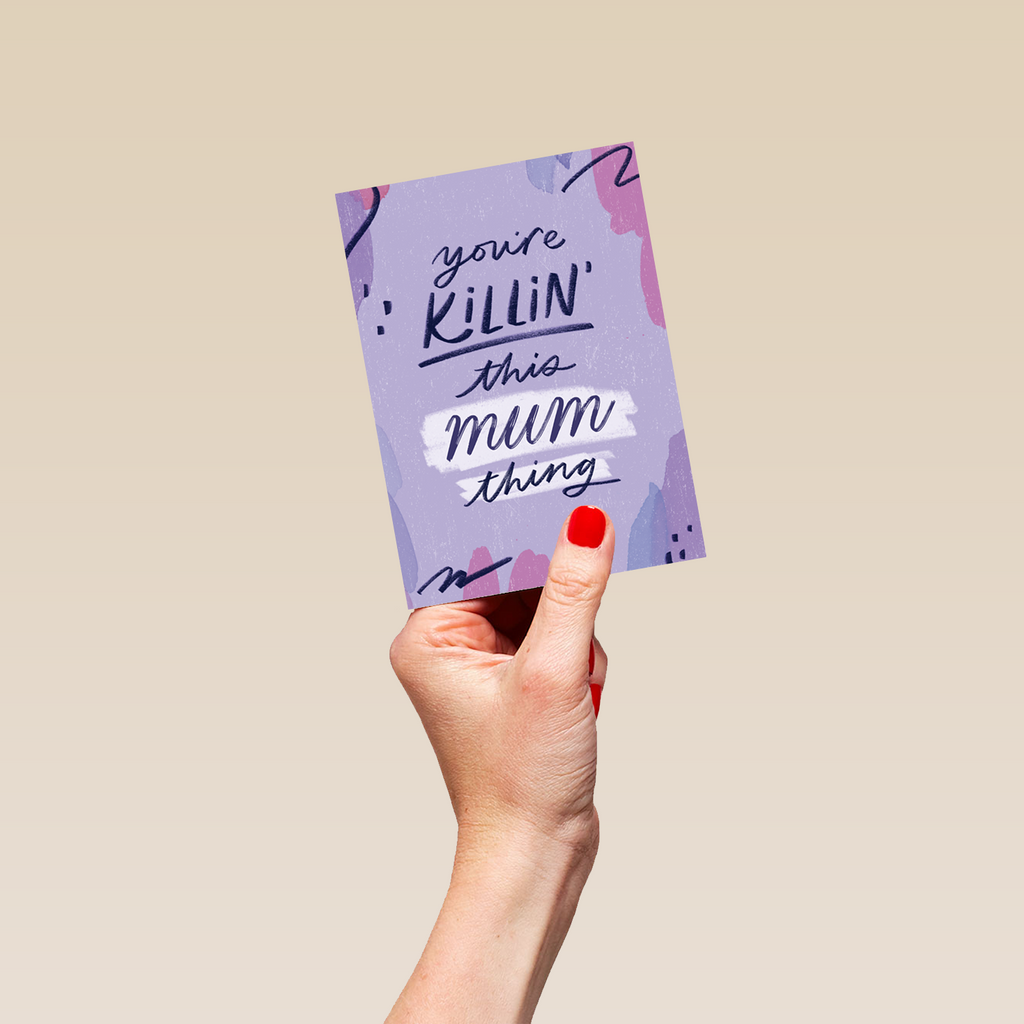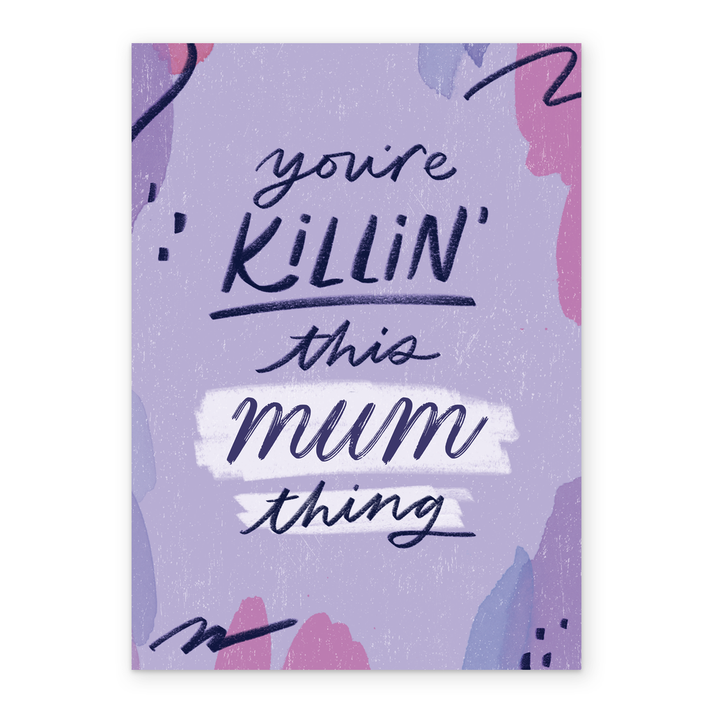 Printed on premium-quality board, this card features a fun purple background with squiggles, with the message 'You're killin' this MUM thing', space to personalise a name, and comes complete with a co-ordinating white envelope.