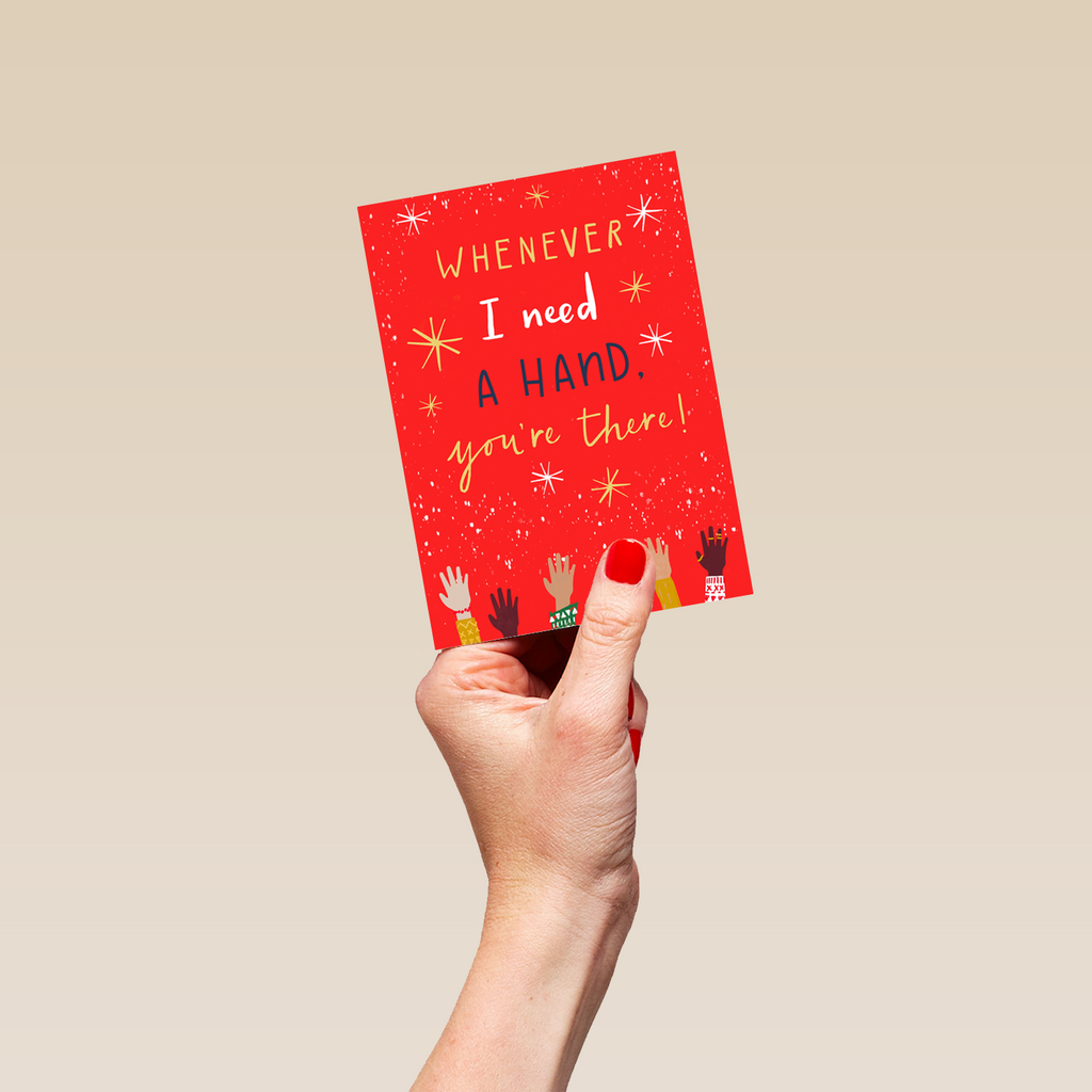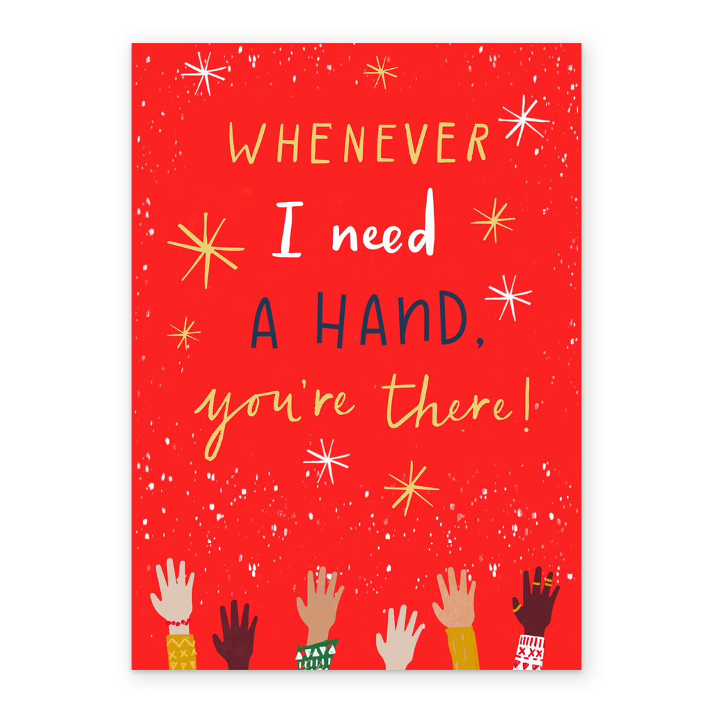 Printed on premium-quality board, this card features a message 'Whenever I need a hand, you're there!', illustrations of different hands, and comes complete with a co-ordinating white envelope.
