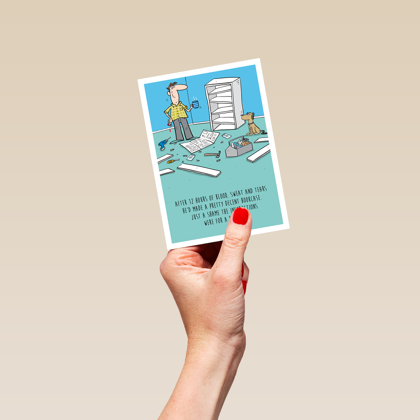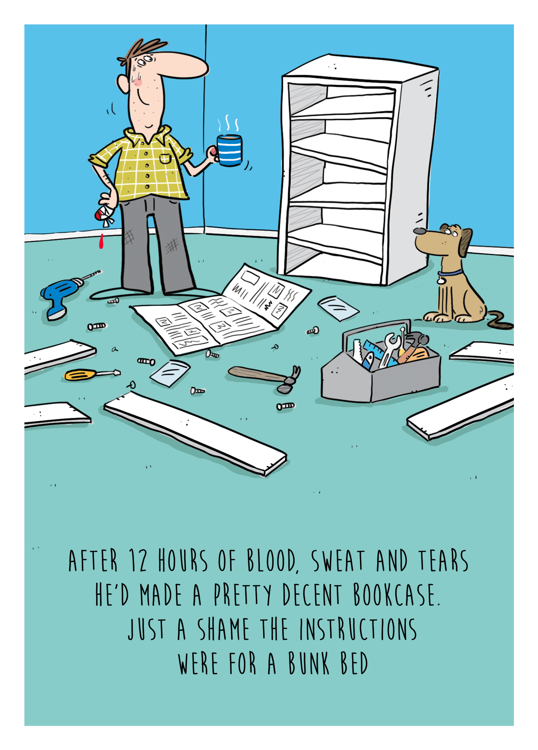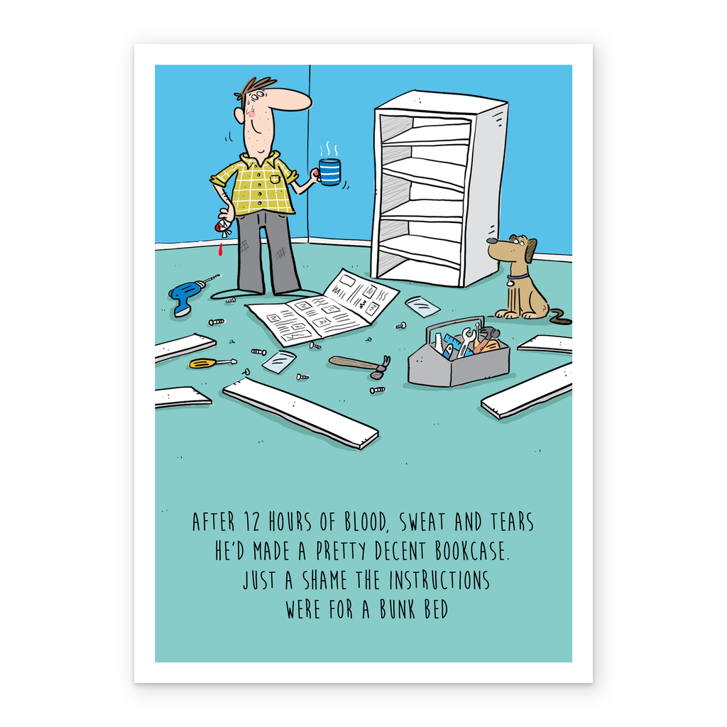 Printed on premium-quality board, this card features a funny illustration of a man stood in front of a broken bookshelf and his dog, with the message 'After 12 hours of blood, sweat and tears he'd made a pretty decent bookcase. Just a shame the instructions were for a bunk bed', and comes complete with a co-ordinating white envelope.