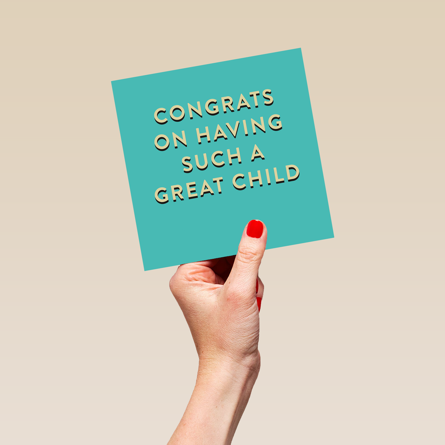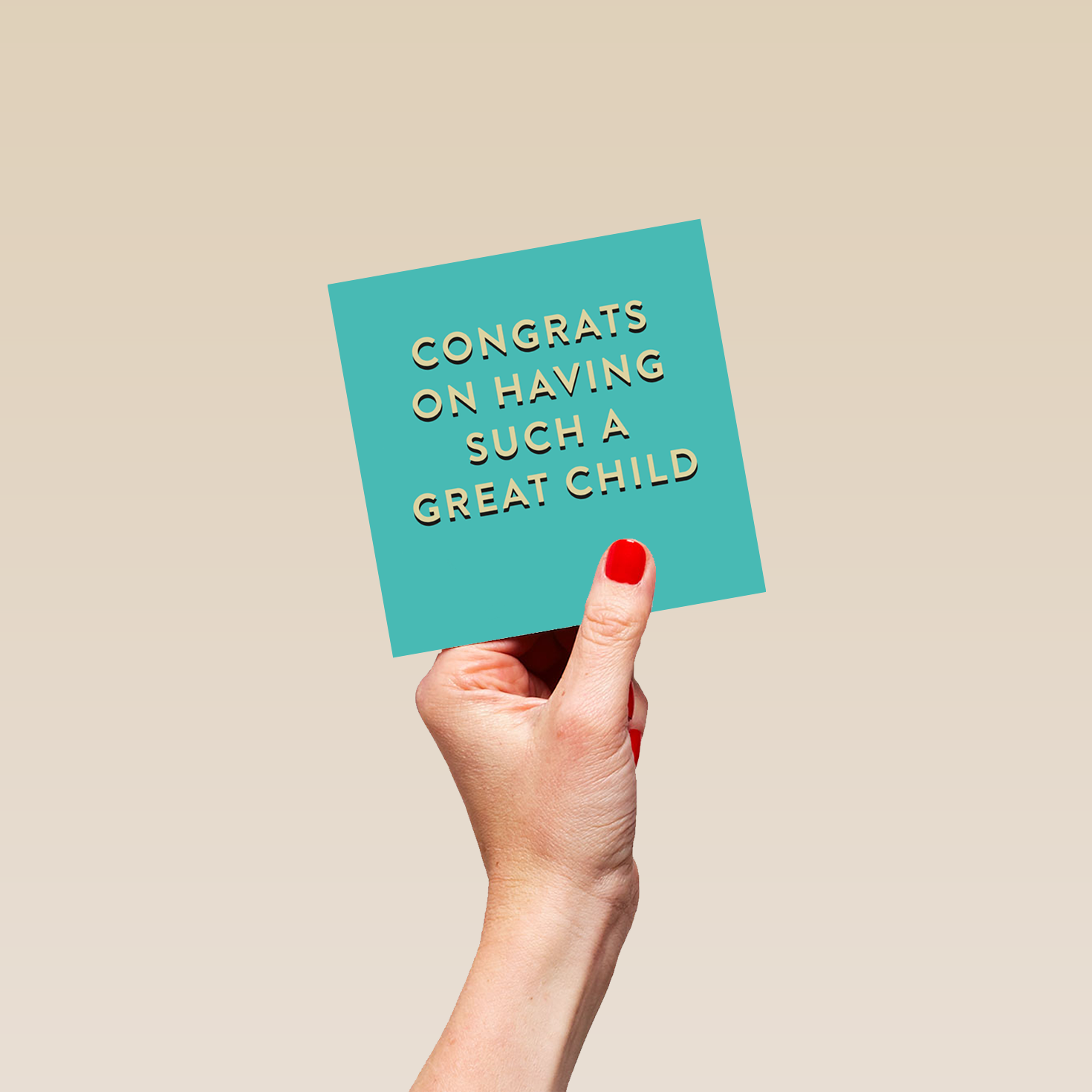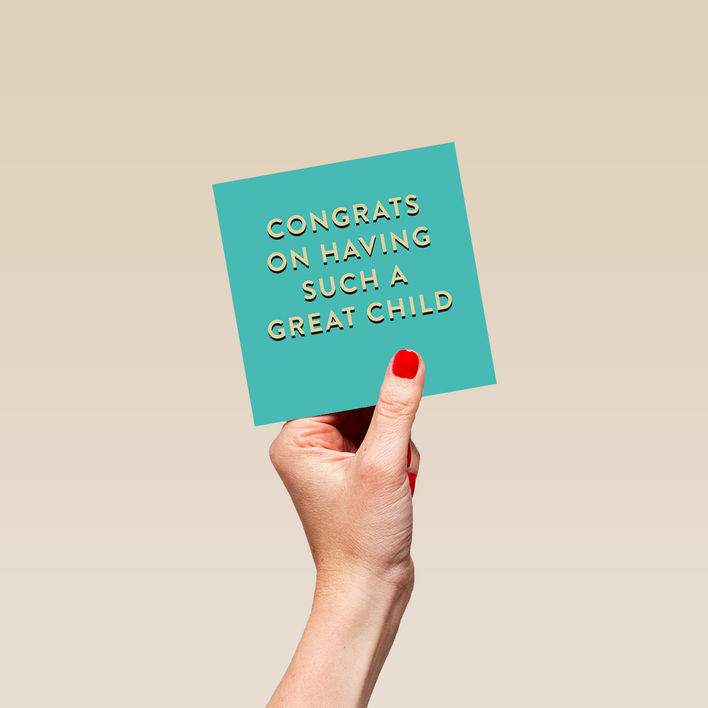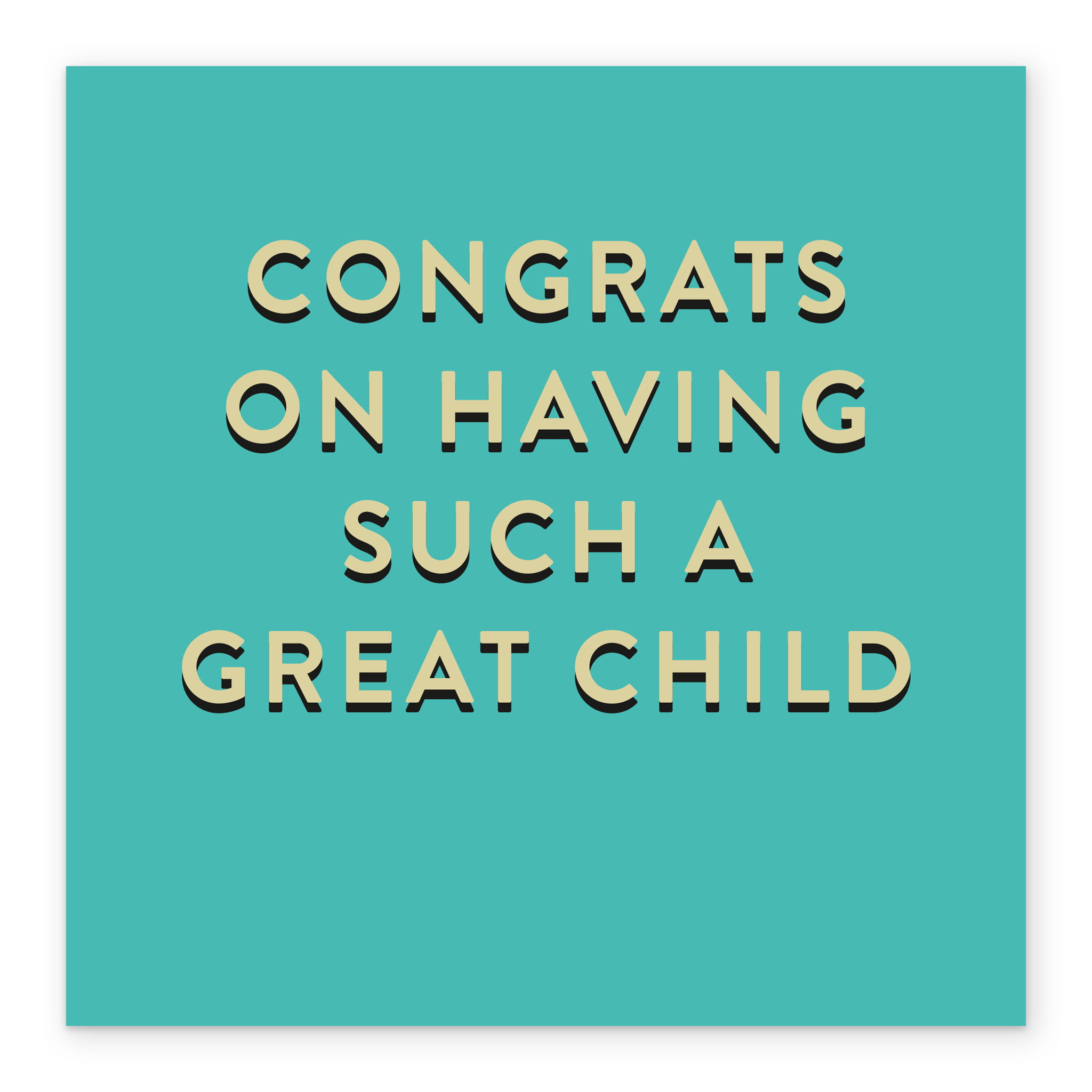 Printed on premium-quality board, this card features a blue background and a funny message, with the message 'Congrats On Having Such A Great Child', and comes complete with a co-ordinating white envelope.