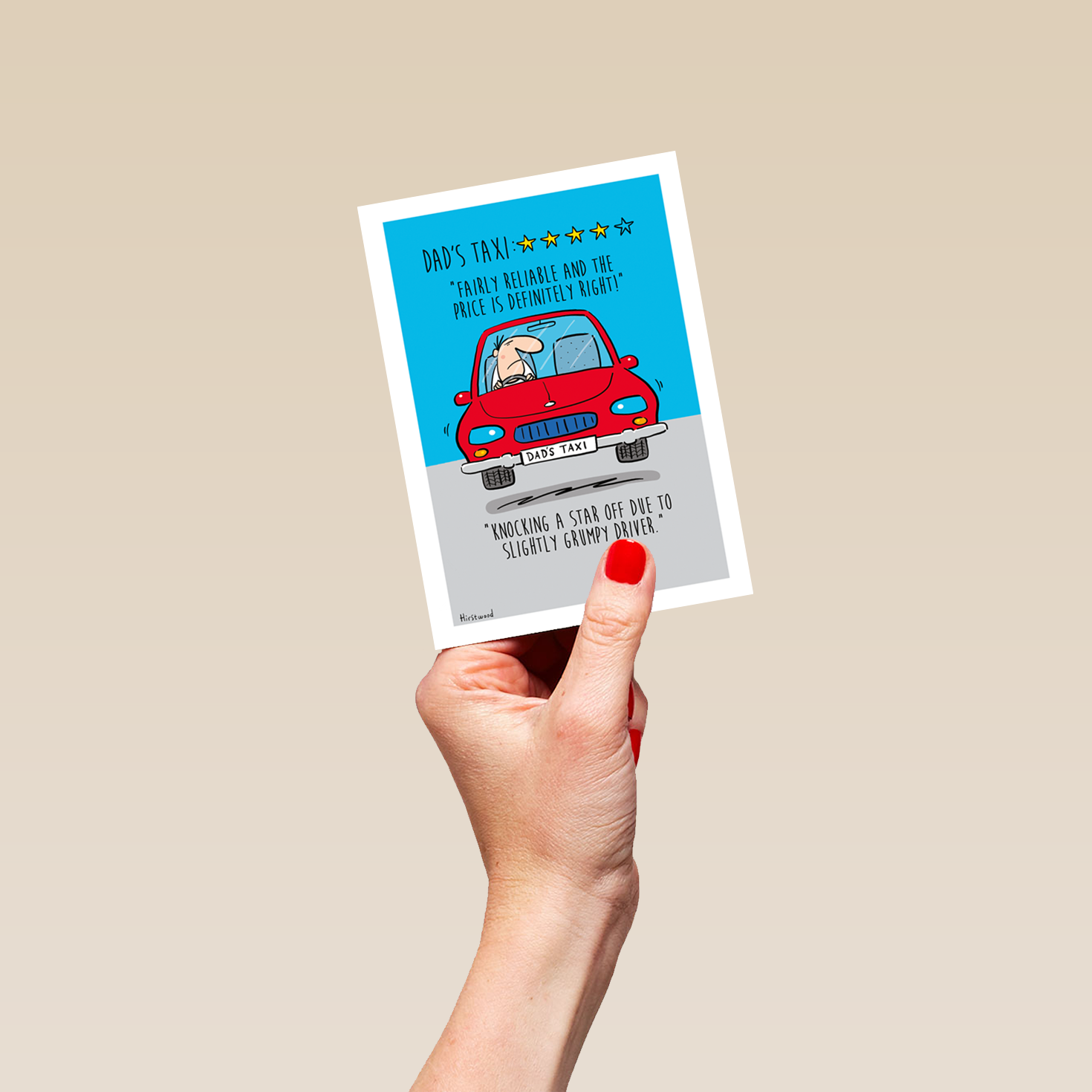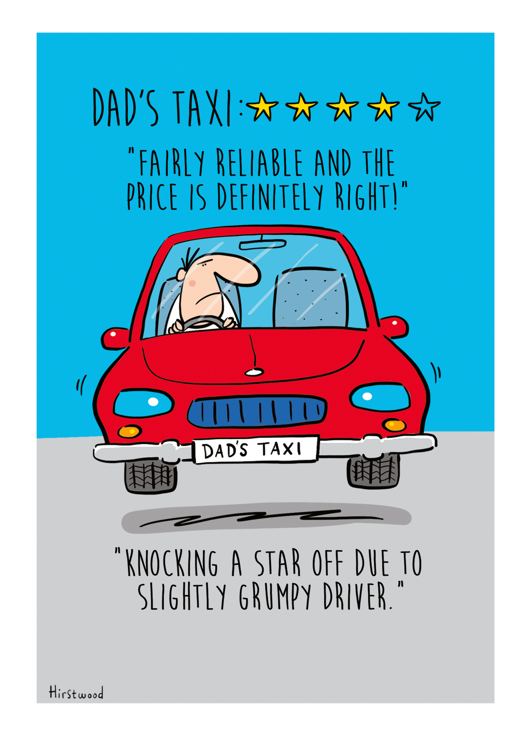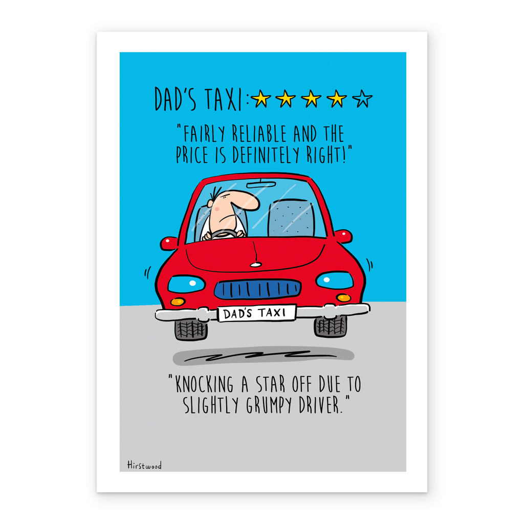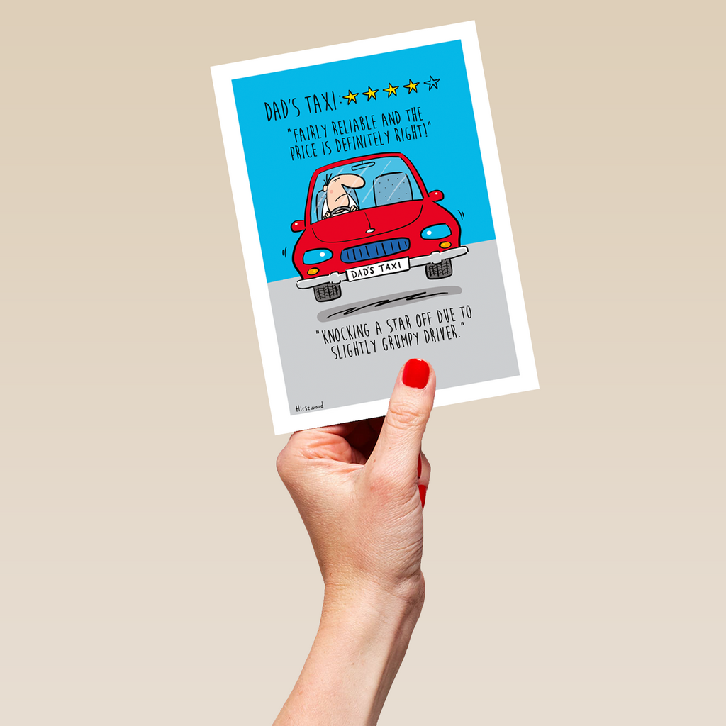 Printed on premium-quality board, this card features a red car with a taxi ranking of 4 stars, with the message 'DAD'S TAXI: **** "Fairly reliable and the price is definitely right!" "Knocking a star off due to slightly grumpy driver."', and comes complete with a co-ordinating white envelope.