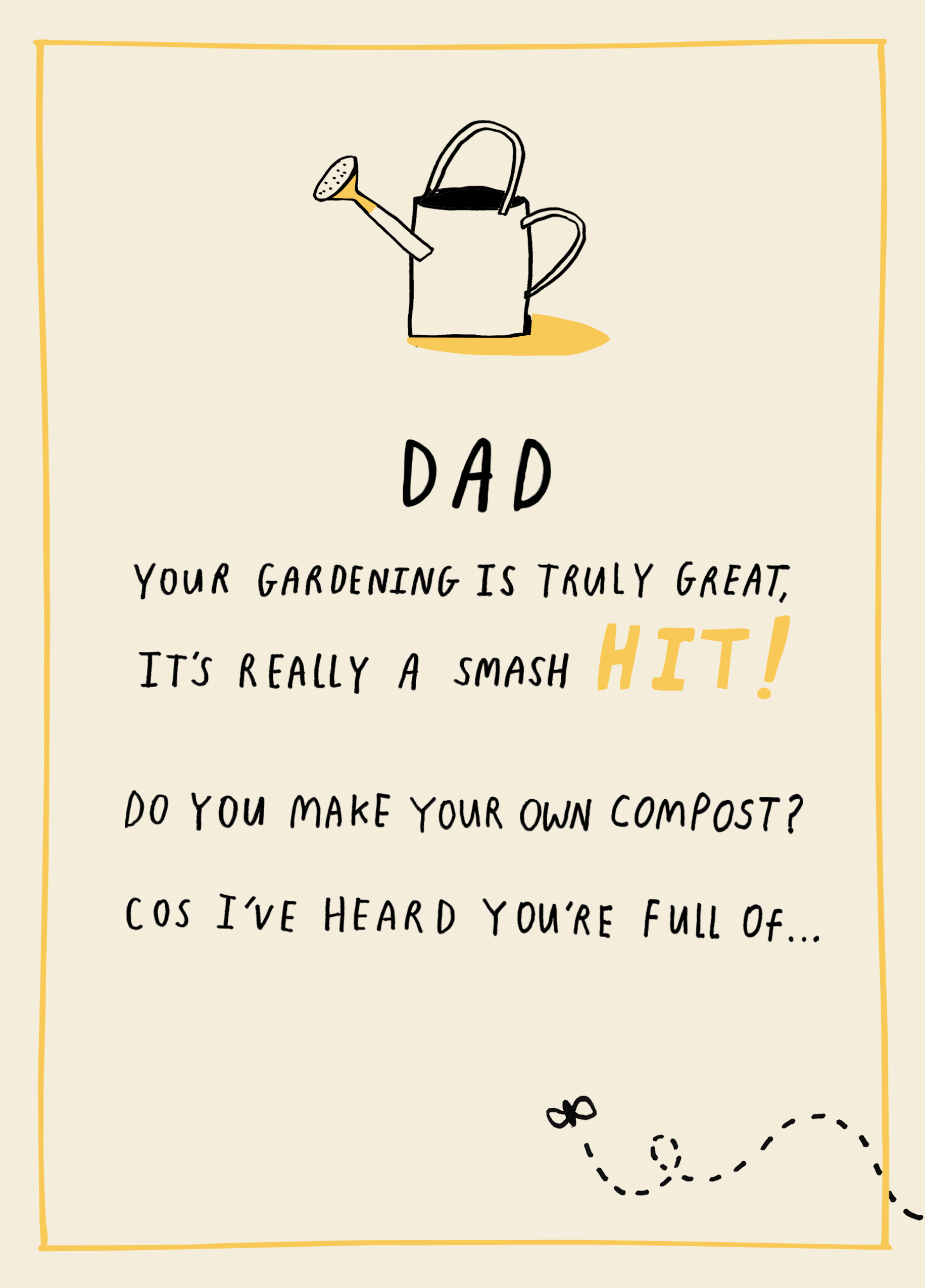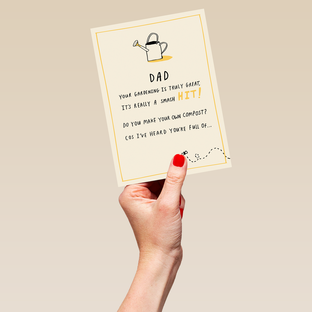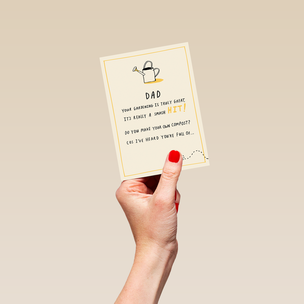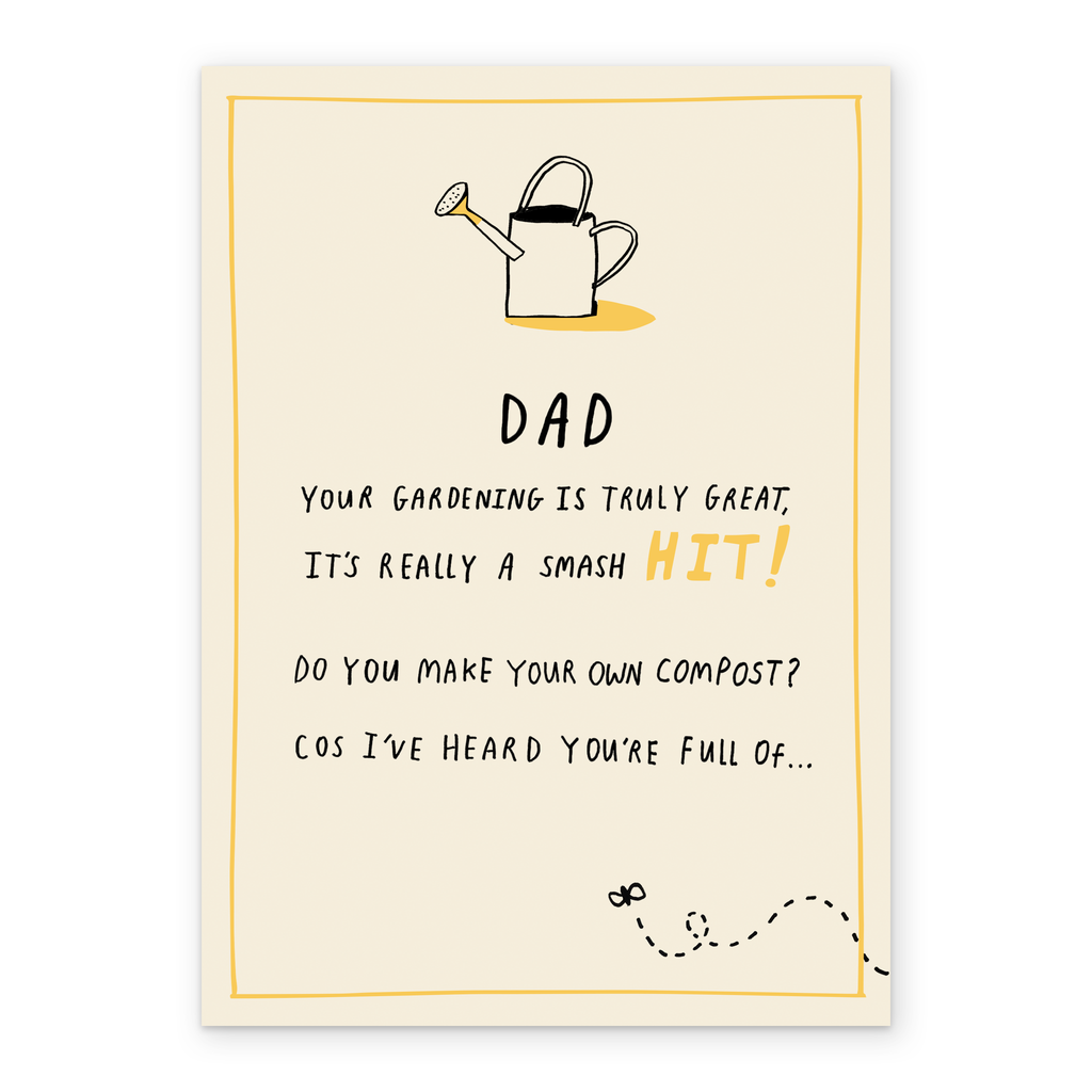 Printed on premium-quality board, this card features a watering can and a fly, with the message 'Dad Your Gardening Is Truly Great, It's Really A Smash Hit! Do You Make Your Own Compost? Cos I've Heard You're Full Of…', and comes complete with a co-ordinating white envelope.