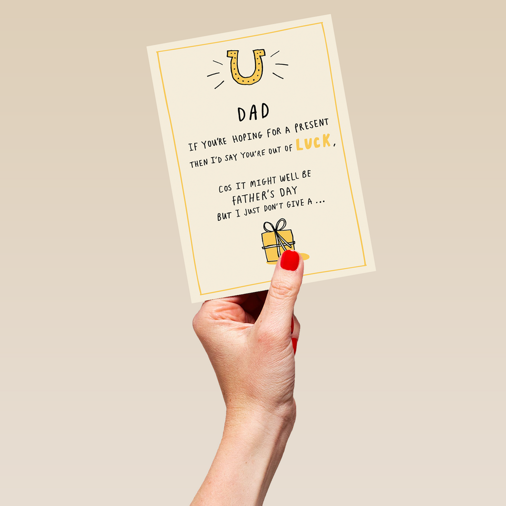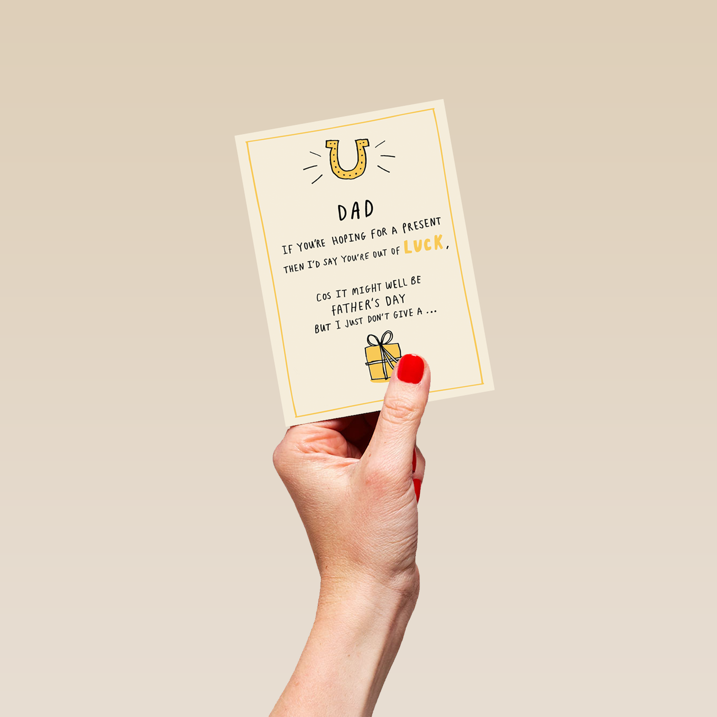 Printed on premium-quality board, this card features a horseshoe and present box, with the message 'Dad If You're Hoping For a Present Then I'd Say You're Out Of Luck, Cos It Might Well Be Father's Day But I Just Don't Give A…', and comes complete with a co-ordinating white envelope.