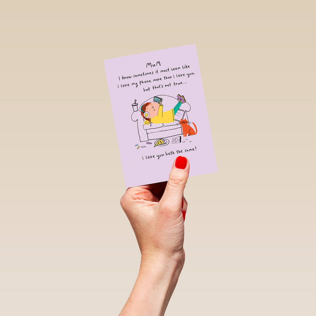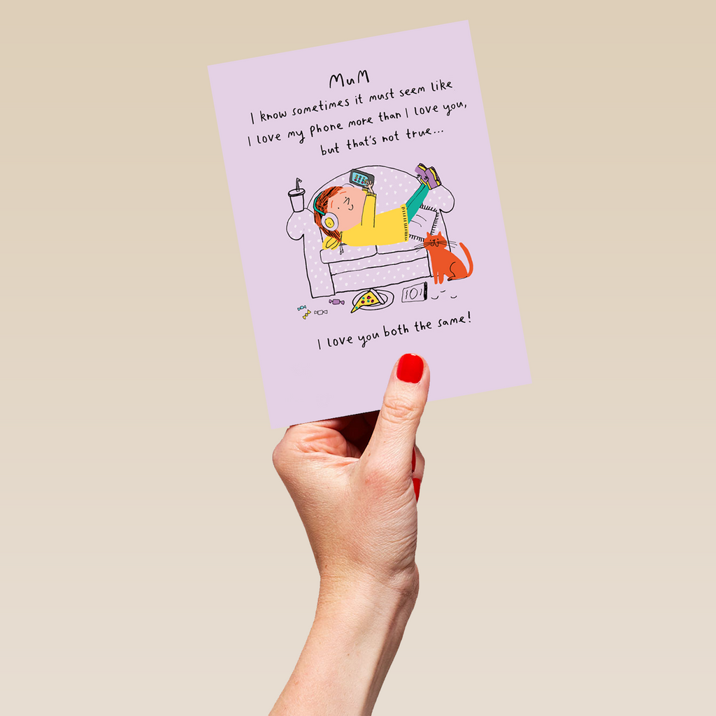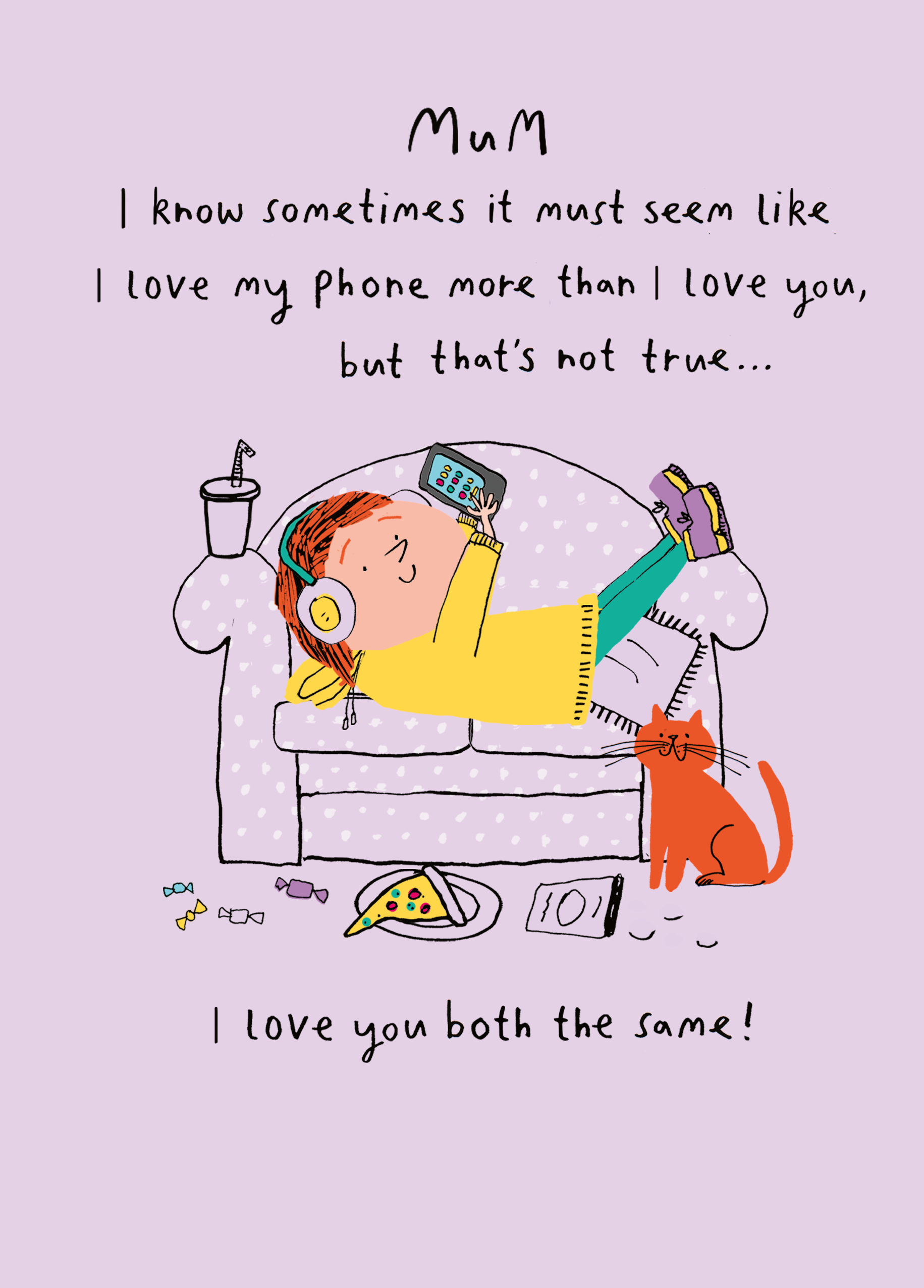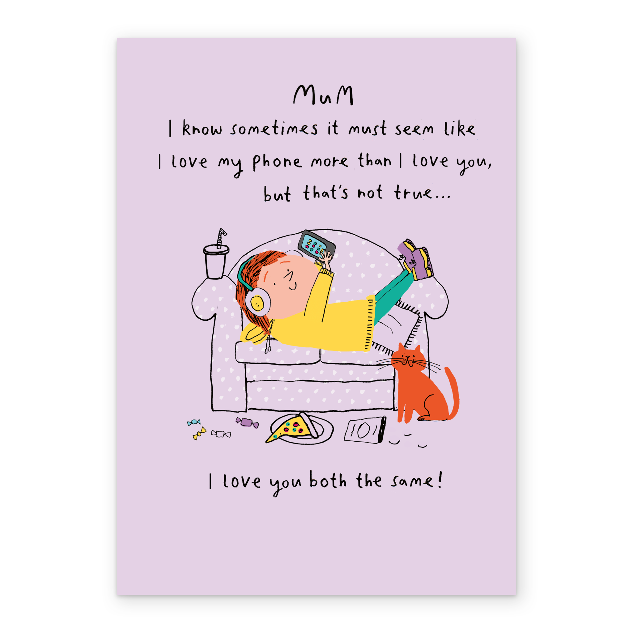 Printed on premium-quality board, this card features a funny illustration of a girl lying on the sofa with headphones on and playing on her phone, with the message 'Mum I know sometimes it must seem like I love my phone more than I love you, but that's not true... I love you both the same!', and comes complete with a co-ordinating white envelope.