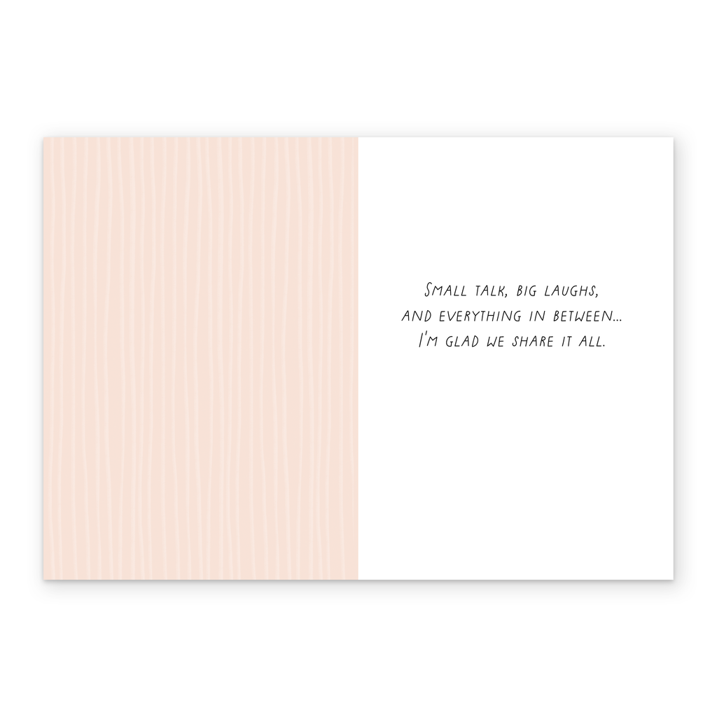 Message inside reads: Small Talk, Big Laughs, And Everything In Between... I'm Glad We Share It All.