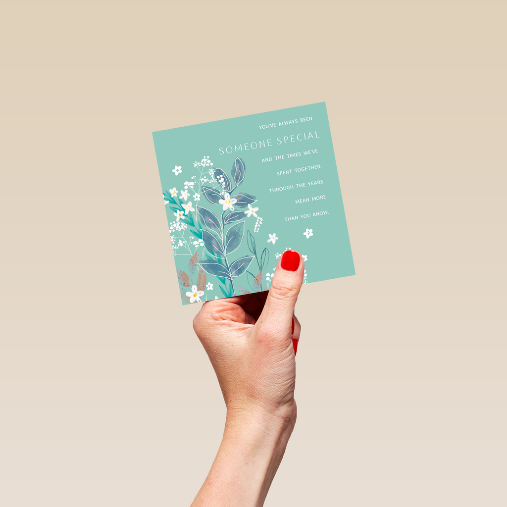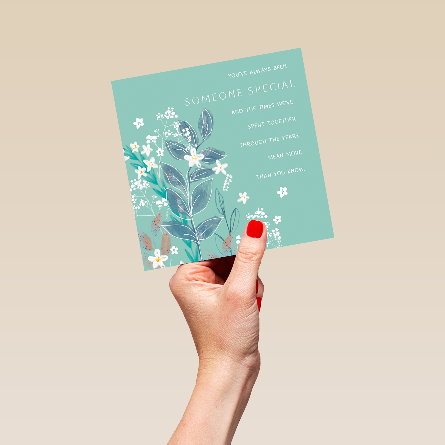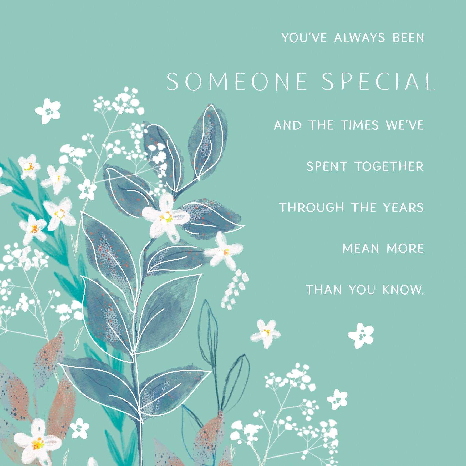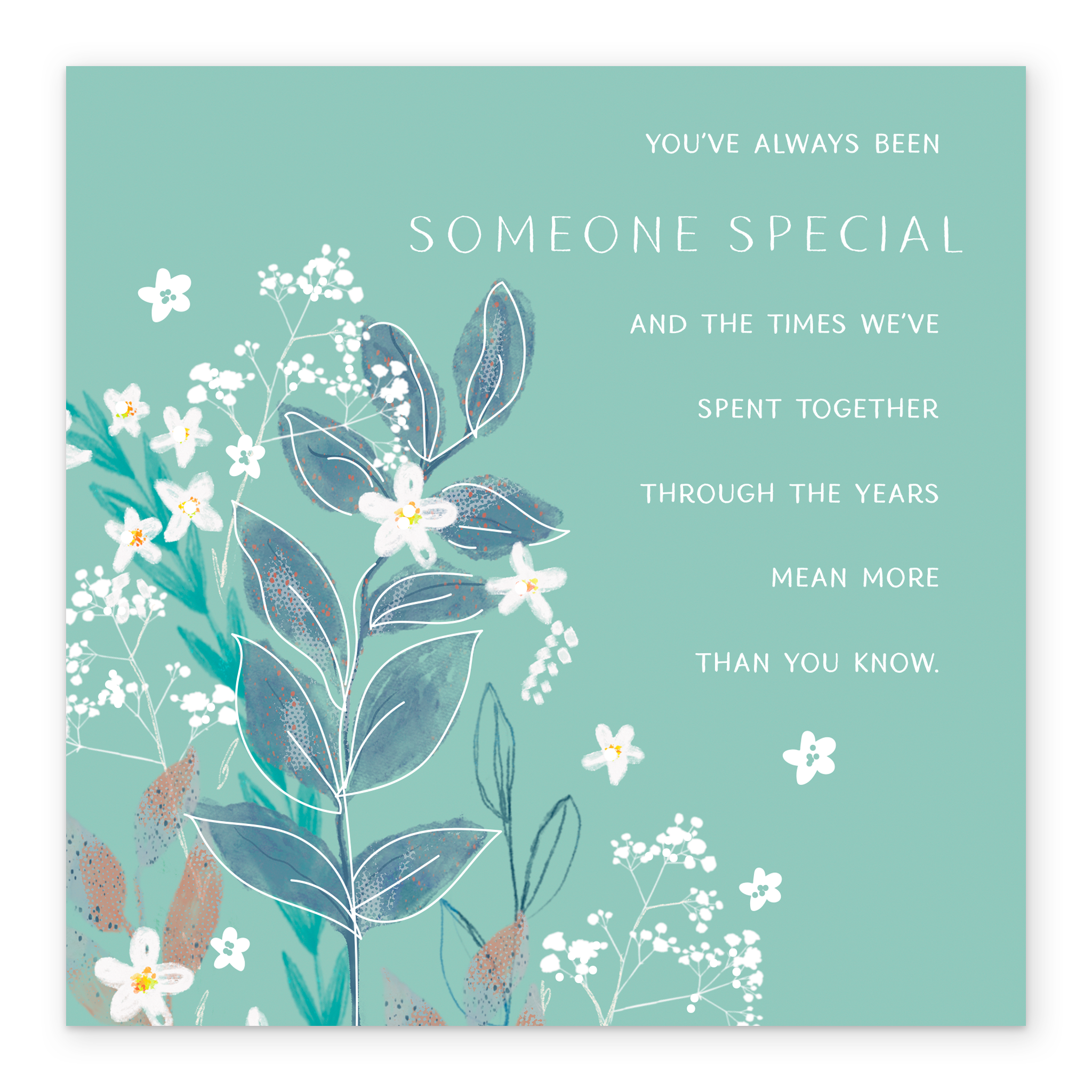 Printed on premium-quality board, this card features a green background with florals , with the message 'You've always been someone special and the times we've spent together through the years mean more than you know.', and comes complete with a co-ordinating white envelope.