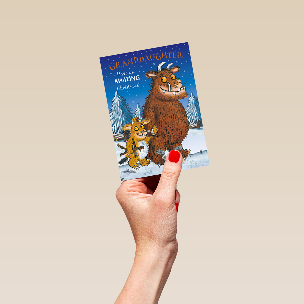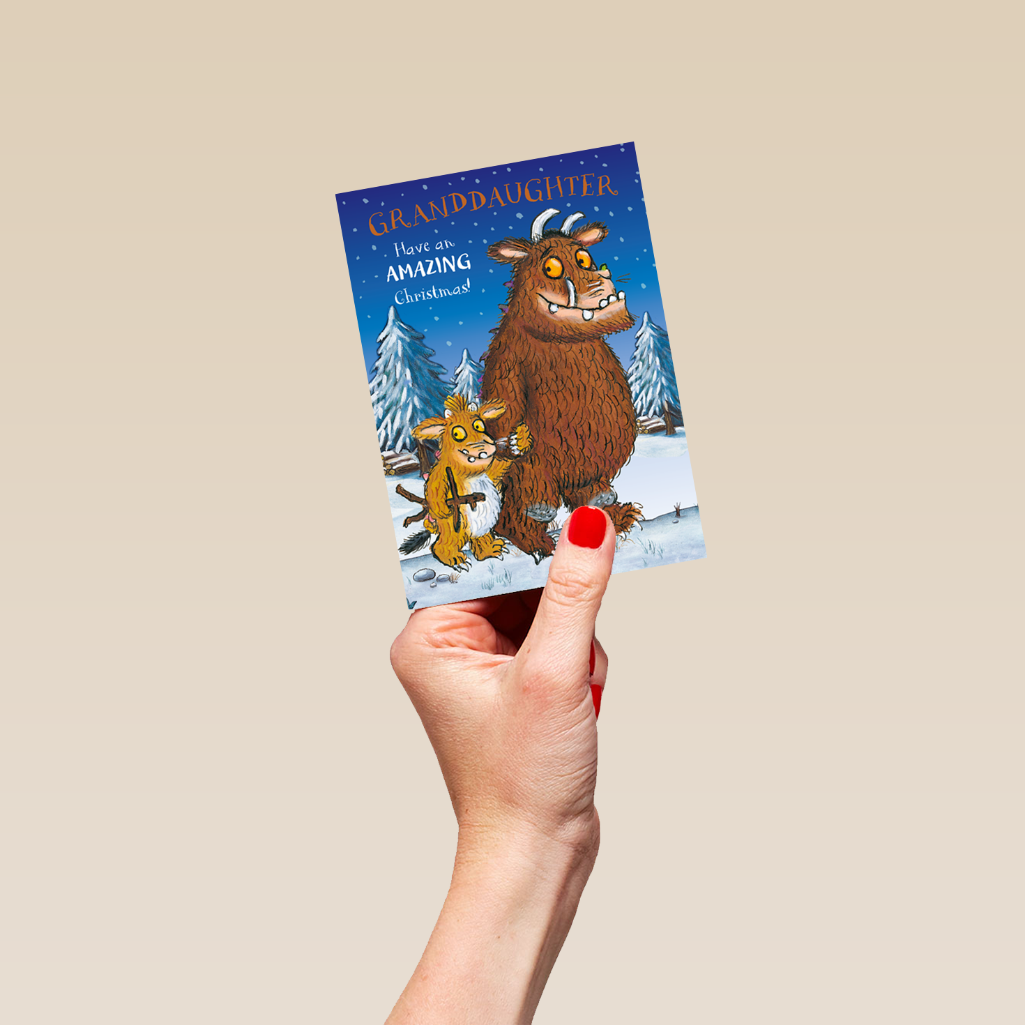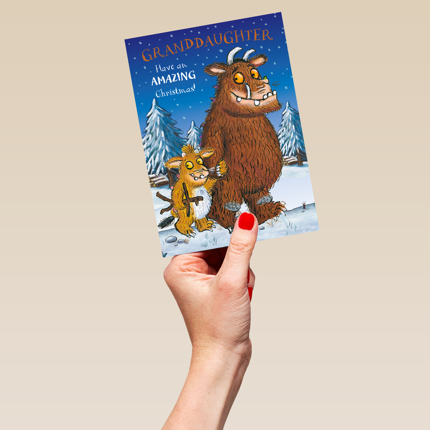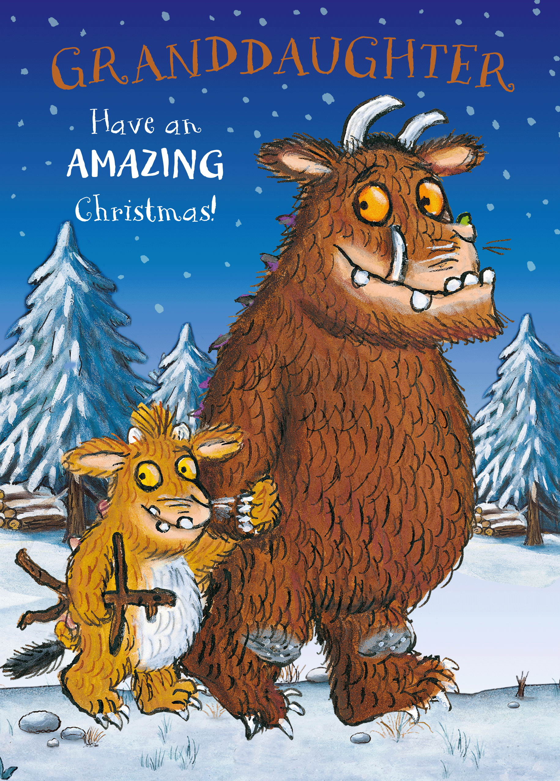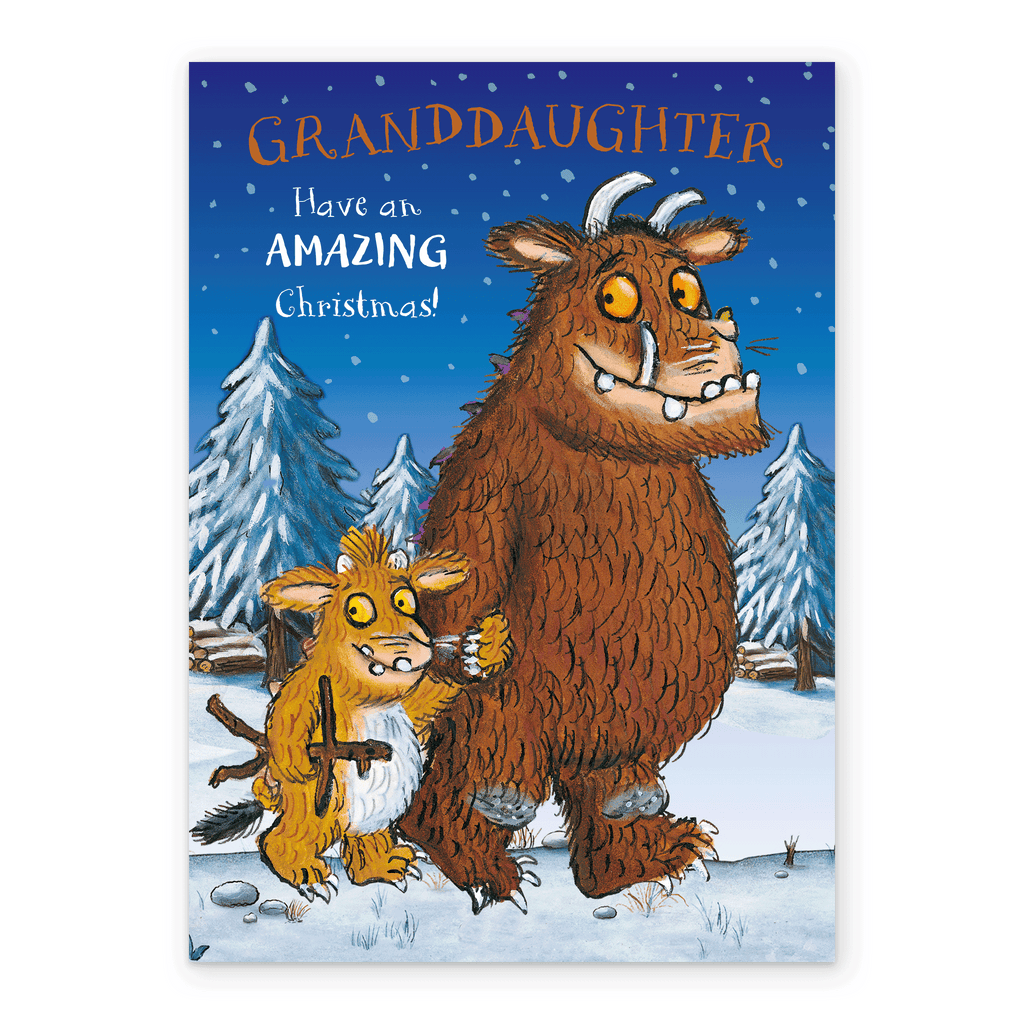 Printed on premium-quality board, this card features a classic Axel Schaeffler illustration of Julia Donaldson's The Gruffalo and The Gruffalo's Child walking hand-in-hand through a wintery landscape with orange and white lettering, with the message 'Granddaughter have an amazing Christmas!', and comes complete with a co-ordinating white envelope.