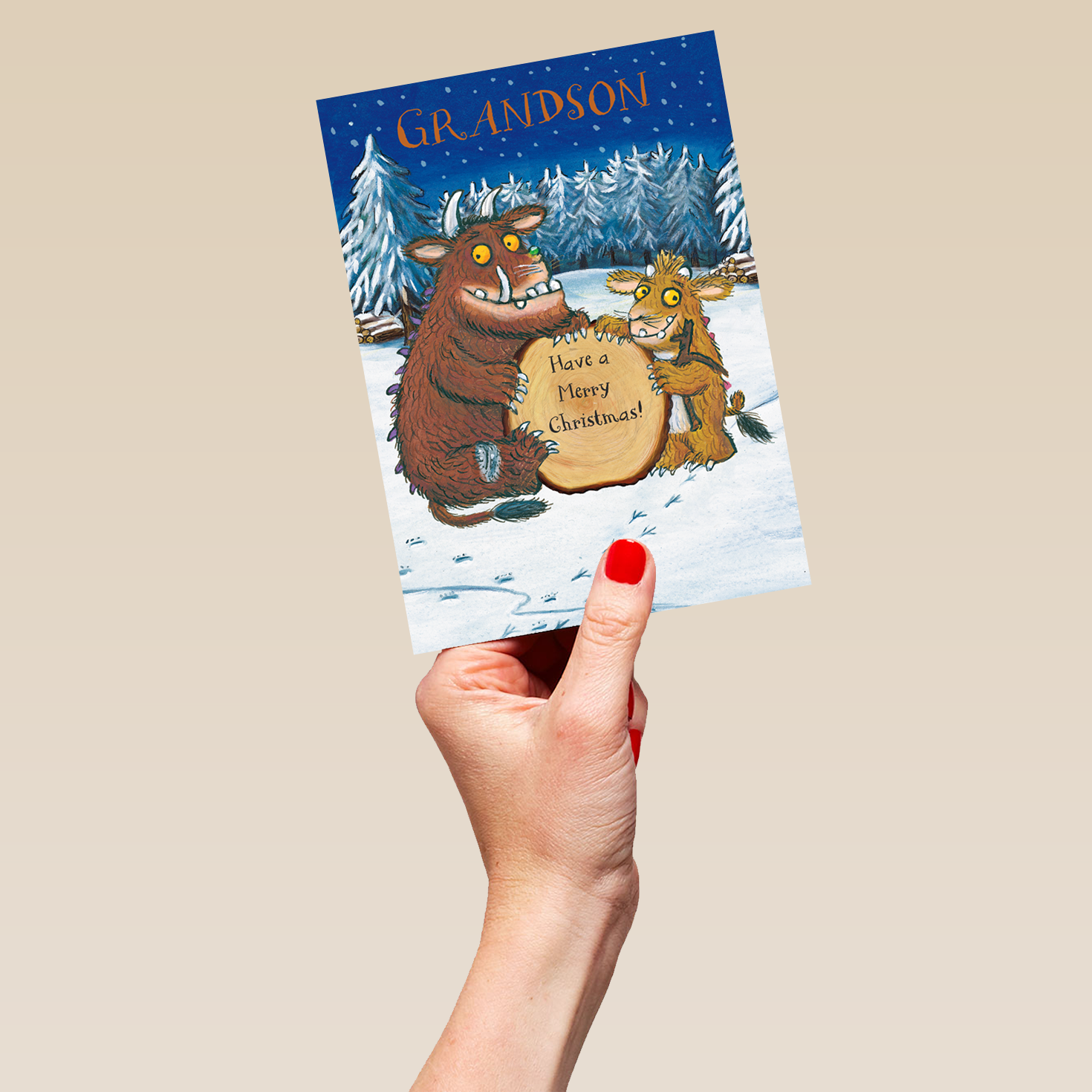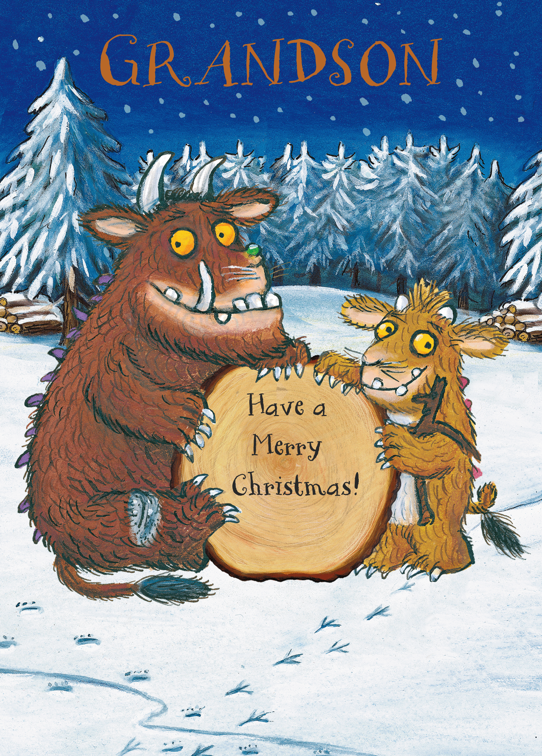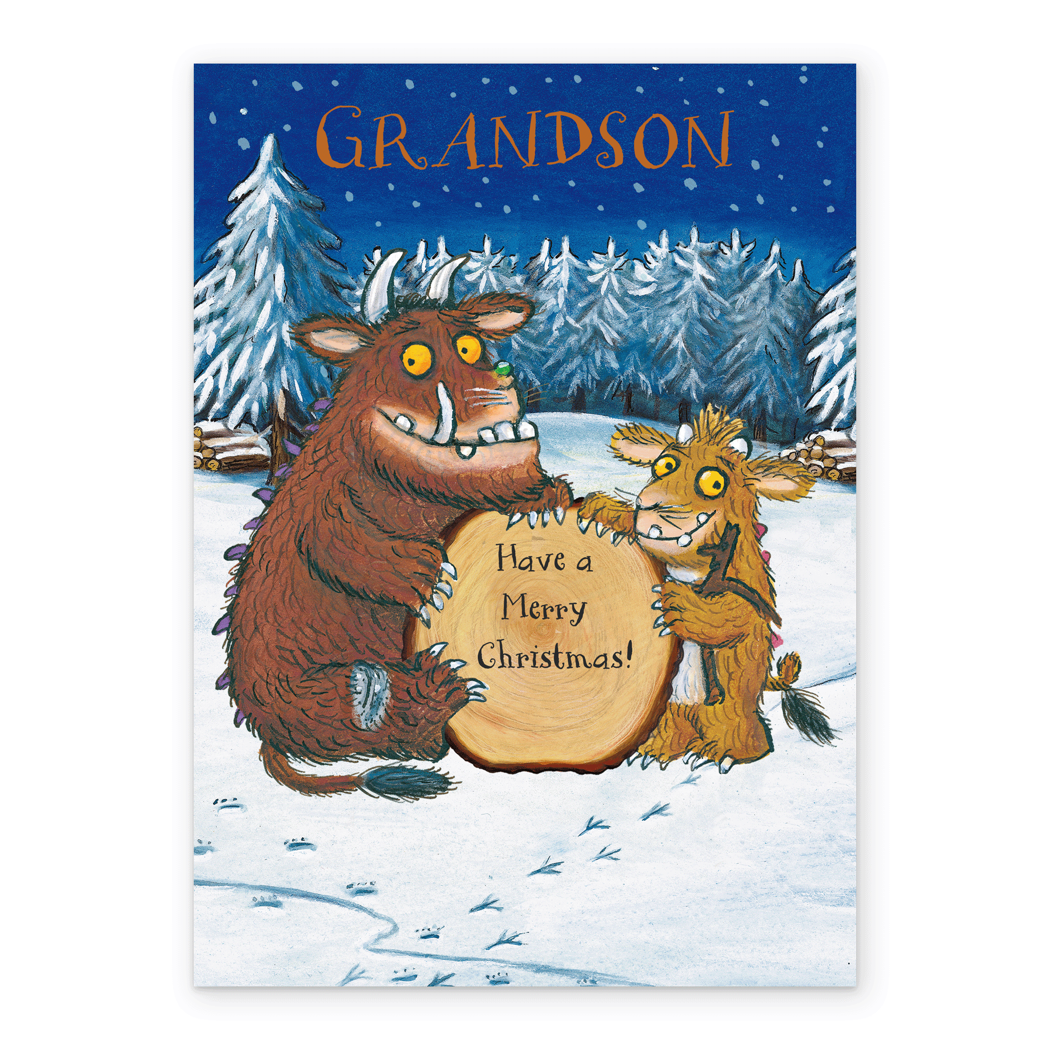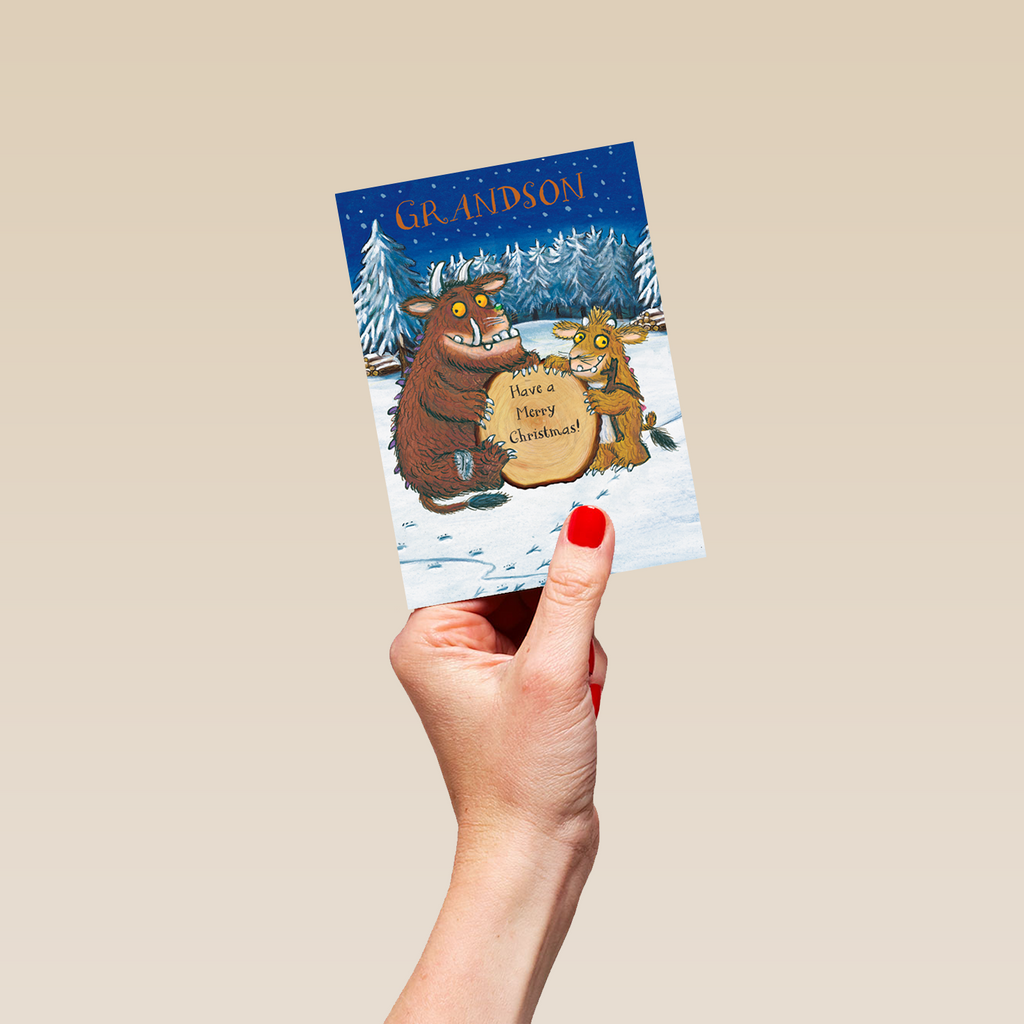 Printed on premium-quality board, this card features a classic Axel Schaeffler illustration of Julia Donaldson's The Gruffalo and The Gruffalo's Child on either side of a tree-stump, set in the midst of a wintery landscape with orange and black lettering, with the message 'Grandson Have a merry Christmas!', and comes complete with a co-ordinating white envelope.