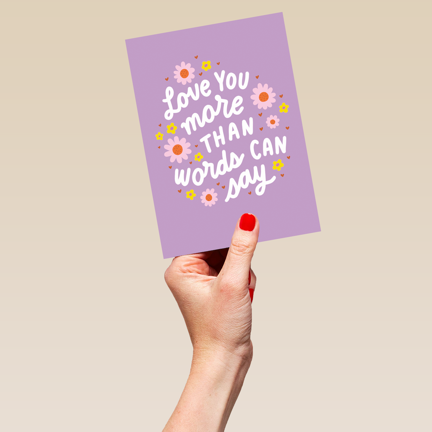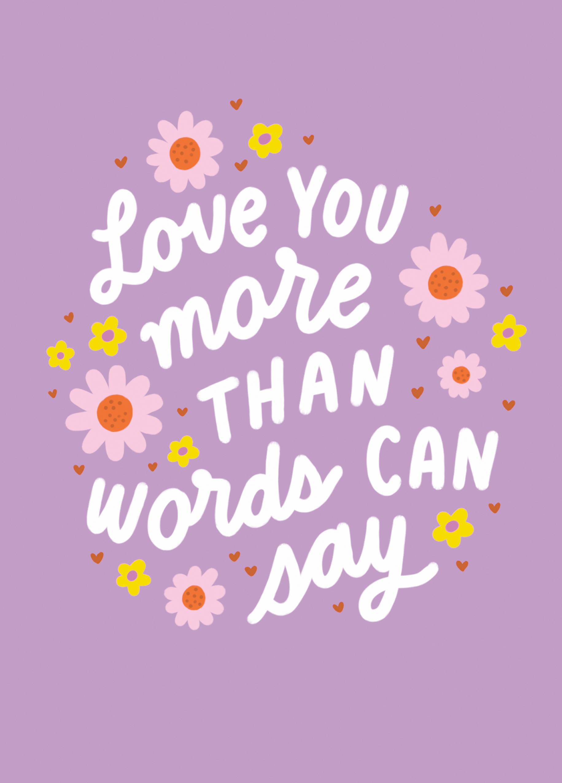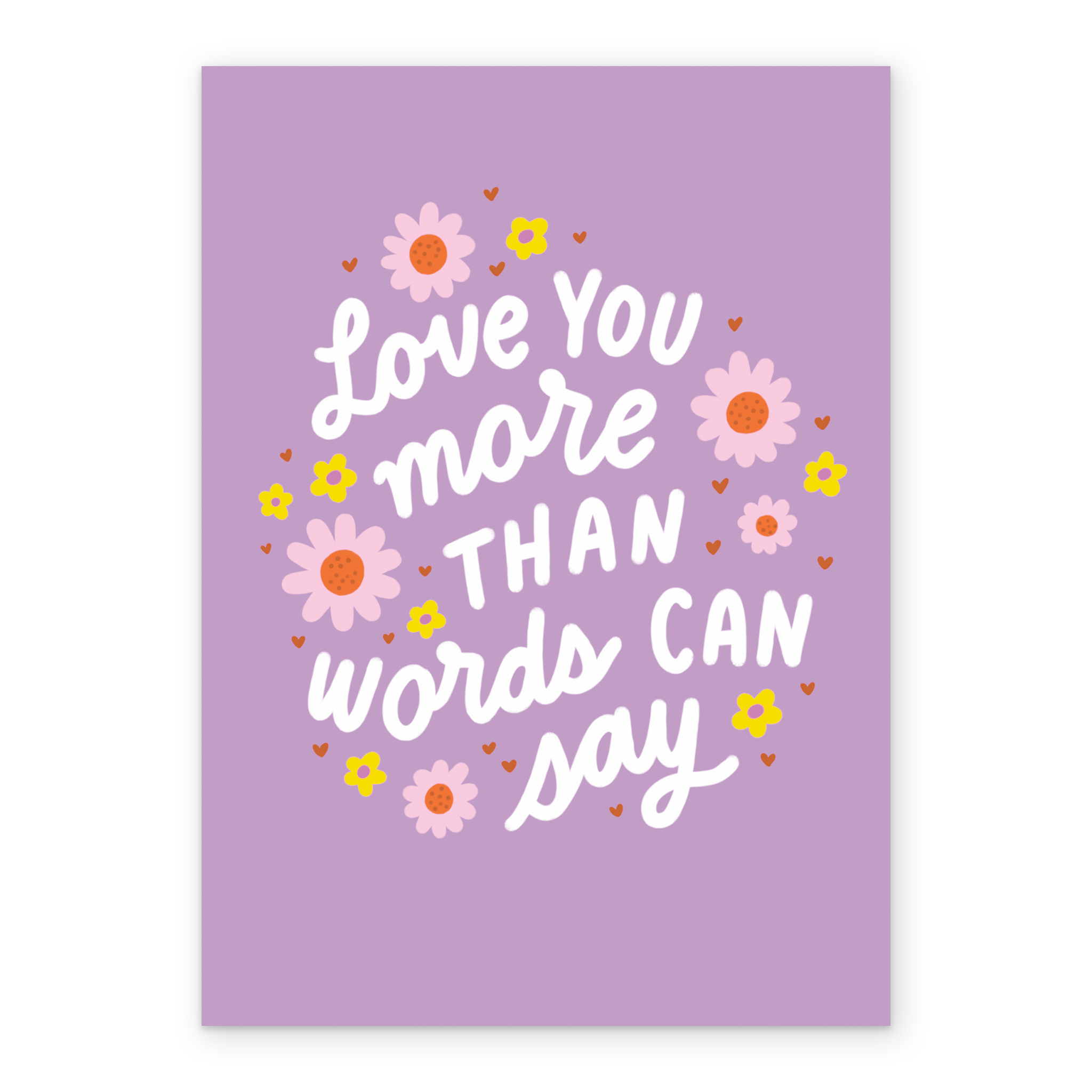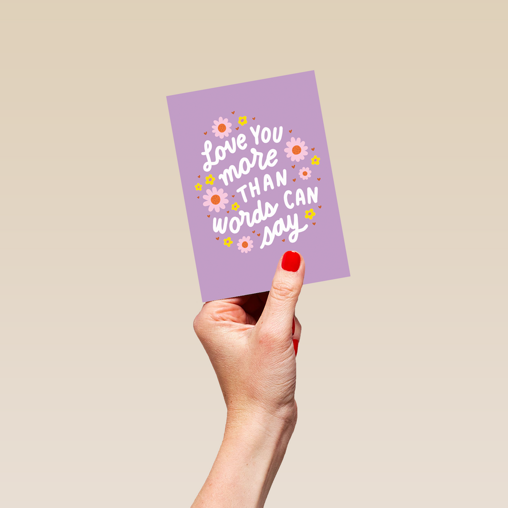 Printed on premium-quality board, this card features a purple background with a loving message and florals, with the message 'Love you more than words can say', and comes complete with a co-ordinating white envelope.