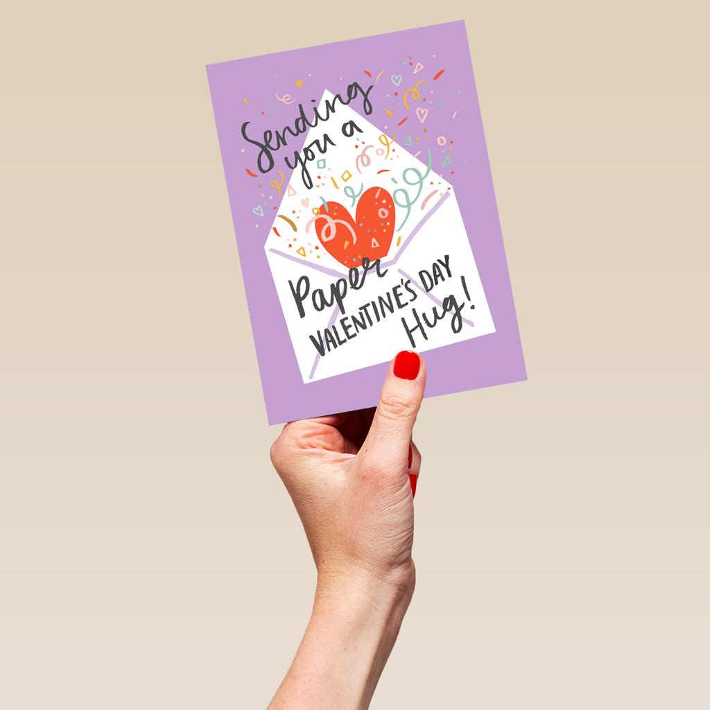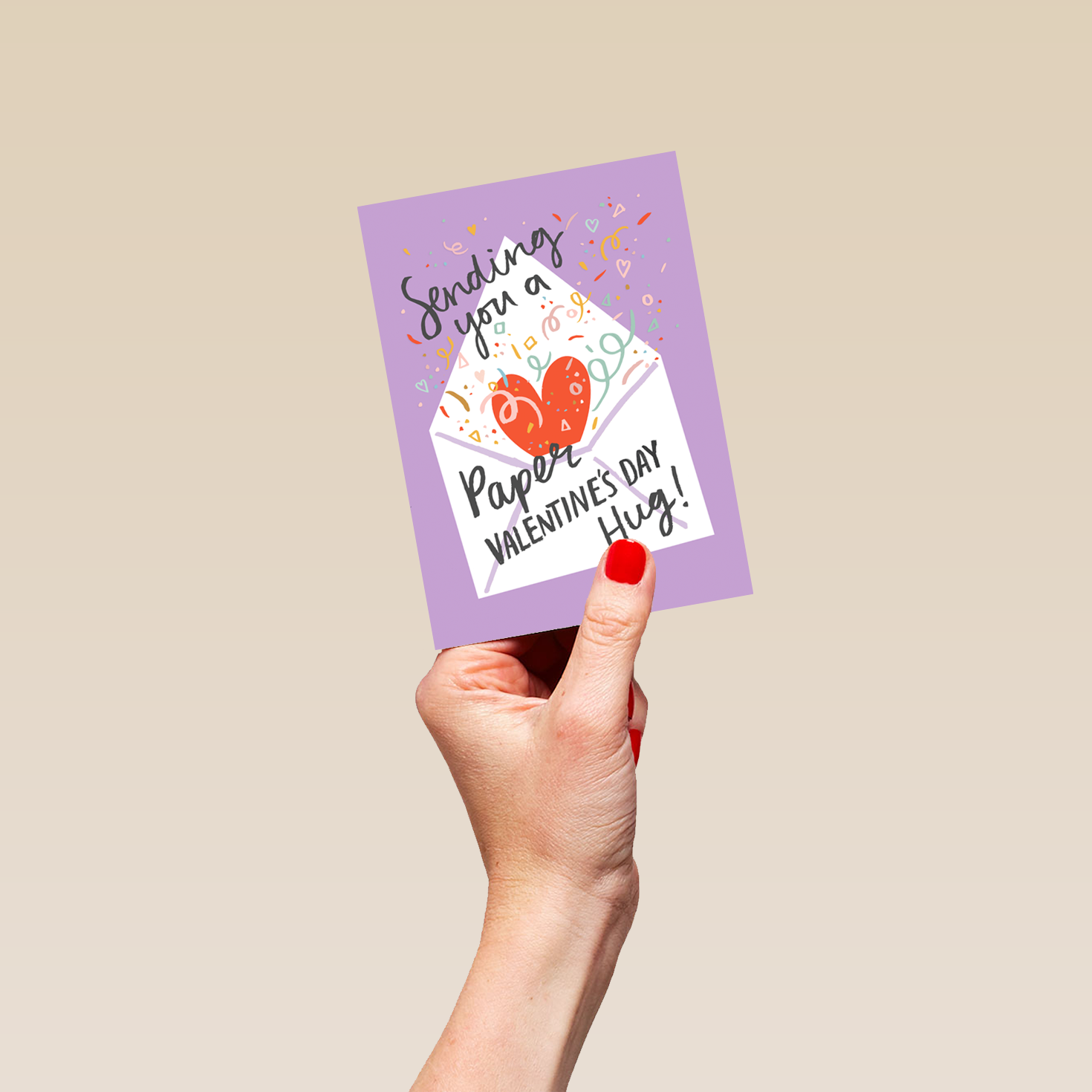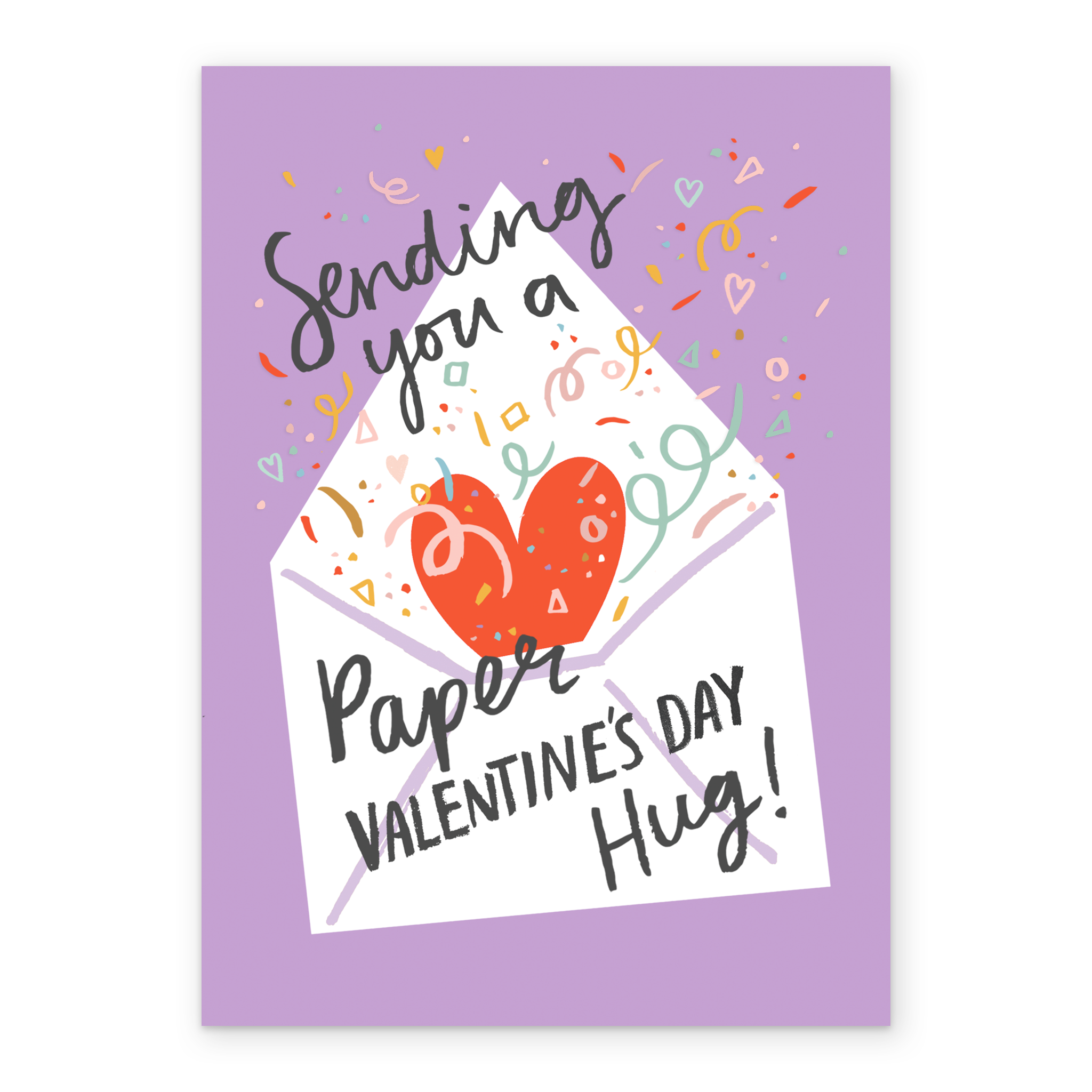 Printed on premium-quality board, this card features a heart in an envelope with confetti, with the message 'Sending you a paper Valentine's Day hug!', and comes complete with a co-ordinating white envelope.