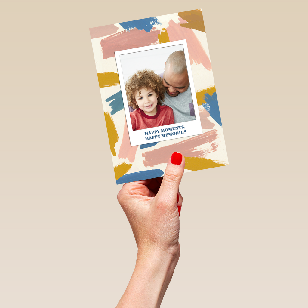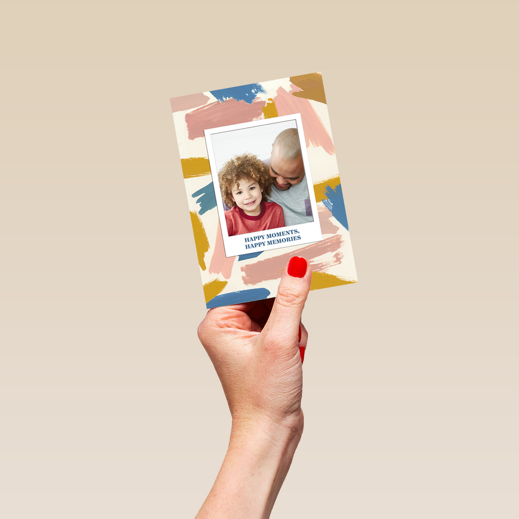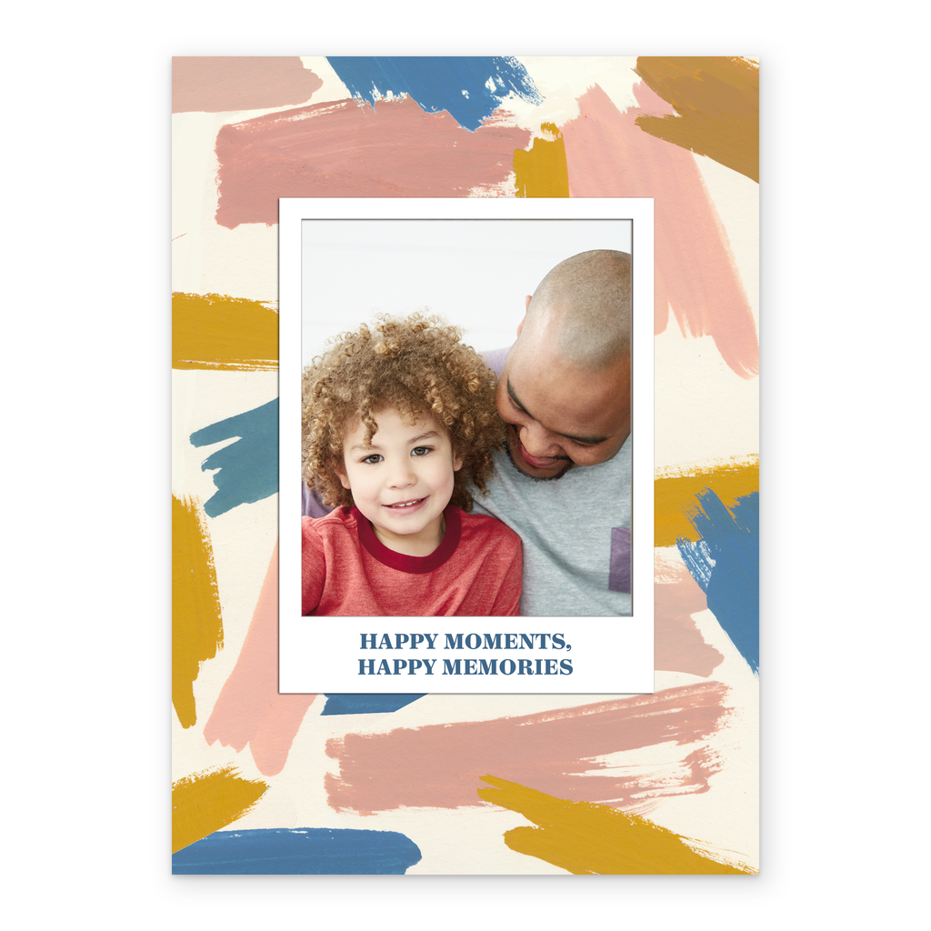Printed on premium-quality board, this card features a polaroid styled frame with colourful smudge strokes, with the message 'Happy Moments, Happy Memories', space to upload a photo and personalise your message, and comes complete with a co-ordinating white envelope.