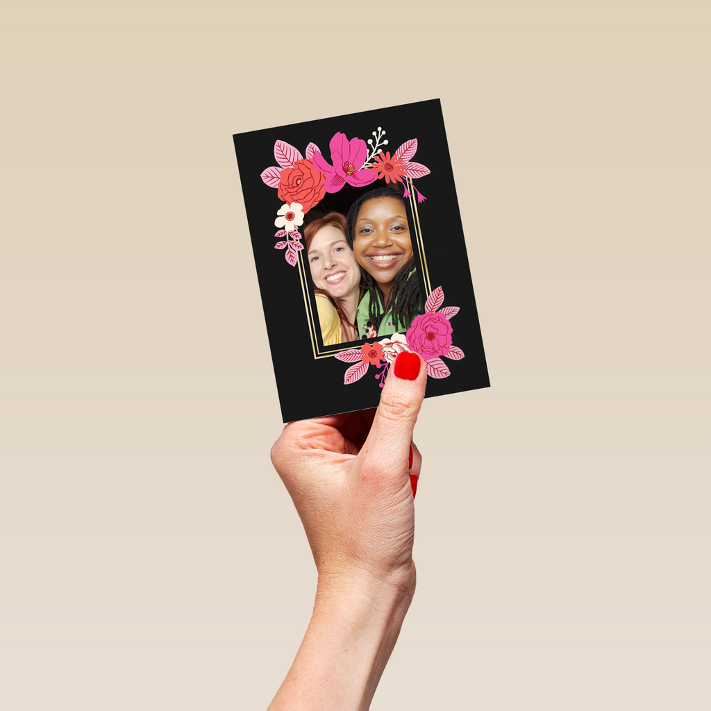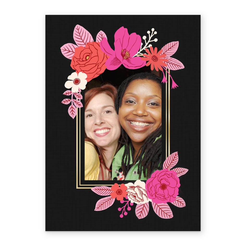 Printed on premium-quality board, this card features pink flowers around a frame, space to upload a photo, and comes complete with a co-ordinating white envelope.