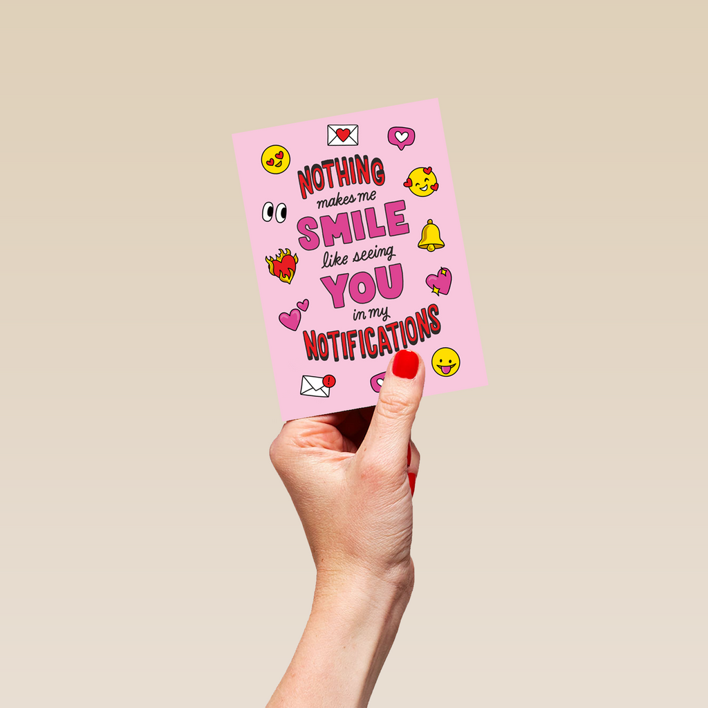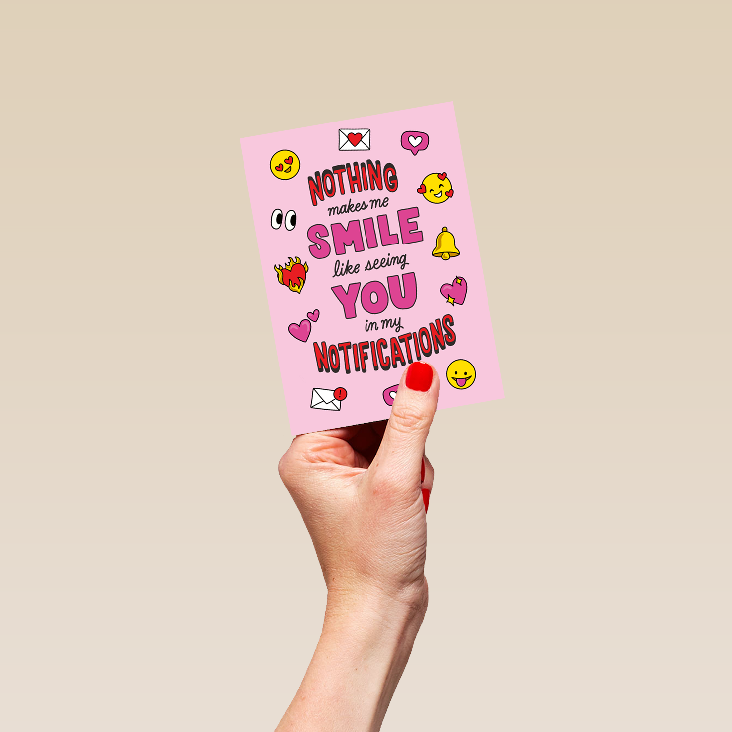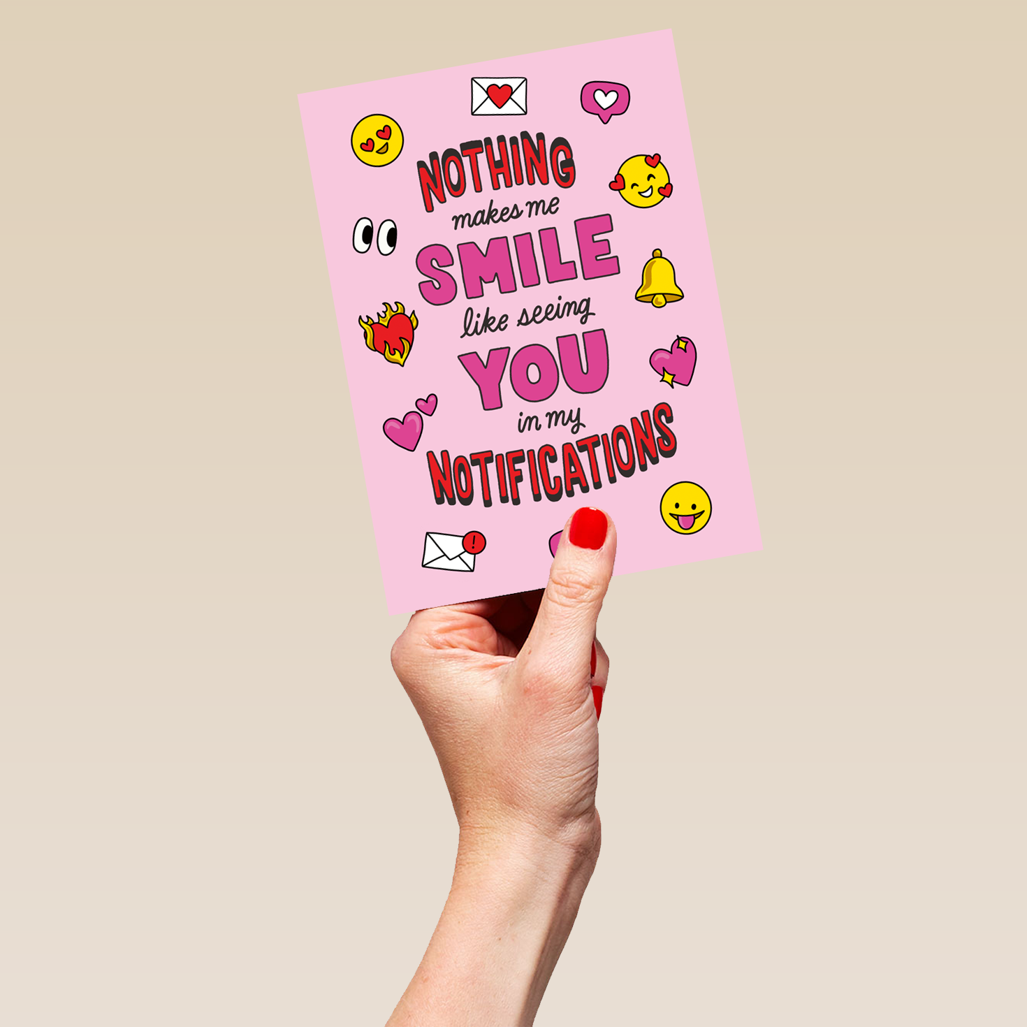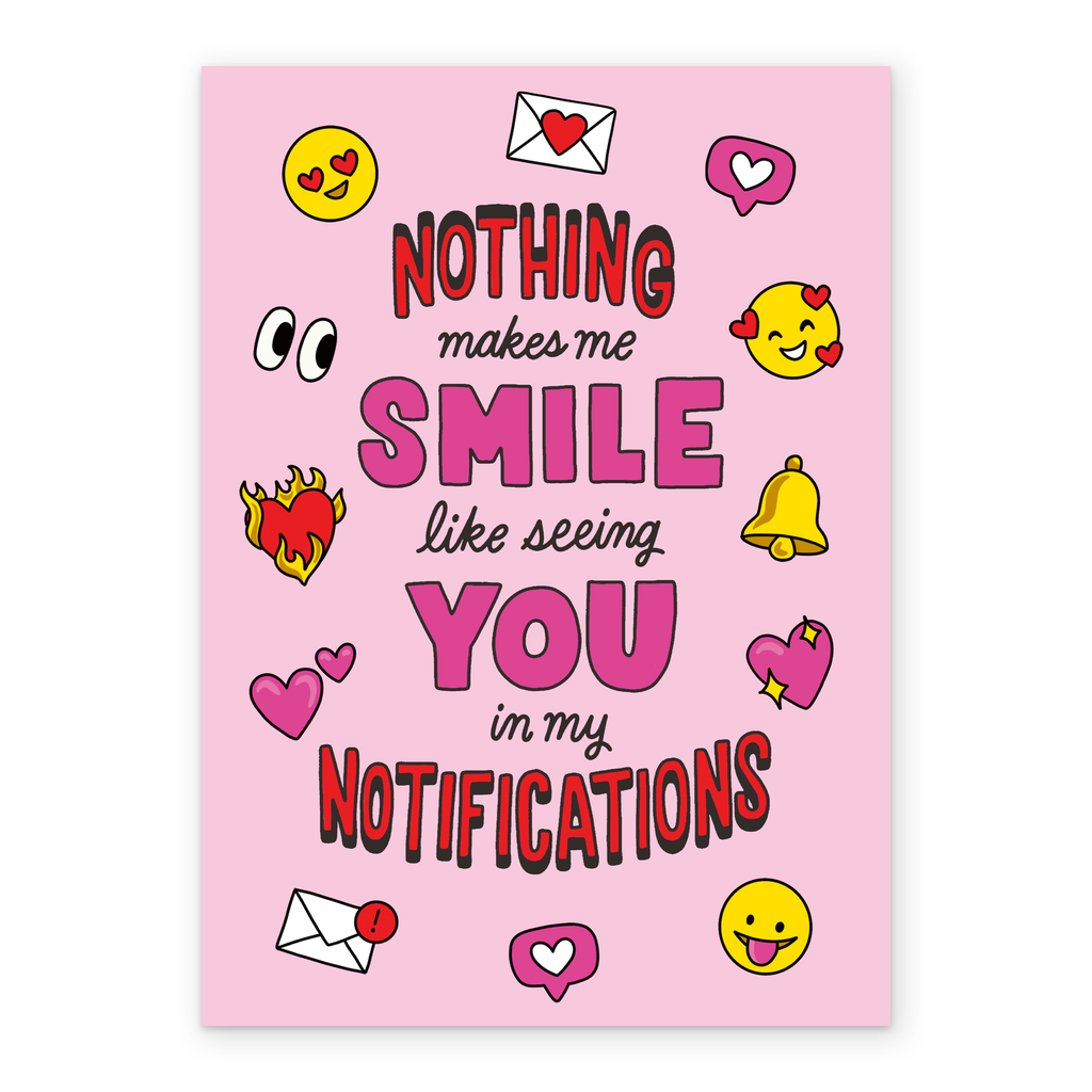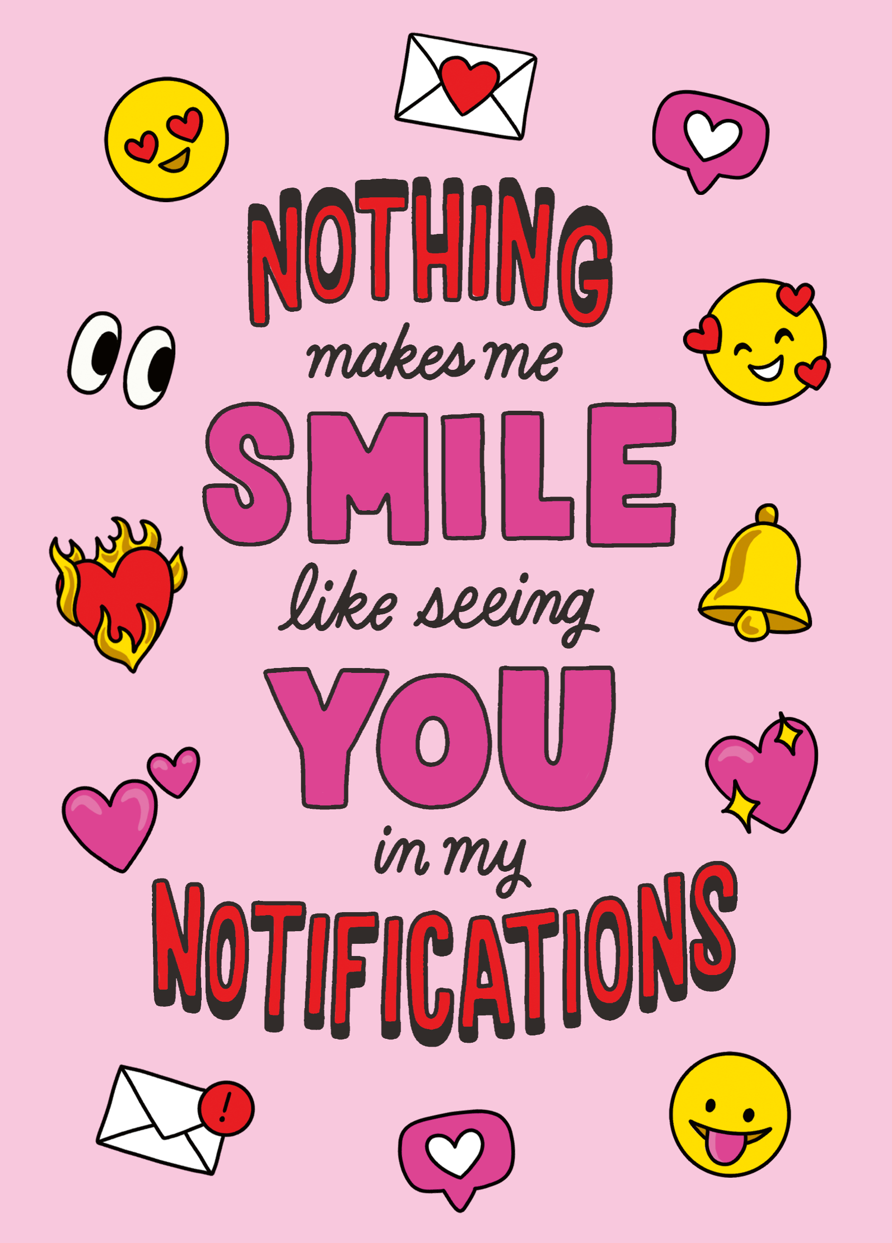Printed on premium-quality board, this card features a pink background with emojis and notifications, with the message 'Nothing makes me smile like seeing you in my notifications', and comes complete with a co-ordinating white envelope.