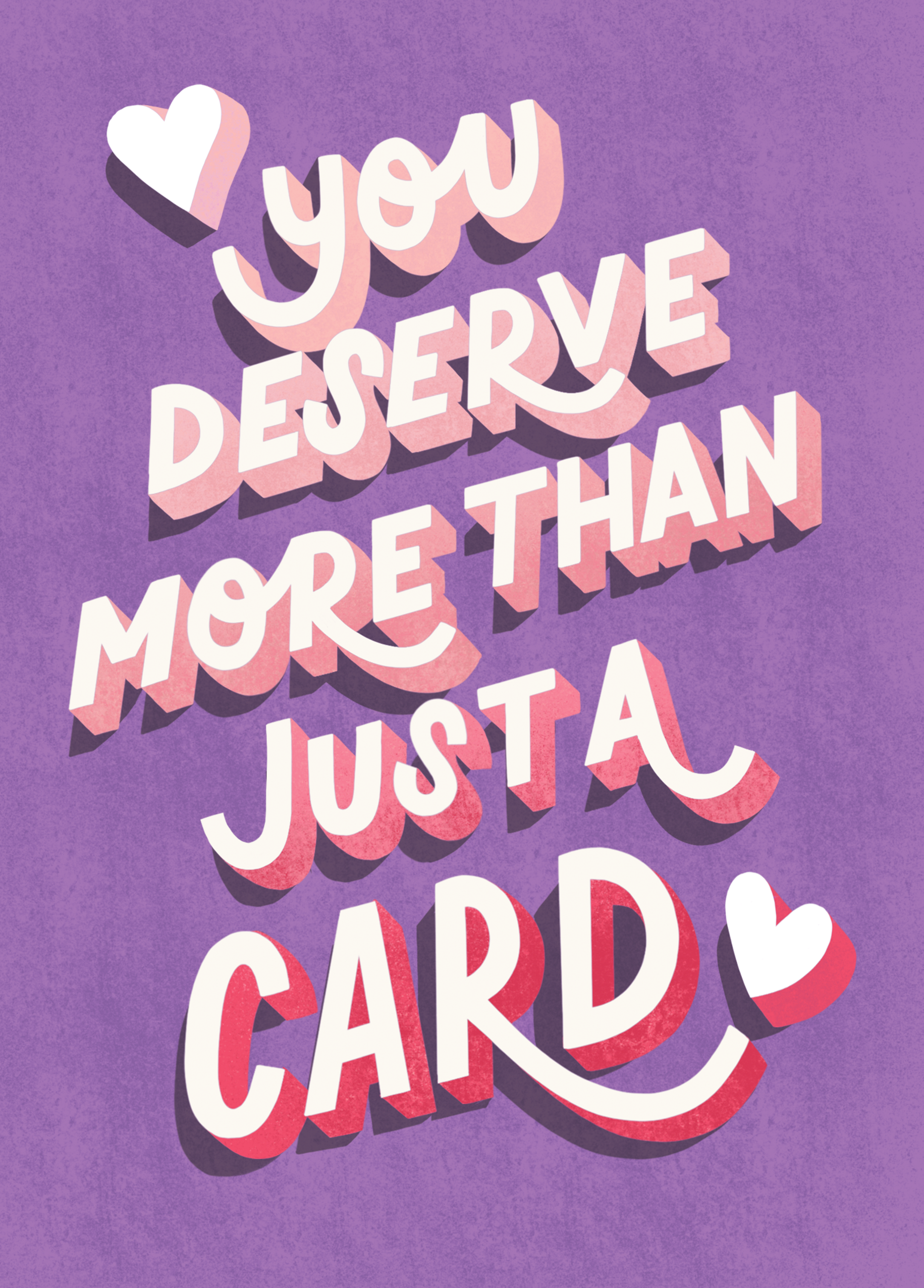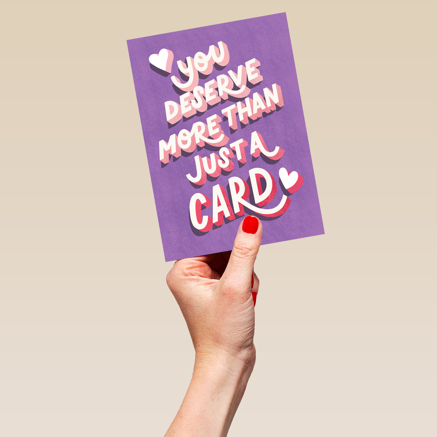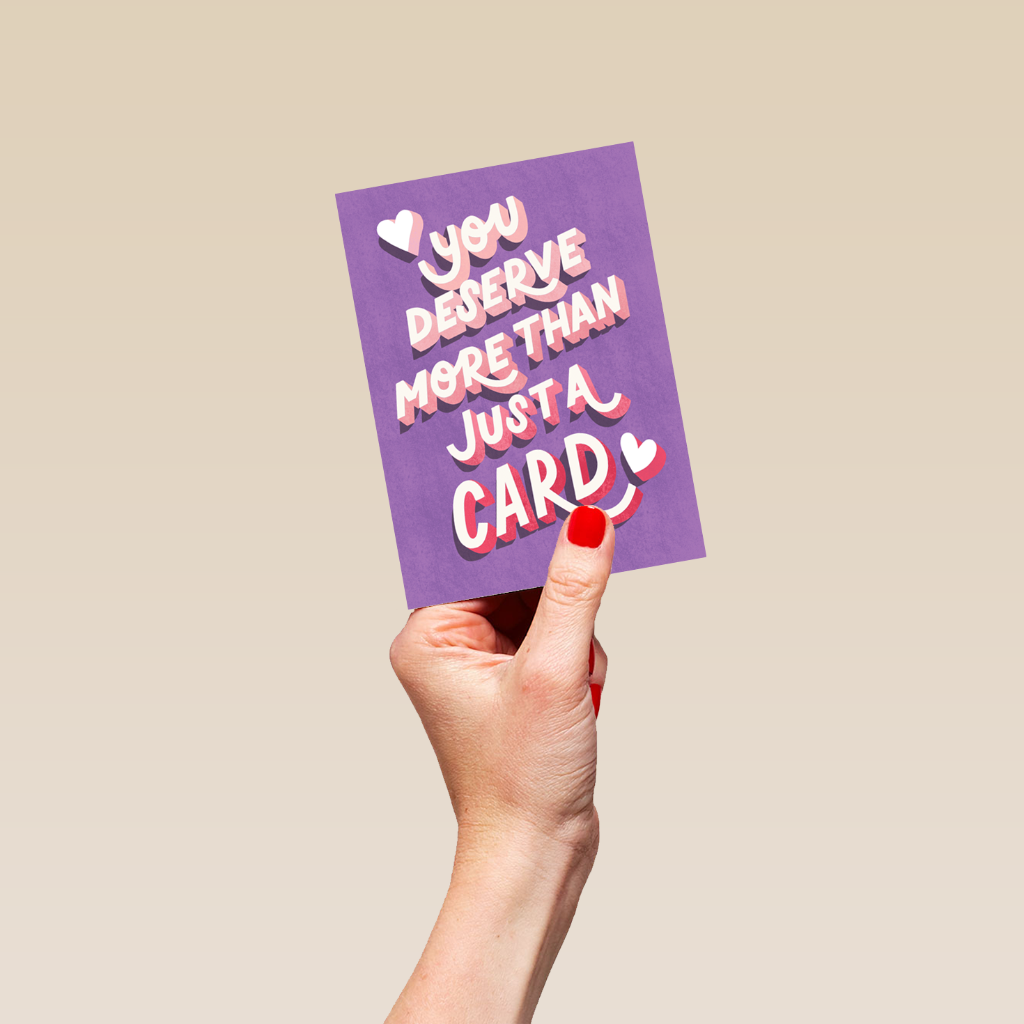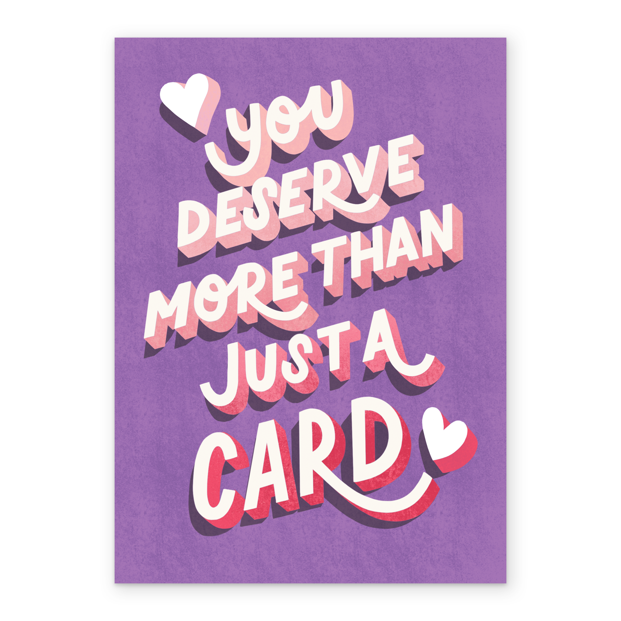 Printed on premium-quality board, this card features fun lettering on purple background, with the message 'You deserve more than just a card', and comes complete with a co-ordinating white envelope.