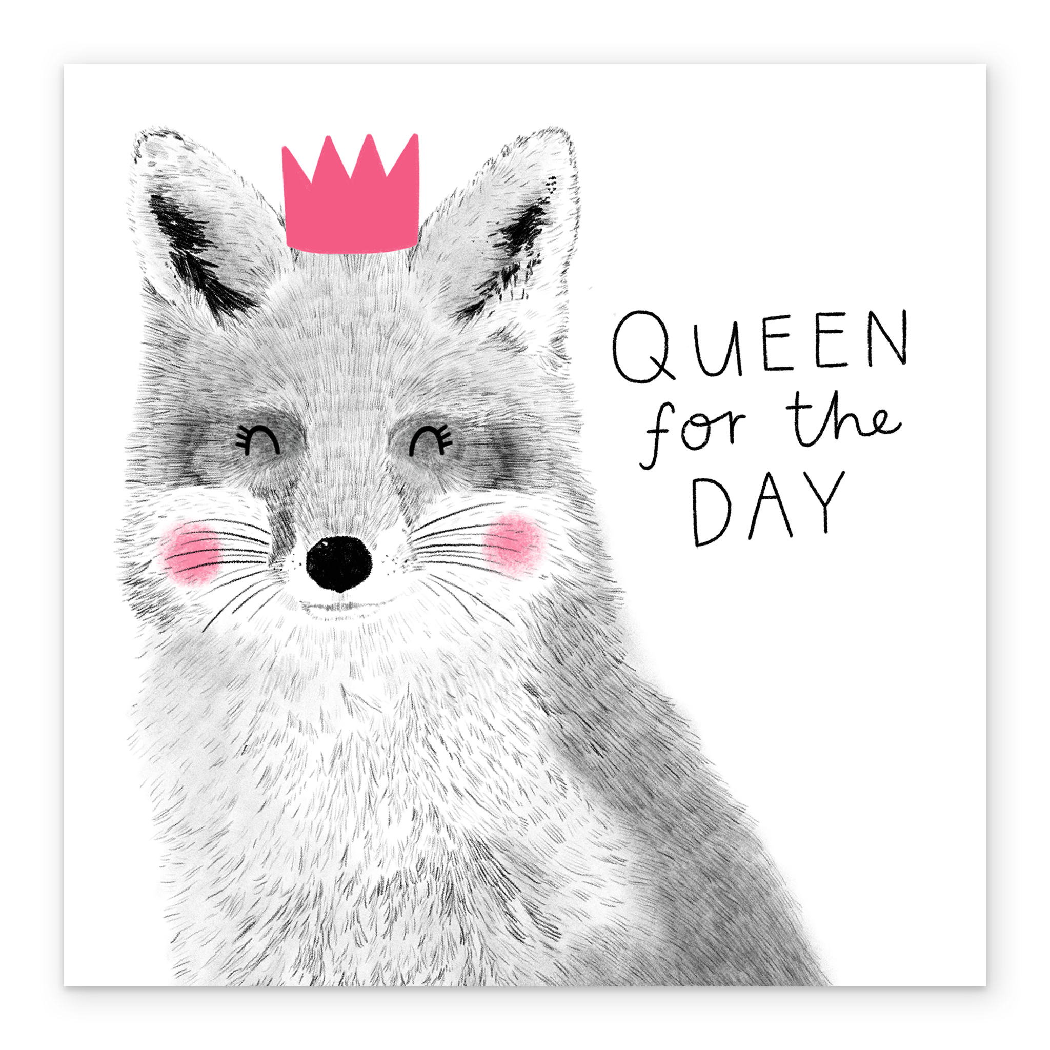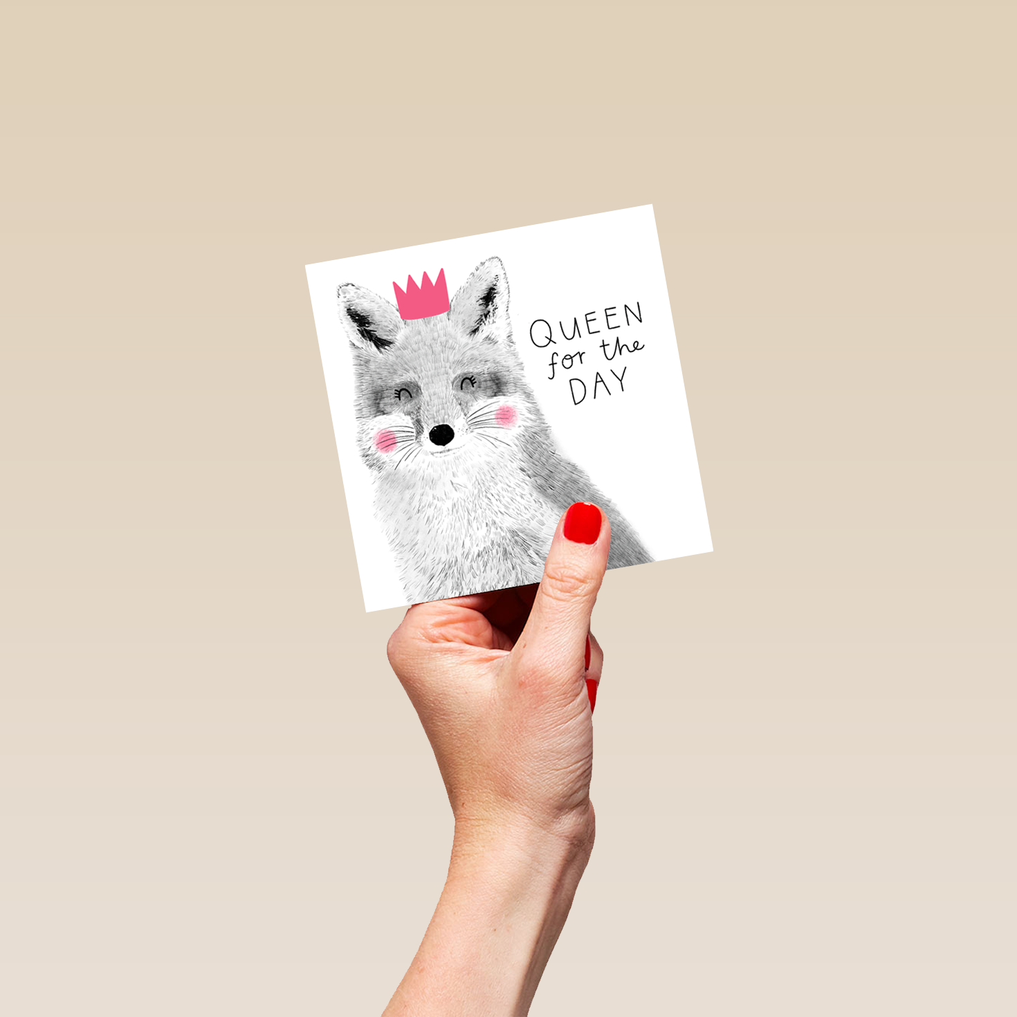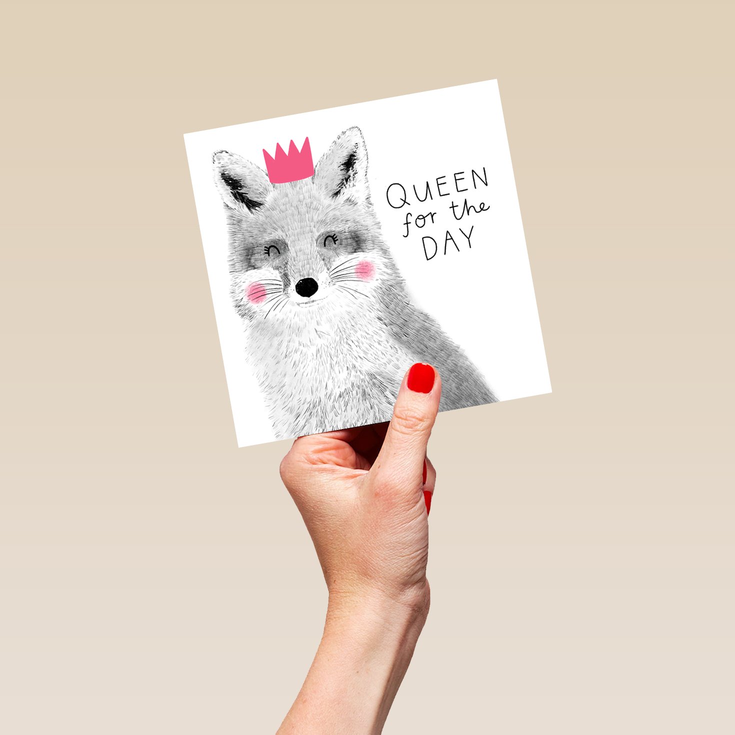 Printed on premium-quality board, this card features a cute illustration of a fox wearing a pink crown, with the message 'Queen for the day', and comes complete with a co-ordinating white envelope.
