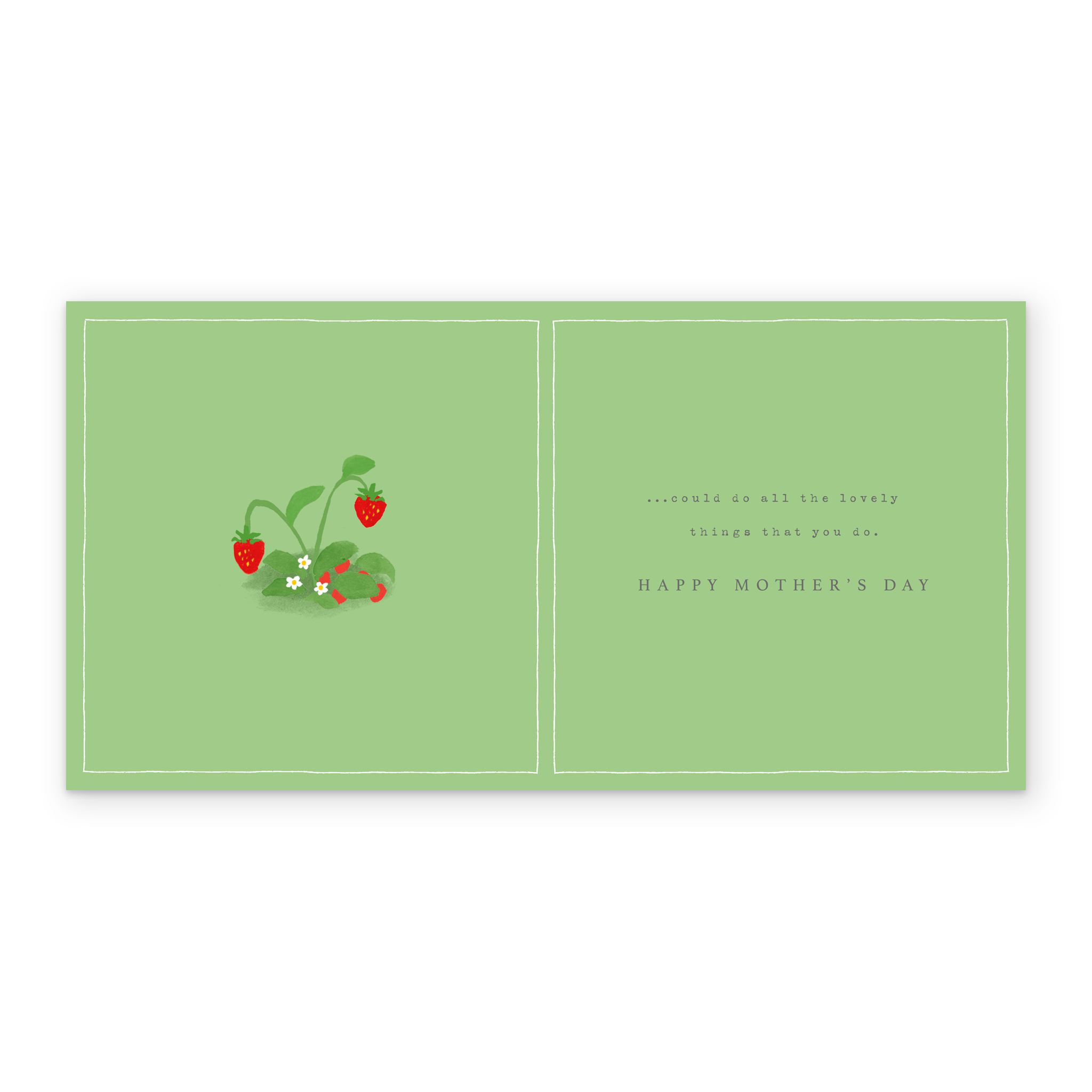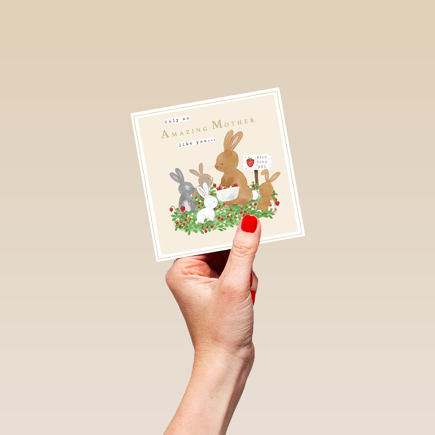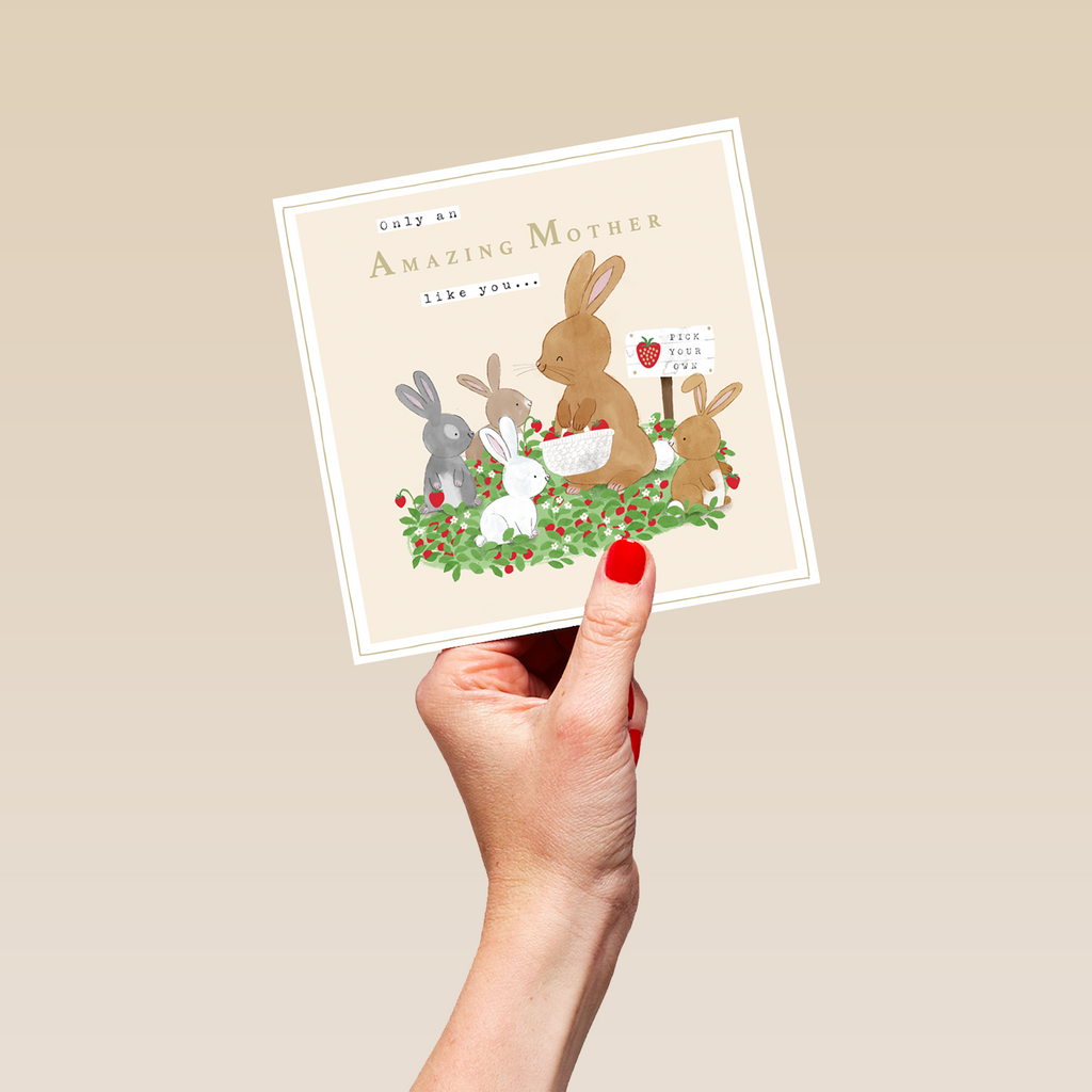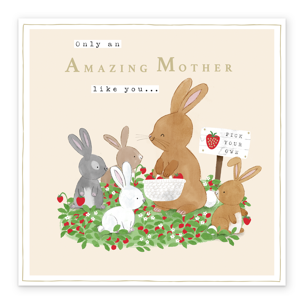 Printed on premium-quality board, this card features an adorable illustration of a Mother rabbit in a strawberry field with her baby rabbits, with the message 'Only an amazing mother like you...', and comes complete with a co-ordinating white envelope.