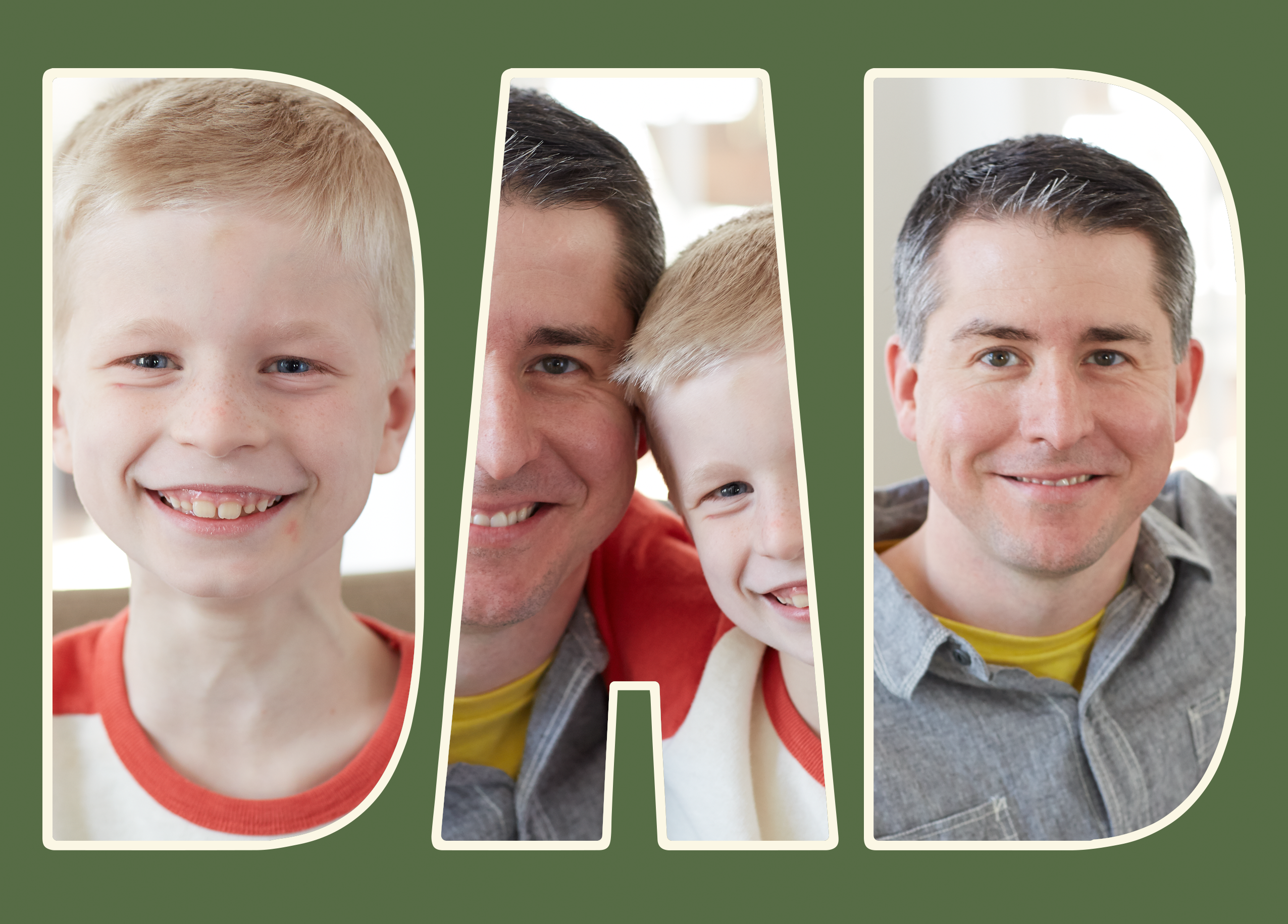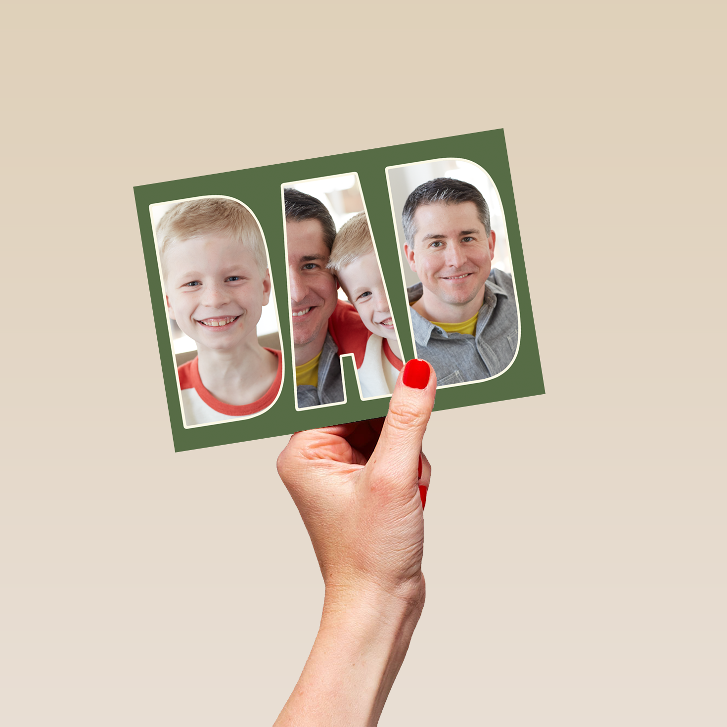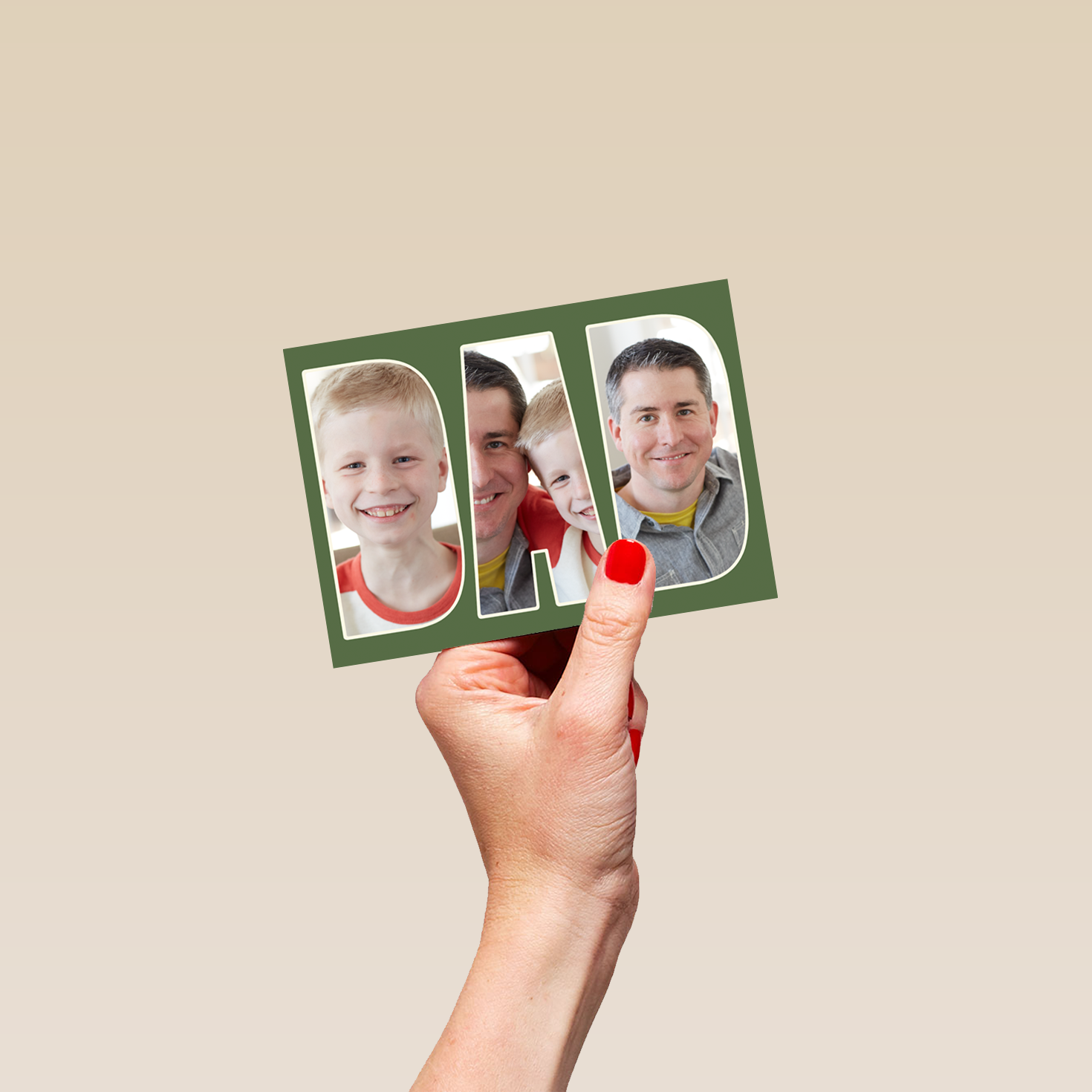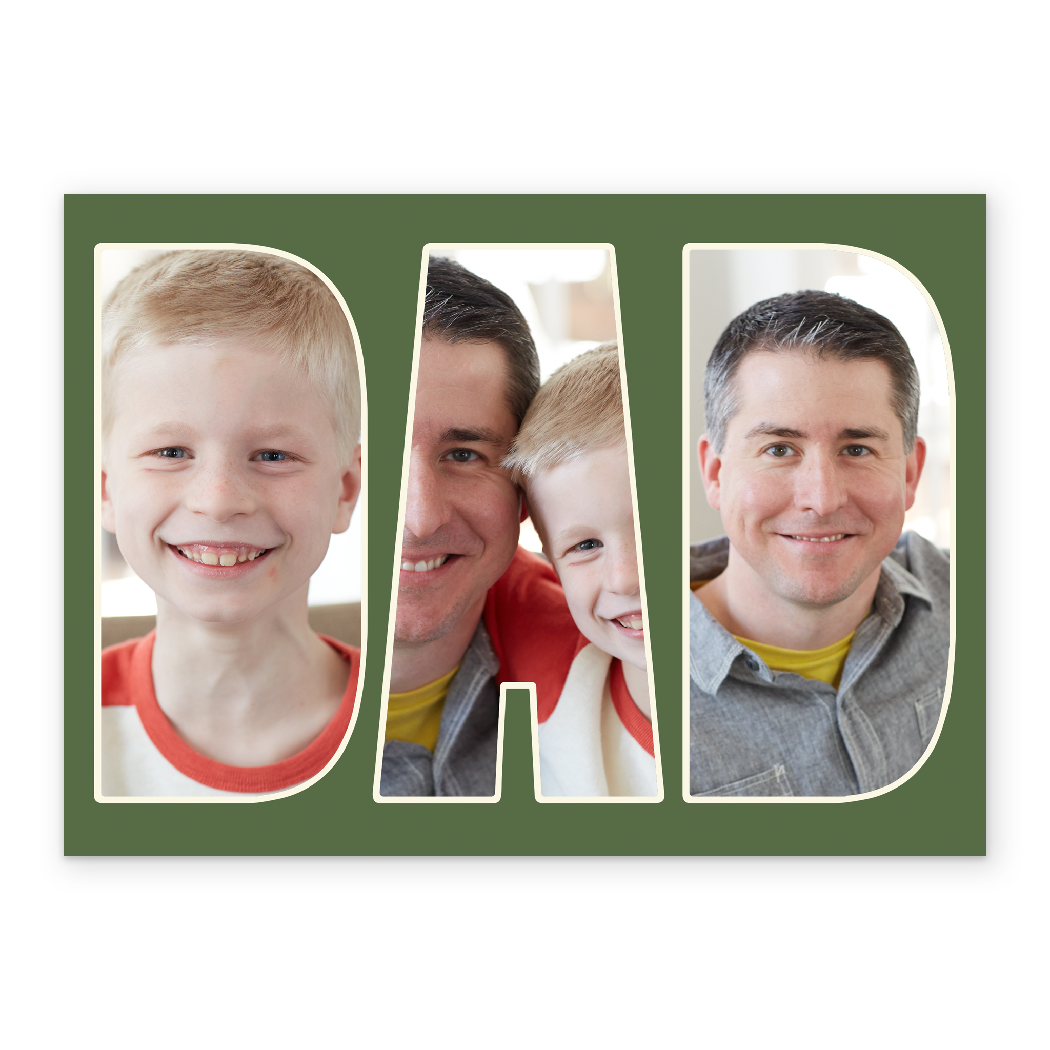 Printed on premium-quality board, this card features a green background with a 'Dad'-shaped photo upload frame, with the message 'DAD', space to upload a photo, and comes complete with a co-ordinating white envelope.