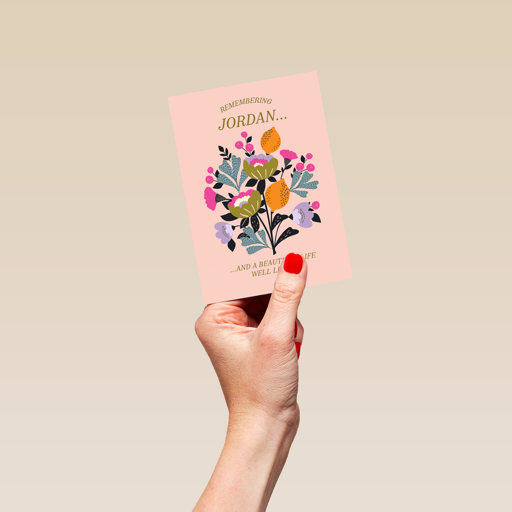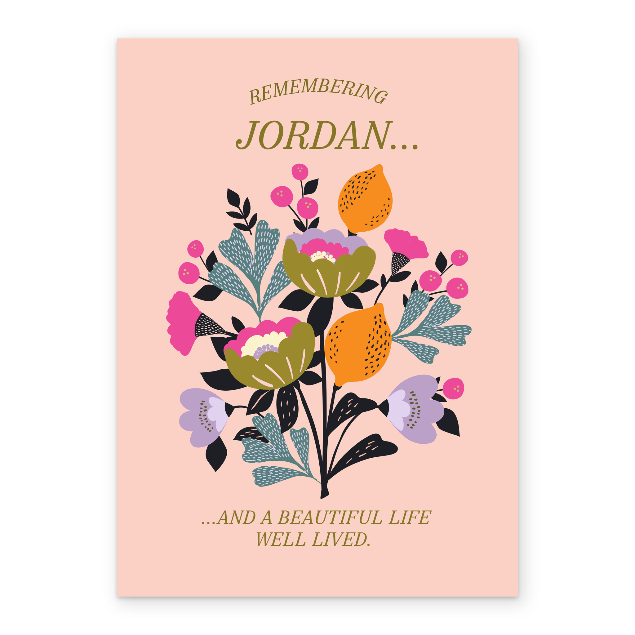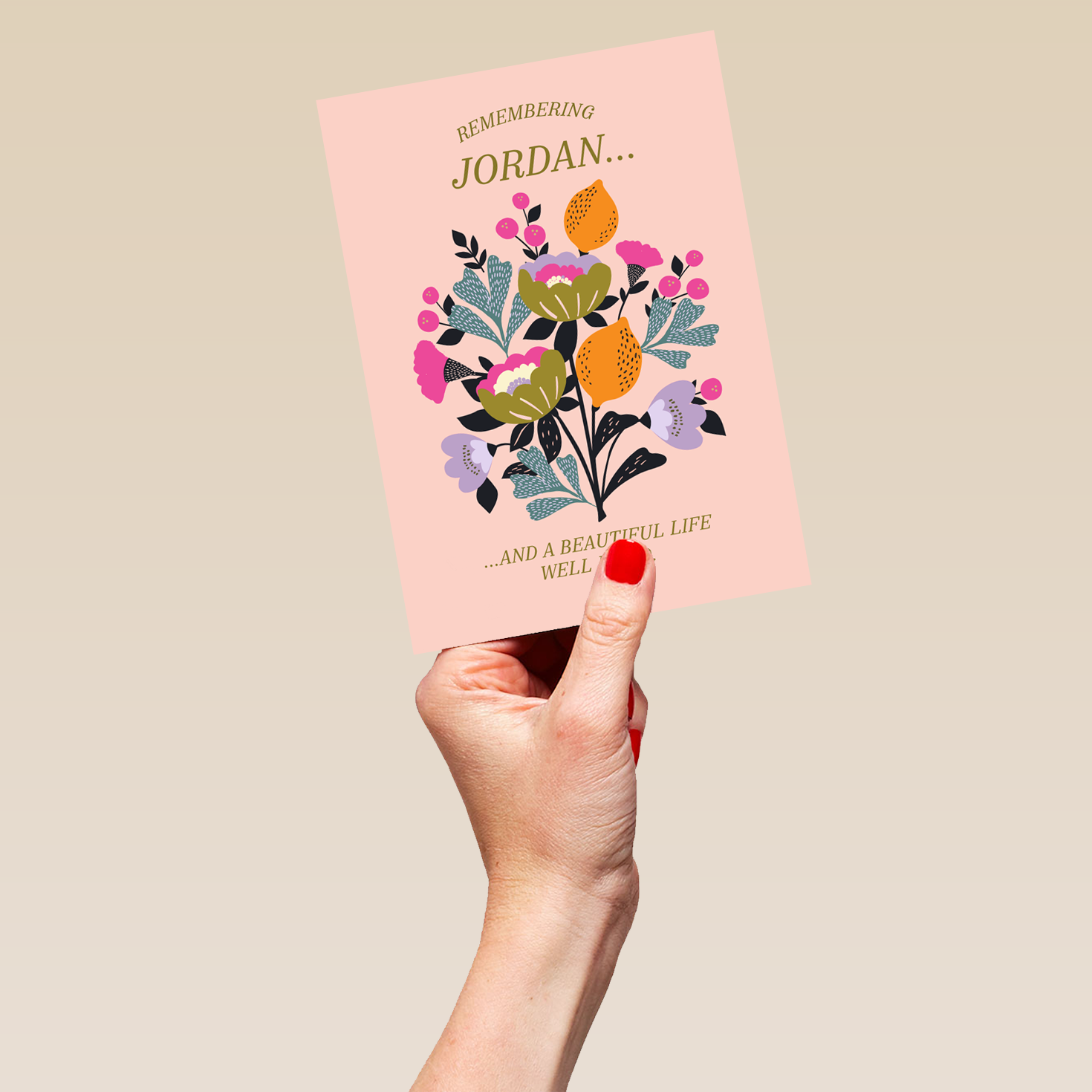 Printed on premium-quality board, this card features a modern botanical illustration, with the message 'Remembering [Name] ... and a beautiful life well lived', space to personalise a name, and comes complete with a co-ordinating white envelope.